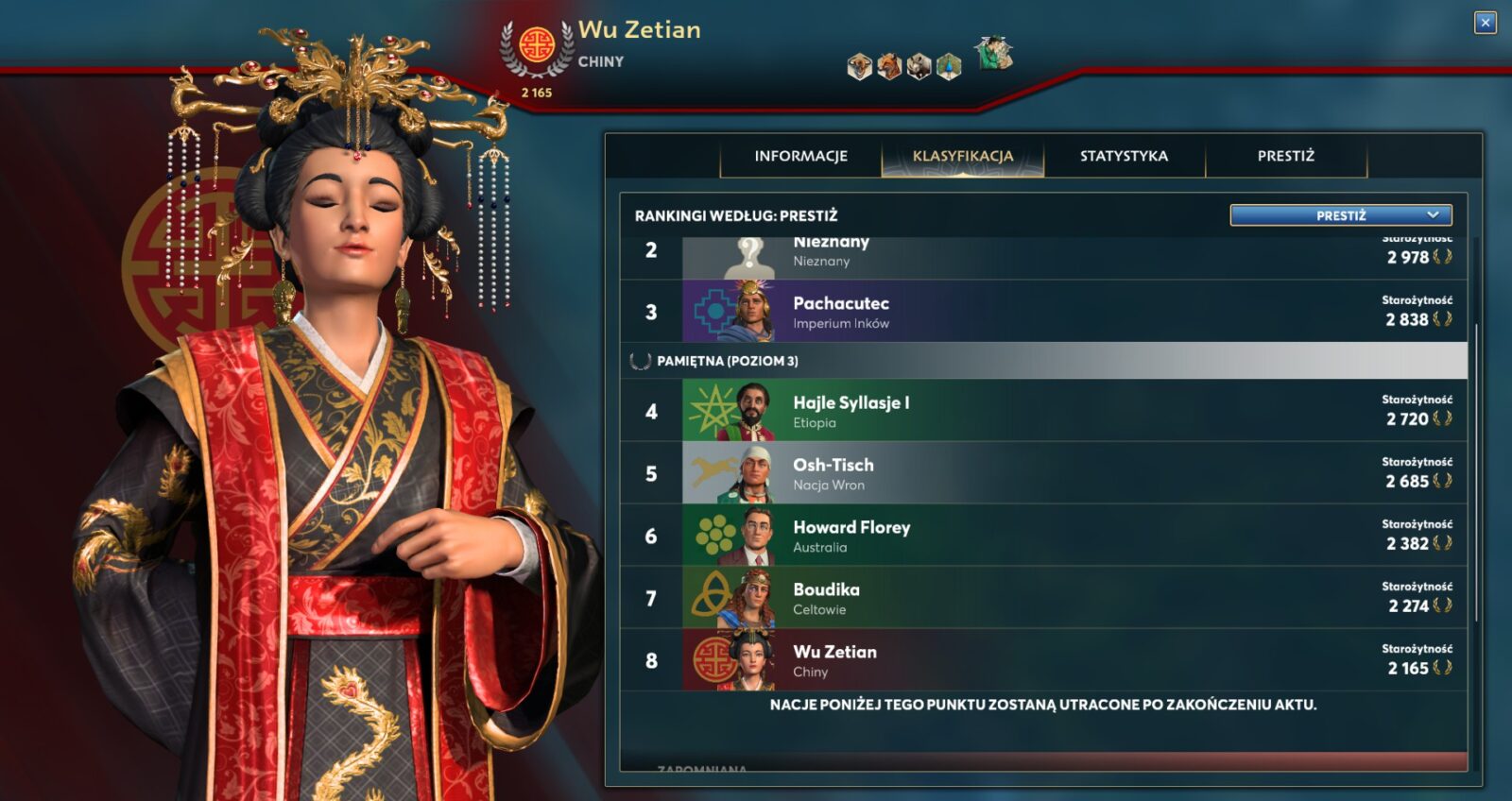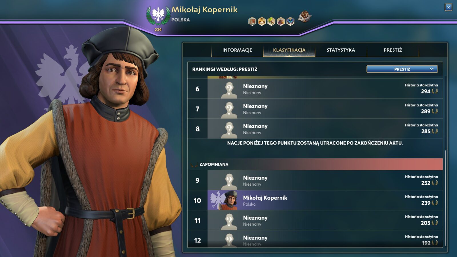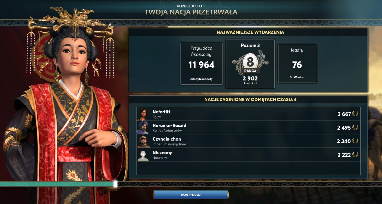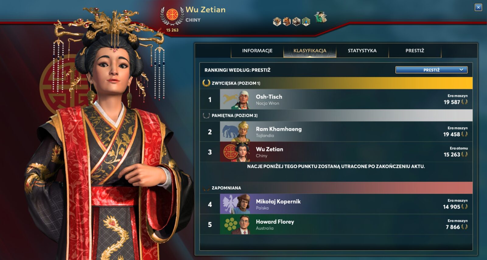 W mojej najdłuższej grze zaczynało dwanaście nacji, do finału dotarło pięć. Gra jest pod tym względem bezlitosna. Na szczęście nie musimy czekać z bijącym sercem na ogłoszenie wyników. W dowolnej chwili można sprawdzić klasyfikację, aby wiedzieć, na jakiej pozycji jesteśmy. Muszę przyznać, że to dobra motywacja.