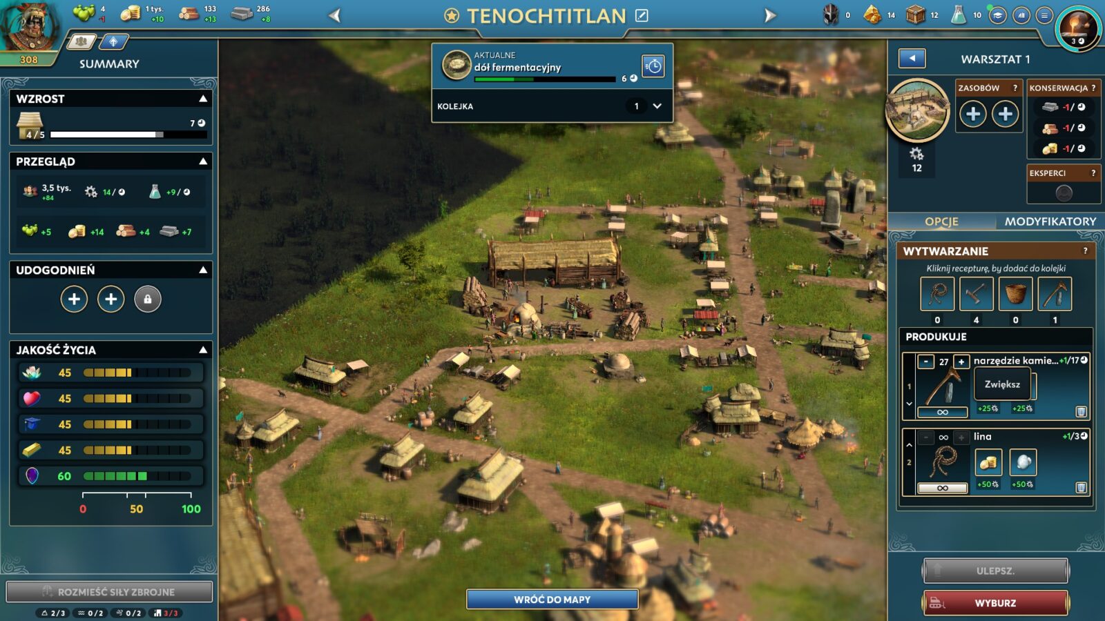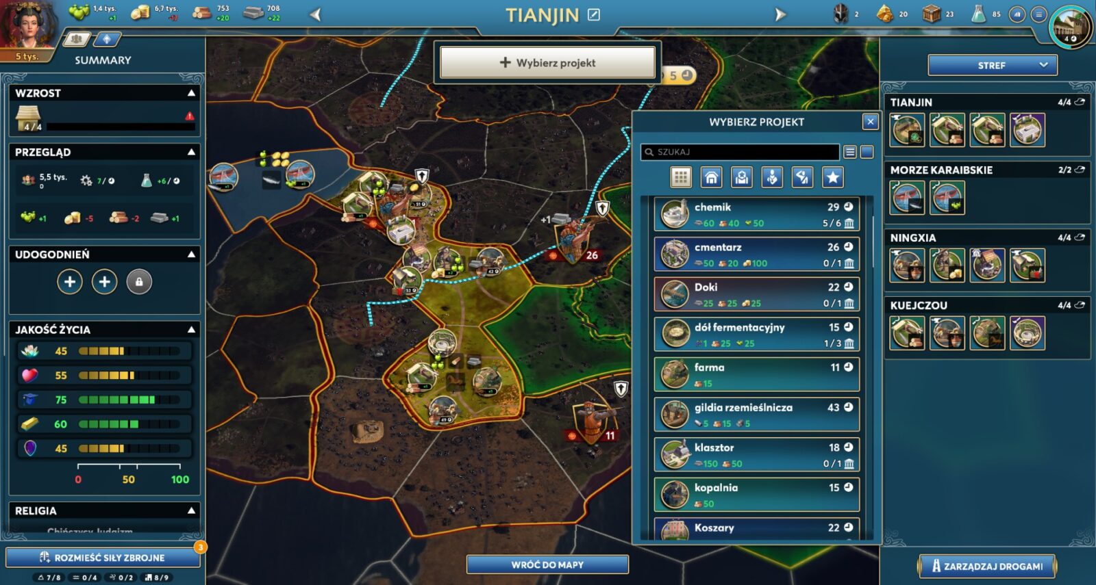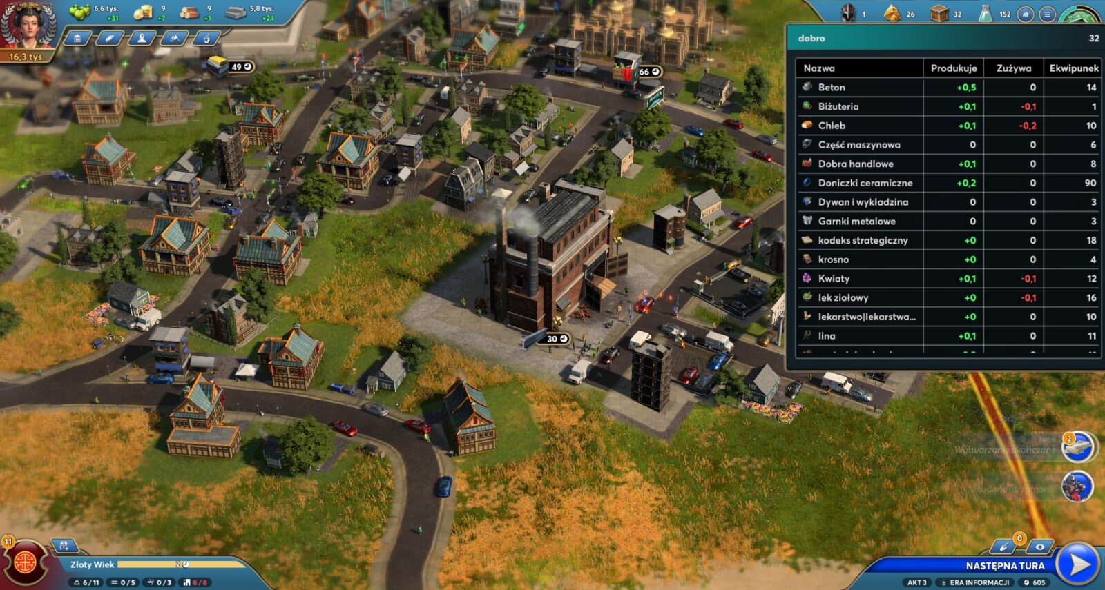 I powiem od razu otwarcie – to największy plus, jak i minus tej produkcji. Dlaczego? Zaleta jest taka, że mamy pełną kontrolę nad tym, co powstaje w naszych miastach. A wyprodukowanymi towarami możemy handlować, a także używać ich w celu wprowadzenia udogodnień w miastach. Dają one bonusy, zaś liczba dostępnych uzależniona jest od wielkości metropolii – w największych może być ich nawet dziesięć. Skąd zatem minus? Ano w dalszych częściach zabawy mamy kilkadziesiąt miejsc produkcji i musimy każde ręcznie ustawiać na produkcję. Dodajmy tez do tego fakt, że w miarę kolejnych odkryć pojawiają się nowe możliwości i sporą część gry poświęciłem na takie zarządzanie.