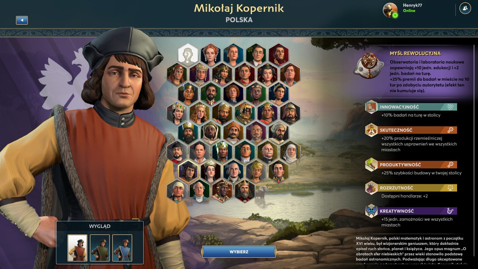 W podstawowej wersji gry mamy 41 liderów i mówiąc szczerze – nie rozumiem klucza ich doboru. O ile w przypadku wielu nacji mamy postacie, które miały faktycznie potężny wpływ na rozwój cywilizacji, jak Elżbieta I (Anglia) czy Kserkes (Persja) lub Asoka (Indie), o tyle niektóre budzą zdumienie. Zacznijmy od własnego podwórka. Zgadniesz, kto jest liderem Polski? Kazimierz Wielki? Mieszko? Może Chrobry? Nie – Mikołaj Kopernik! W przypadku Chin mamy z kolei tylko Wu Zetian – jedyną władczynię w historii. Przy Niemcach pojawia się Bismarck, ale alternatywą dla niego jest… Hildegarda z Bingen. Francja to z kolei ani Karol Wielki, ani Napoleon, a… Joanna d’Arc. Trochę to pomieszanie z poplątaniem.