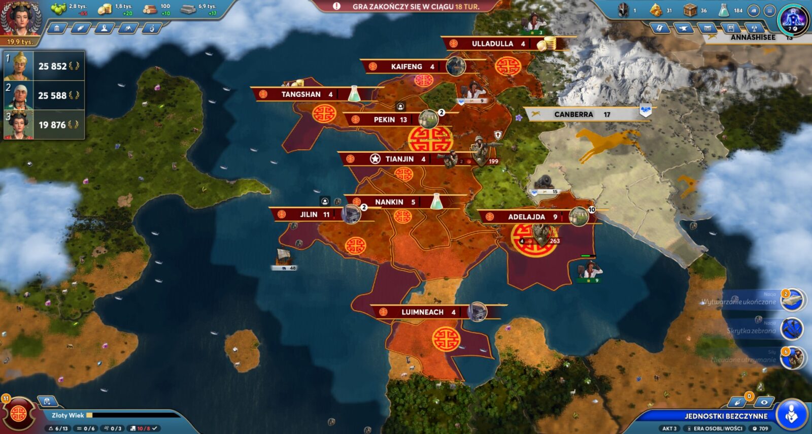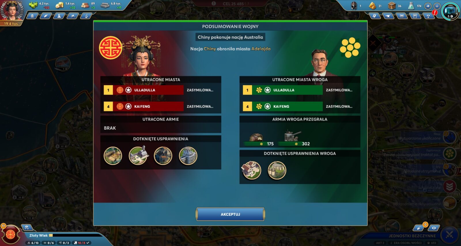 Jeśli to my atakujemy, jest to dobra sytuacja. Ale miałem wojnę z Australią, która upatrzyła sobie zdobycie mojej stolicy. I zrobiła to, gdy tylko podciągnąłem pod zdobyte miasto kolosalne siły. Niestety – nie mogłem ich użyć, ponieważ zapanował wymuszony pokój na 20 tur. Musiałem odczekać i po upływie tego czasu wypowiedzieć wojnę, a następnie w jednej rundzie odzyskałem stracone miasto. A 20 tur bez największego ośrodka badawczo-produkcyjnego to naprawdę uciążliwy hamulec.