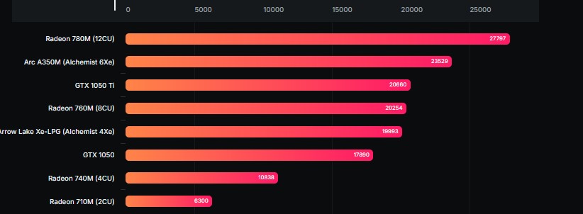Intel Arrow Lake „Alchemist Xe-LPG” iGPU uzyskał 19 993 punktów w testach OpenCL i 19 551 punktów w testach Vulkan. W testach OpenCL, Alchemist Xe-LPG iGPU ma mniej więcej taką samą wydajność jak GTX 1050 Ti i zbliża się do Radeona 760M, który ma łącznie osiem jednostek obliczeniowych. W testach Vulkan iGPU osiąga mniej więcej taką samą wydajność jak GTX 1050 Ti, ale przegrywa z RX 760M, który ma większą liczbę jednostek obliczeniowych.