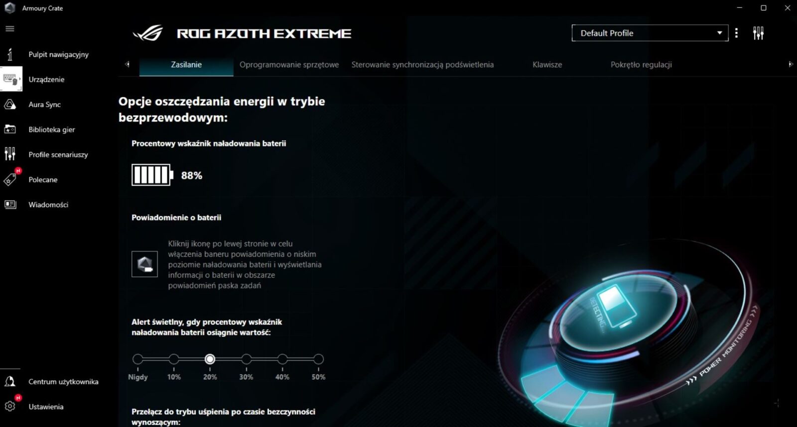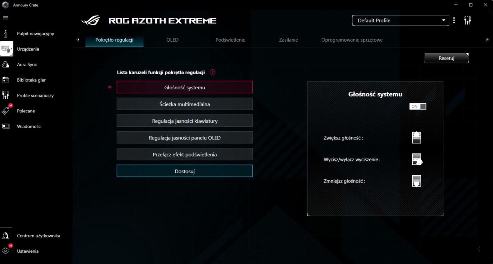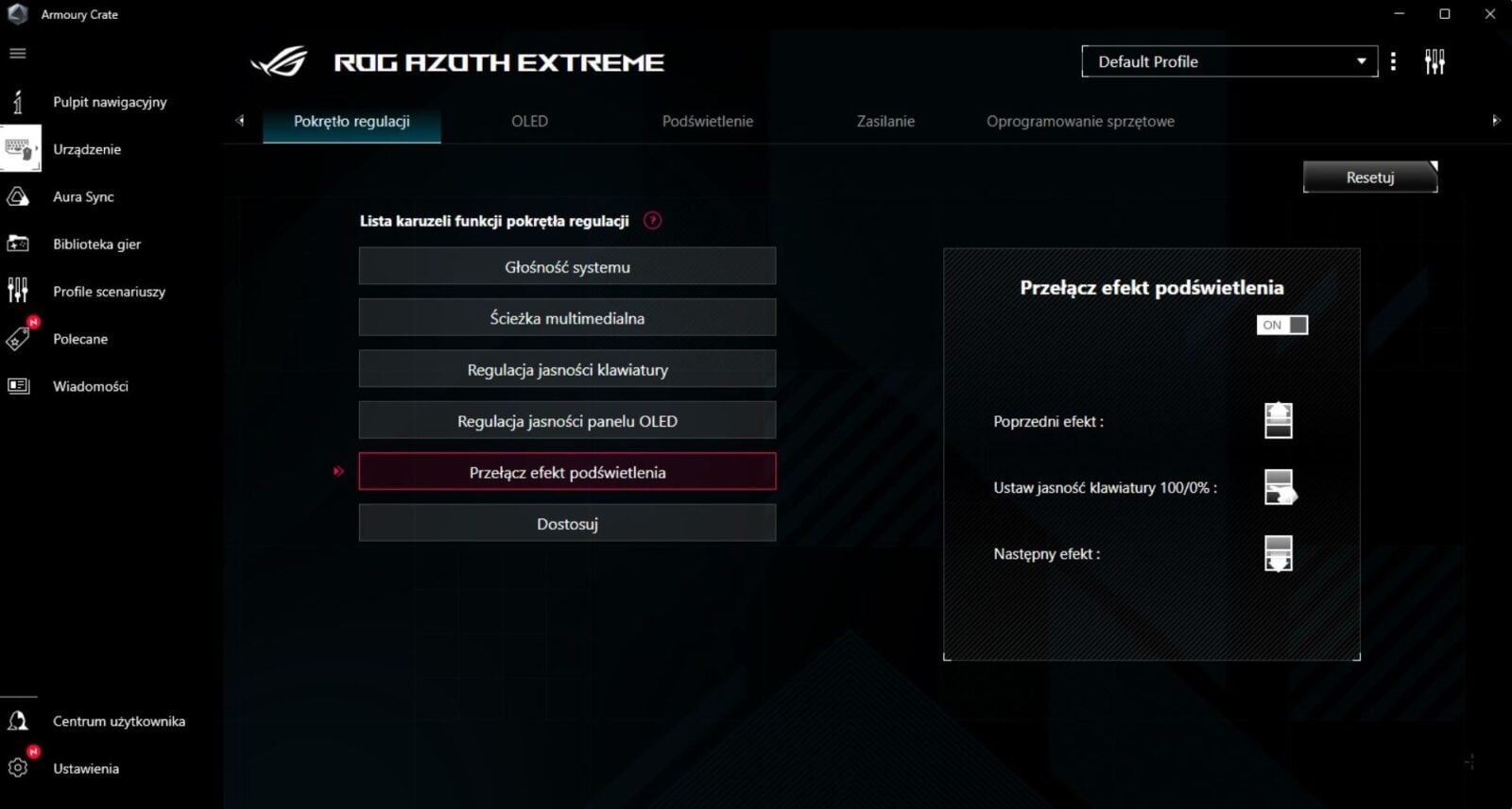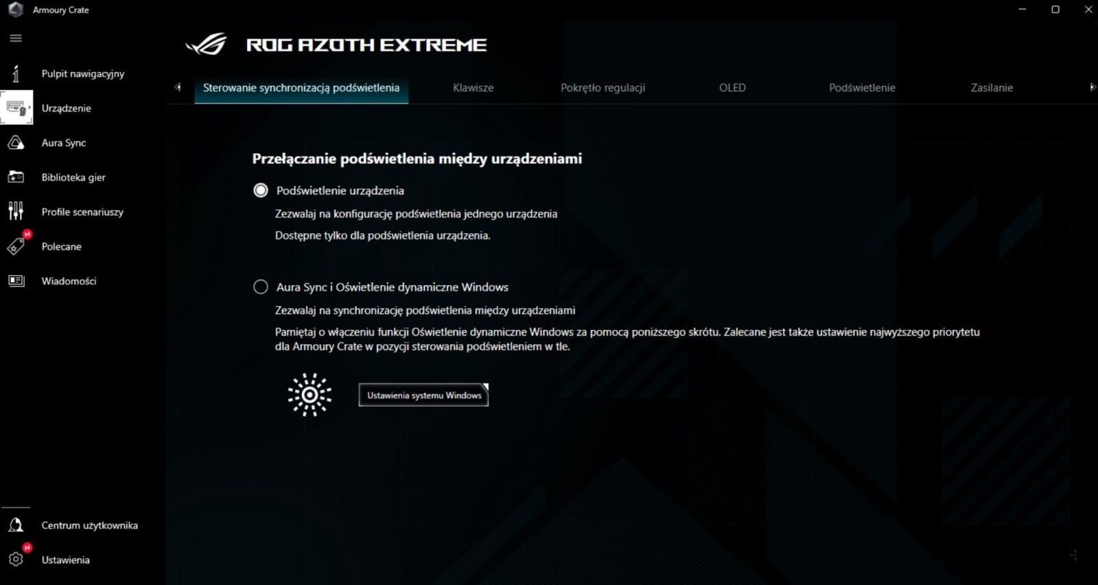 Bez aplikacji się obędziecie – tak w skrócie mogę skomentować Armoury Crate, która stanowi HUD dla wszystkich nowszych sprzętów Asusa. Producent wprowadził bowiem na pokład ROG Azoth Extreme obsługę wszystkich potrzebnych funkcji, wliczając w to makra, ale jeśli chcecie zagłębić się w dokładniejsze ustawienia klawiatury, to w oprogramowaniu spędzicie nieco czasu, dostosowując czy to efekty podświetlenia (o obsłudze Aura Sync zapewne nie muszę wspominać), funkcjonalność ekranu OLED i pokrętła, czy funkcje klawiszy. Warto też wspomnieć, że radiowy odbiornik na USB-A można zaprogramować, aby obsługiwał nie tylko samą klawiaturę, ale też kompatybilną mysz.