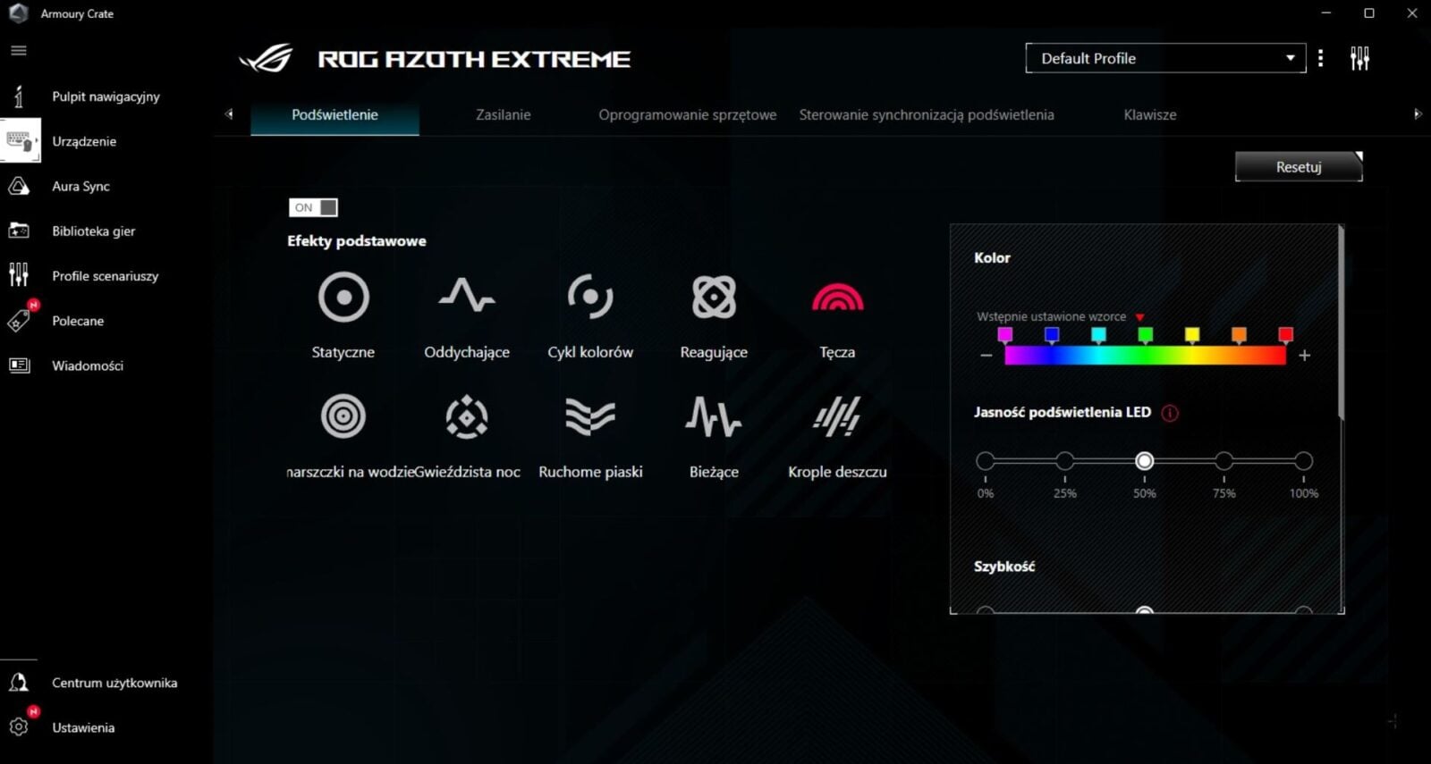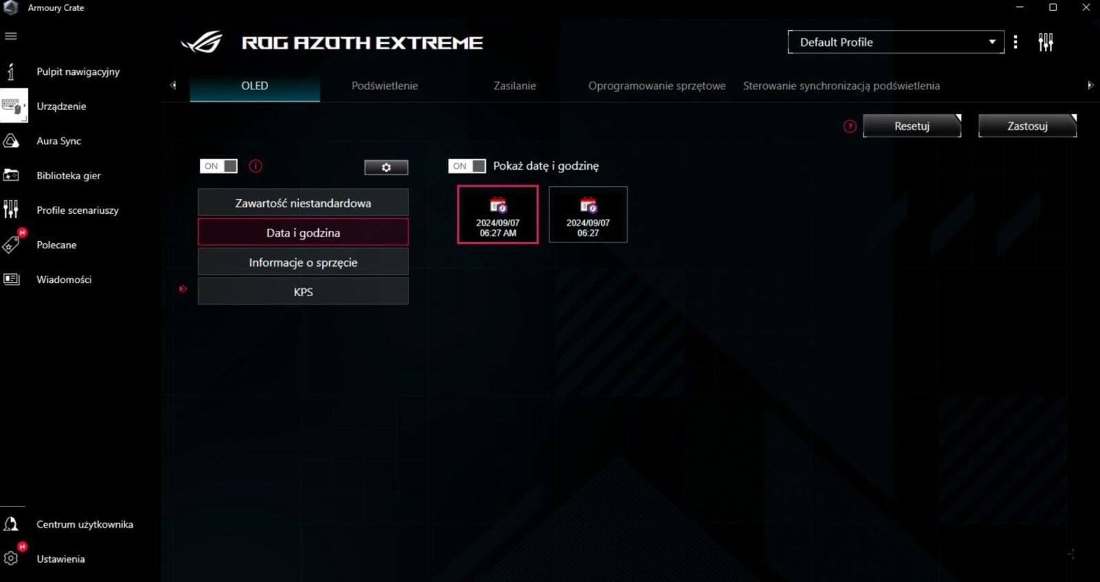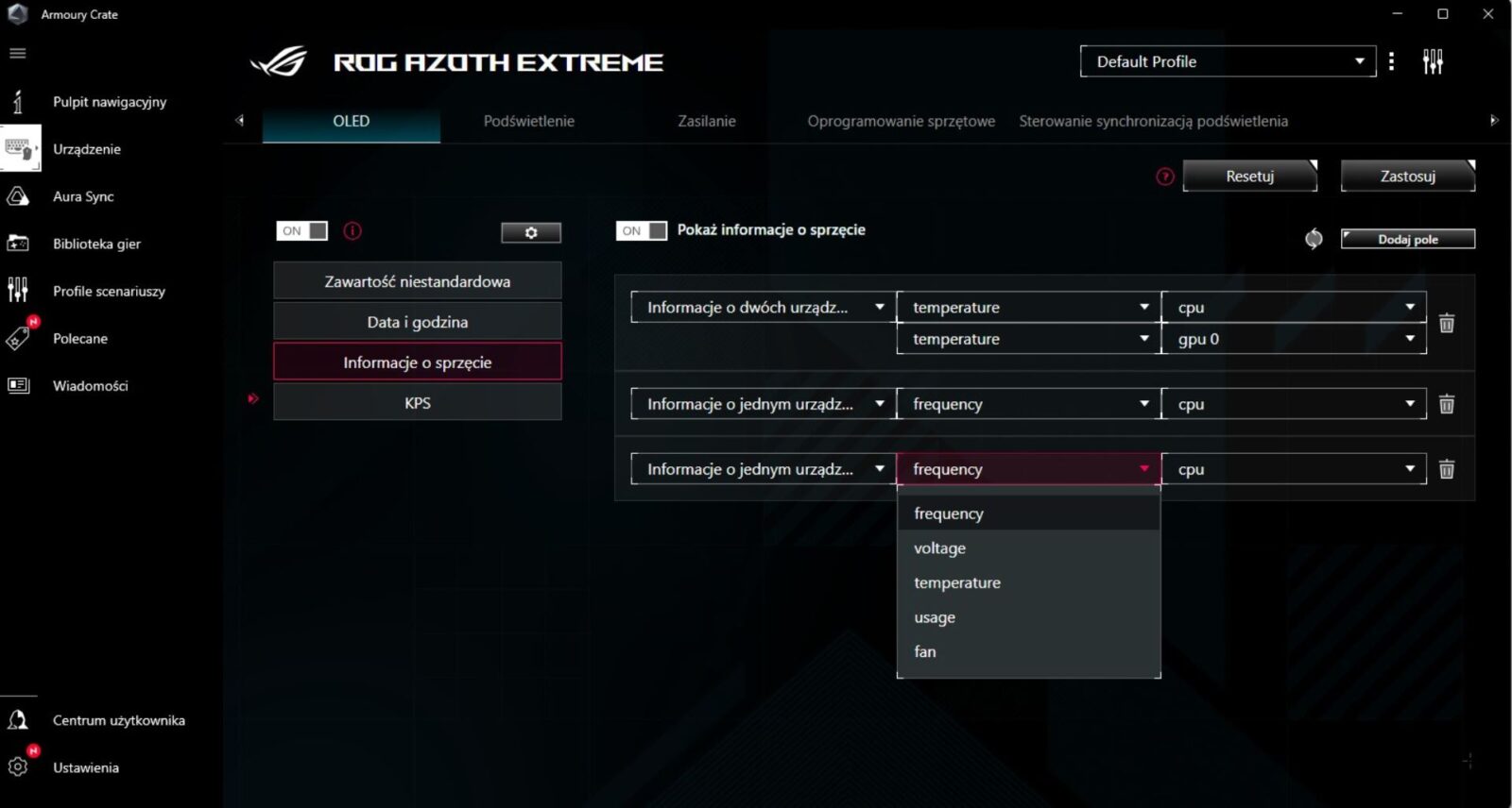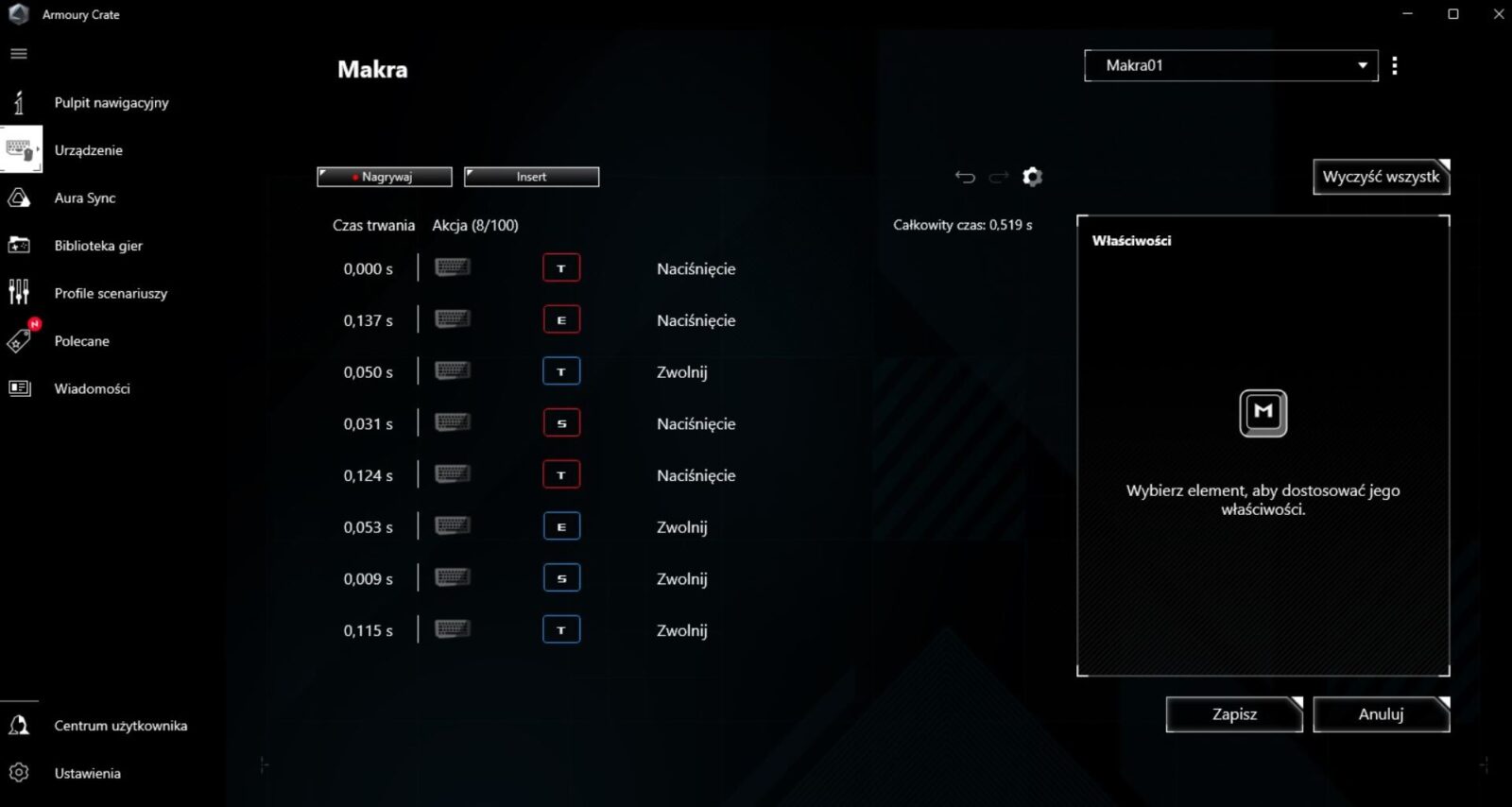 Bez aplikacji się obędziecie – tak w skrócie mogę skomentować Armoury Crate, która stanowi HUD dla wszystkich nowszych sprzętów Asusa. Producent wprowadził bowiem na pokład ROG Azoth Extreme obsługę wszystkich potrzebnych funkcji, wliczając w to makra, ale jeśli chcecie zagłębić się w dokładniejsze ustawienia klawiatury, to w oprogramowaniu spędzicie nieco czasu, dostosowując czy to efekty podświetlenia (o obsłudze Aura Sync zapewne nie muszę wspominać), funkcjonalność ekranu OLED i pokrętła, czy funkcje klawiszy. Warto też wspomnieć, że radiowy odbiornik na USB-A można zaprogramować, aby obsługiwał nie tylko samą klawiaturę, ale też kompatybilną mysz.