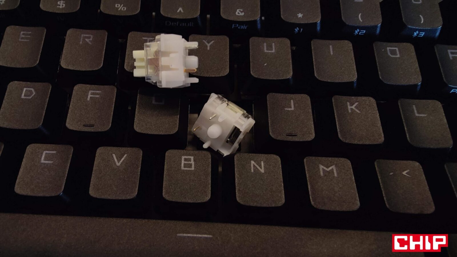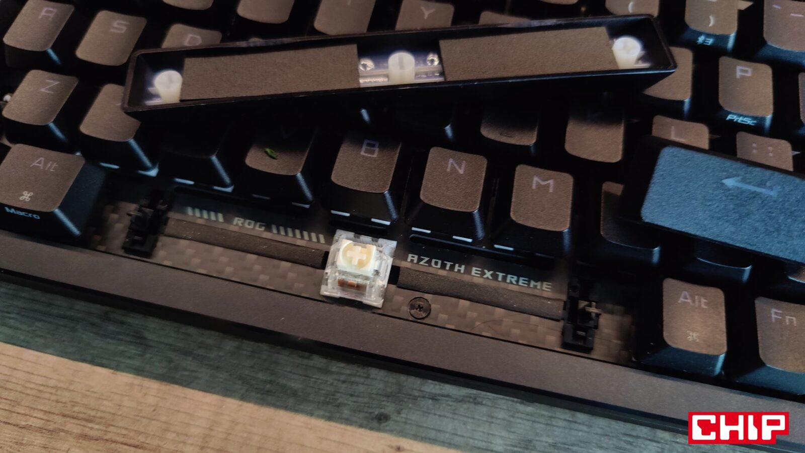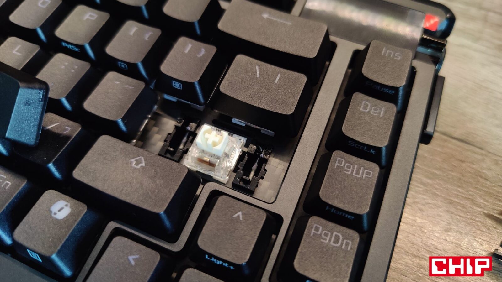 Asus ROG Azoth Extreme nie ograniczy was co do wyboru przełączników, bo klawiatura wspiera w pełni technologię Hot-Swap, a jest sprzedawana w wersji z liniowymi przełącznikami Snow i “klikającymi” Storm. Sam miałem okazję sprawdzić te pierwsze, które aktywują się i resetują na poziomie 1,8 mm, wymagają 40 gramów siły do ich ruszenia i 45 gramów do aktywacji, a wyróżniają się obecnością kwadratowej zabudowy wokół tradycyjnego krzyżaka, która to dodatkowo stabilizuje keycapa.
