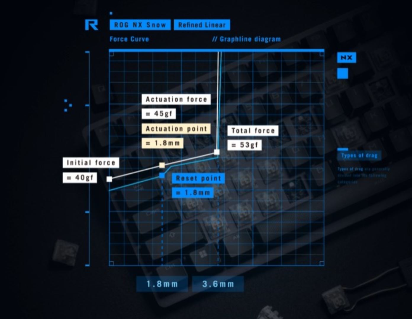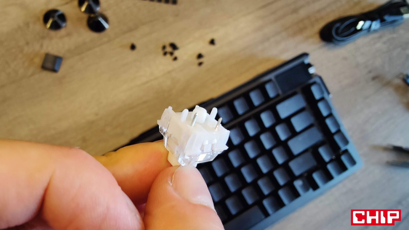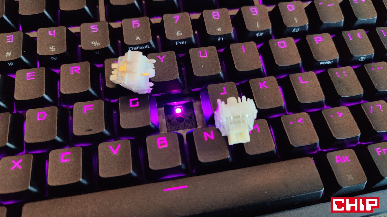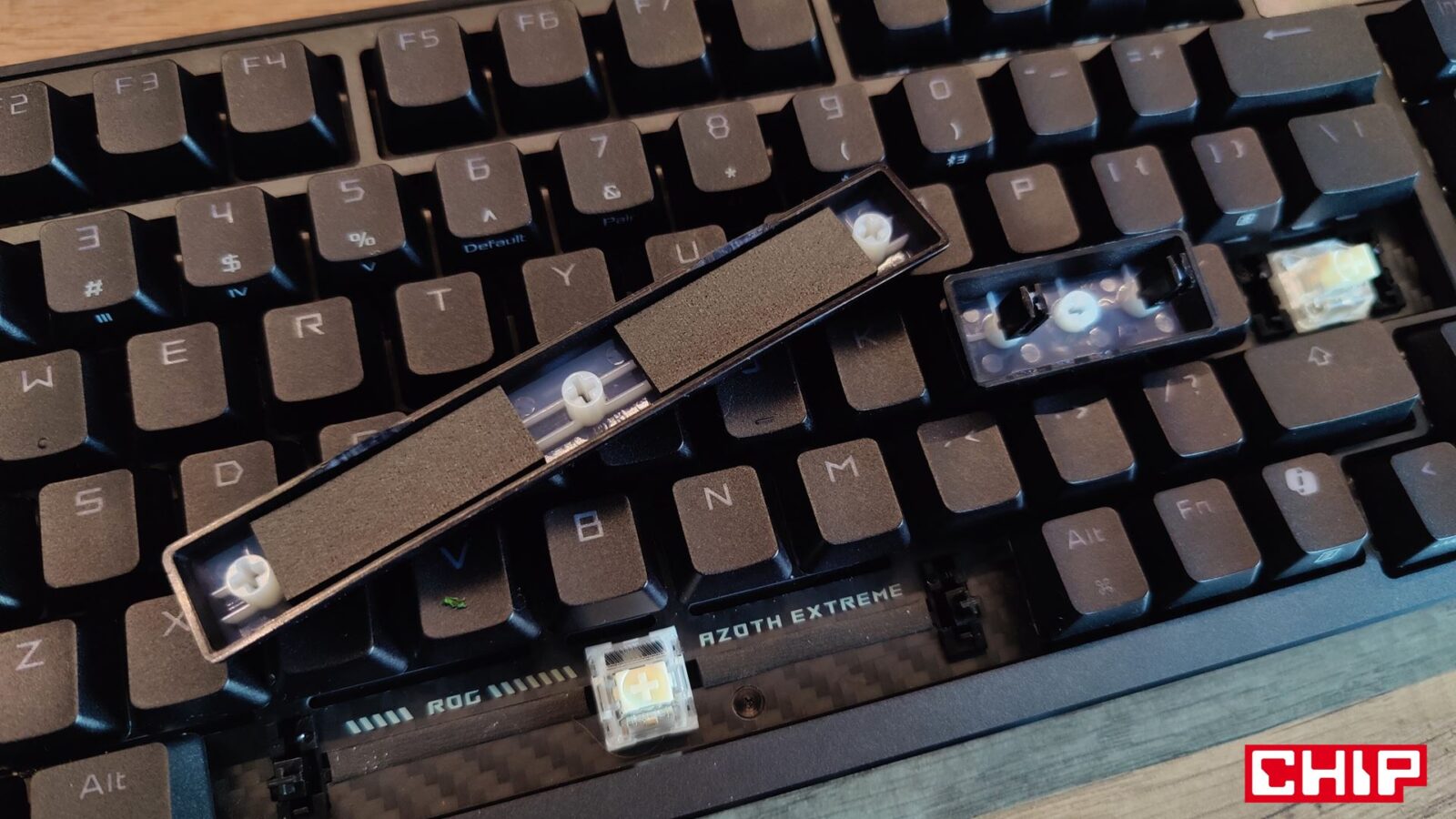 Asus ROG Azoth Extreme nie ograniczy was co do wyboru przełączników, bo klawiatura wspiera w pełni technologię Hot-Swap, a jest sprzedawana w wersji z liniowymi przełącznikami Snow i “klikającymi” Storm. Sam miałem okazję sprawdzić te pierwsze, które aktywują się i resetują na poziomie 1,8 mm, wymagają 40 gramów siły do ich ruszenia i 45 gramów do aktywacji, a wyróżniają się obecnością kwadratowej zabudowy wokół tradycyjnego krzyżaka, która to dodatkowo stabilizuje keycapa.