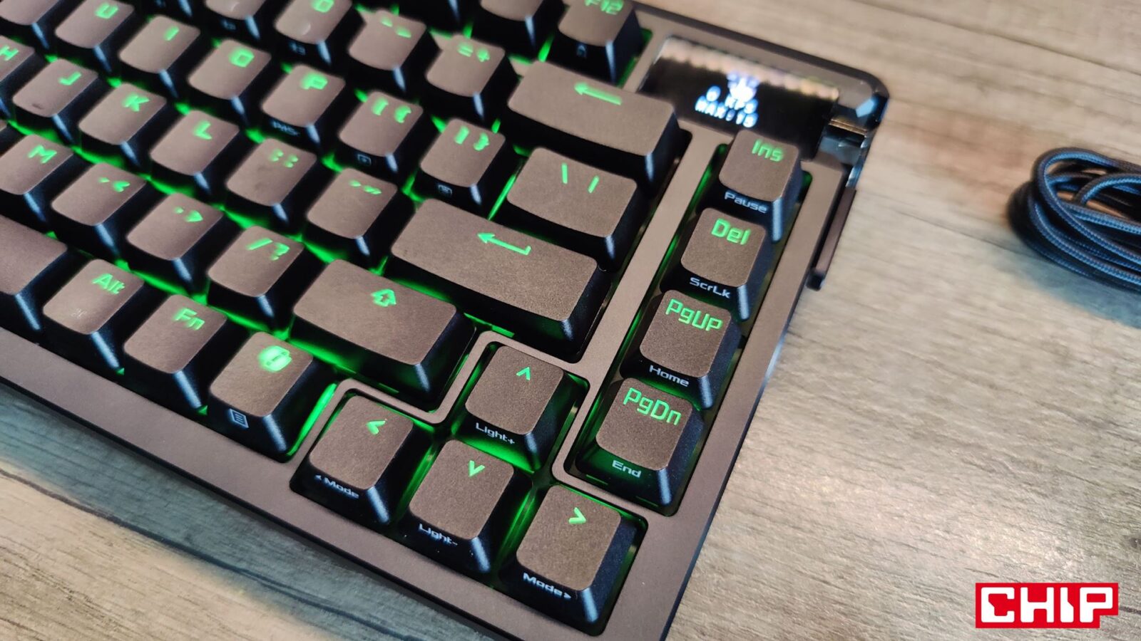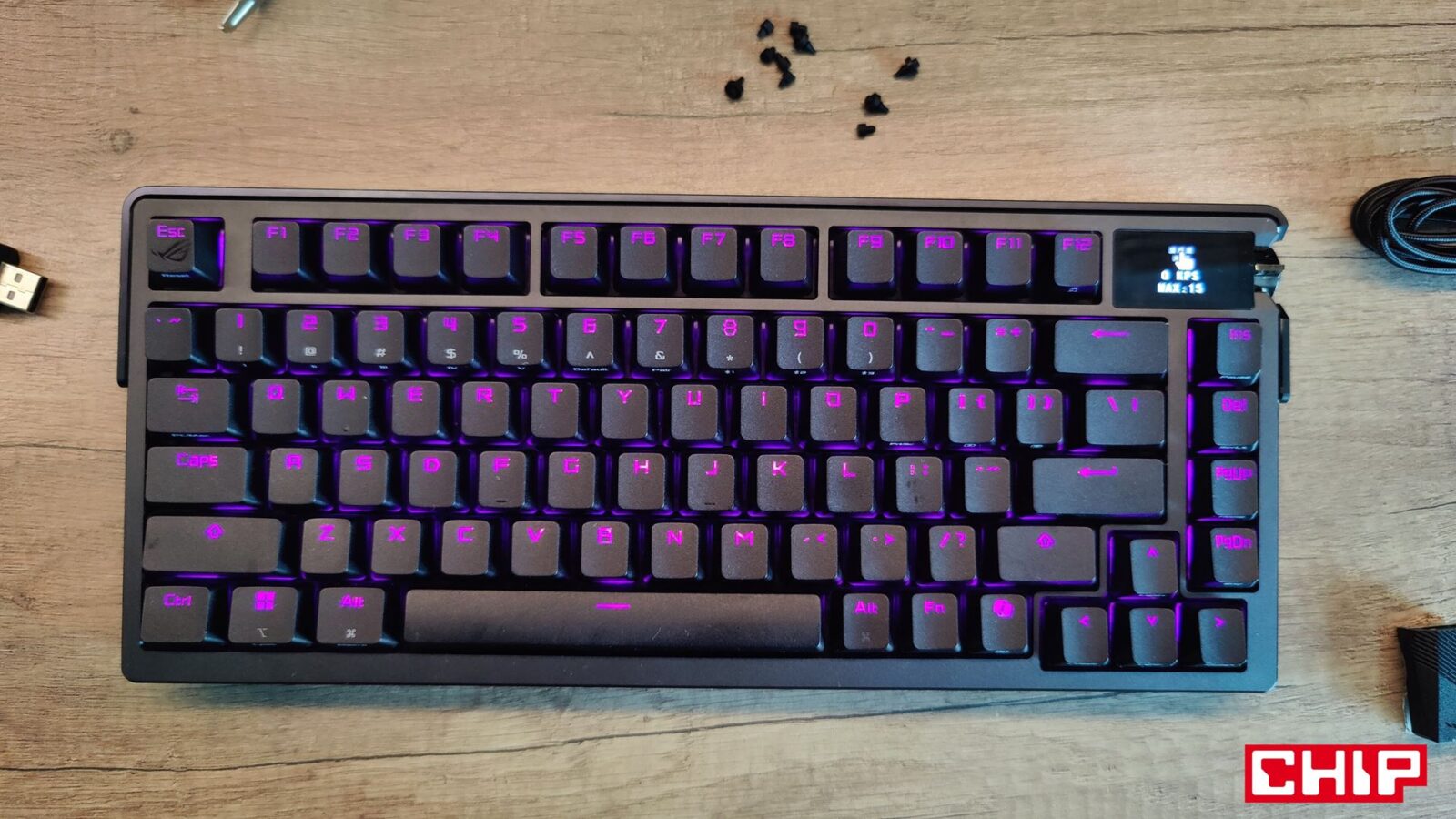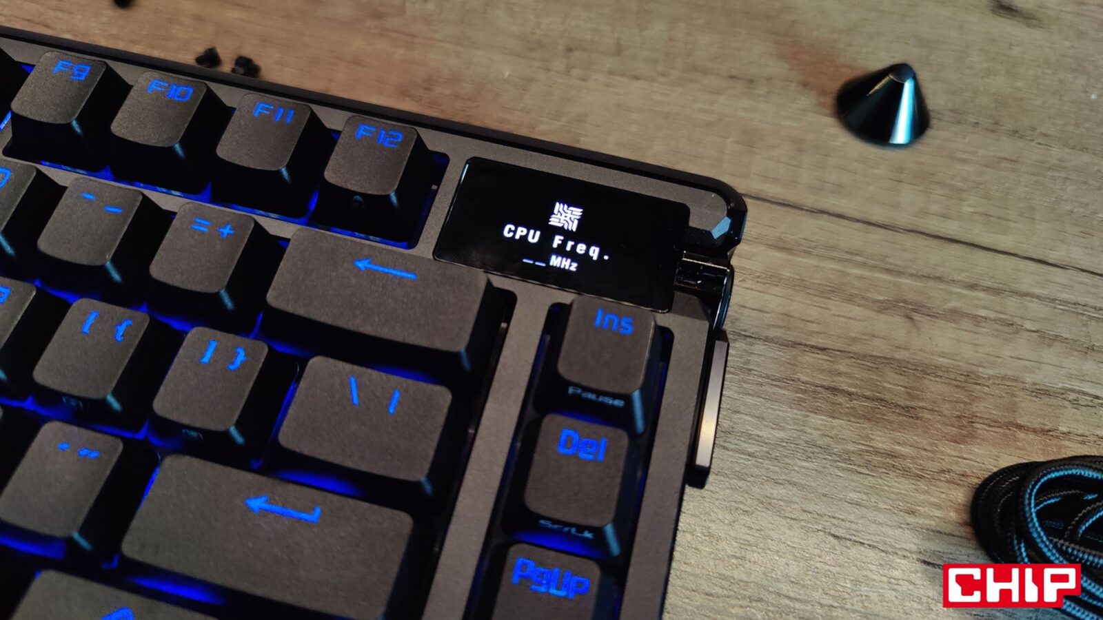 Na sam koniec zostawiłem coś, co ewidentnie dorzuca do ceny ROG Azoth Extreme kilka stówek. Mowa o dotykowym i kolorowym panelu OLED o średnicy 1,47 cala, który oprócz ładnego wyglądu, pełni też funkcję “centrum dowodzenia” klawiaturą w codziennych zastosowaniach. Jego HUD wyświetla stan podłączonego urządzenia w myśl aktualnego trybu łączności, platformy (PC/Mac) poziomu naładowania akumulatora, aktywnego caps- i scroll-locka wybranego profilu oraz aktualnie wybraną funkcję pobliskiego 3-stopniowego pokrętła. Tło tych informacji stanowi predefiniowana lub ustawiona przez nas animowana grafika, informacje na temat prędkości pisania (KPS) lub stanu komputera pokroju aktualnej temperatury GPU lub CPU (do określenia w ustawieniach).