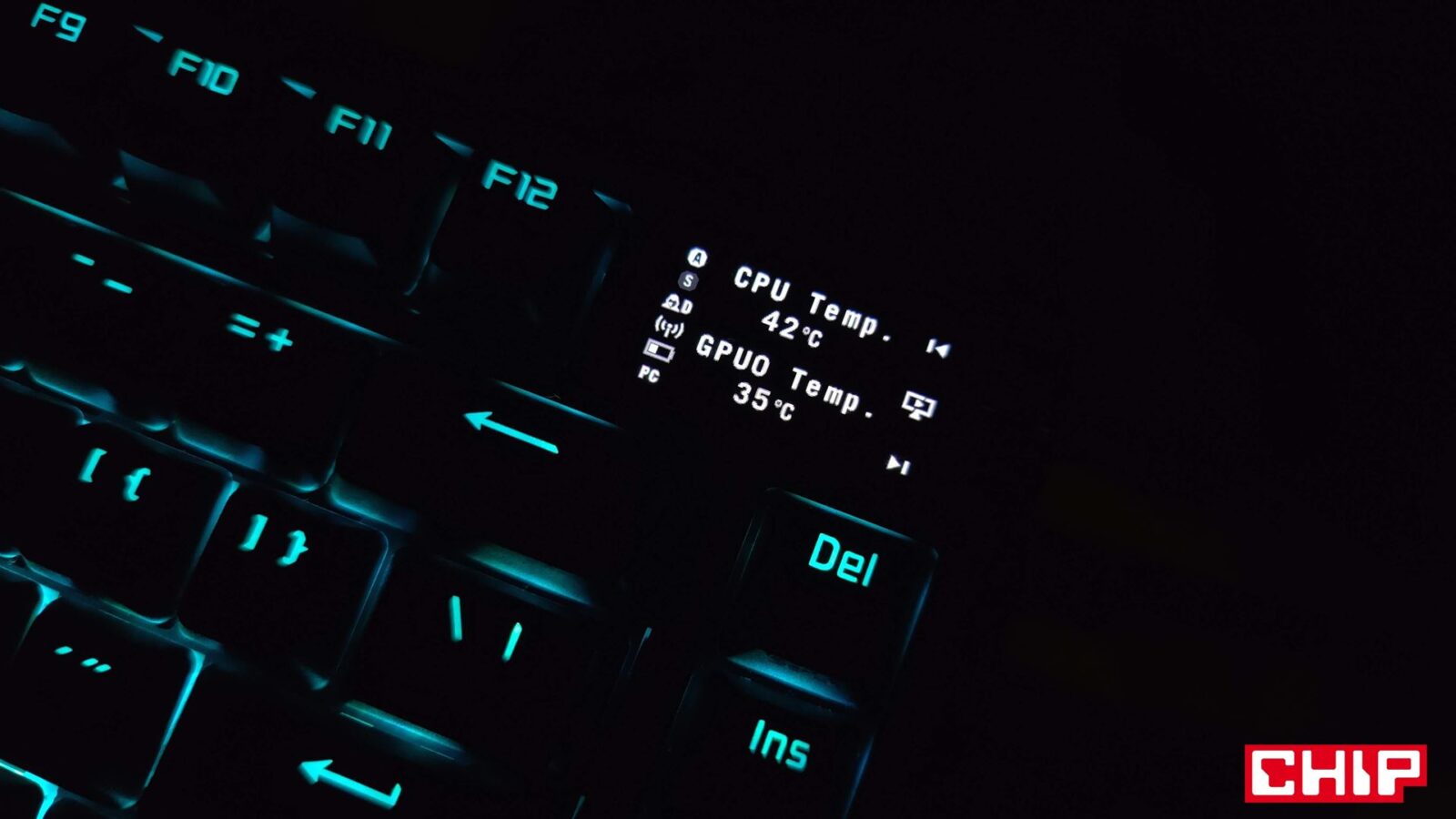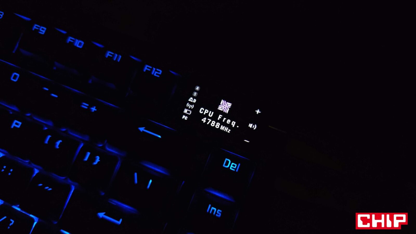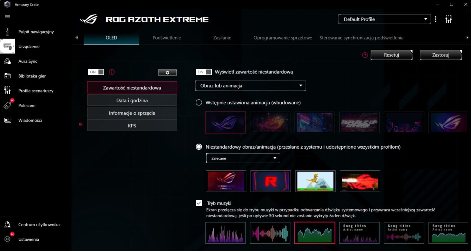 Na sam koniec zostawiłem coś, co ewidentnie dorzuca do ceny ROG Azoth Extreme kilka stówek. Mowa o dotykowym i kolorowym panelu OLED o średnicy 1,47 cala, który oprócz ładnego wyglądu, pełni też funkcję “centrum dowodzenia” klawiaturą w codziennych zastosowaniach. Jego HUD wyświetla stan podłączonego urządzenia w myśl aktualnego trybu łączności, platformy (PC/Mac) poziomu naładowania akumulatora, aktywnego caps- i scroll-locka wybranego profilu oraz aktualnie wybraną funkcję pobliskiego 3-stopniowego pokrętła. Tło tych informacji stanowi predefiniowana lub ustawiona przez nas animowana grafika, informacje na temat prędkości pisania (KPS) lub stanu komputera pokroju aktualnej temperatury GPU lub CPU (do określenia w ustawieniach).