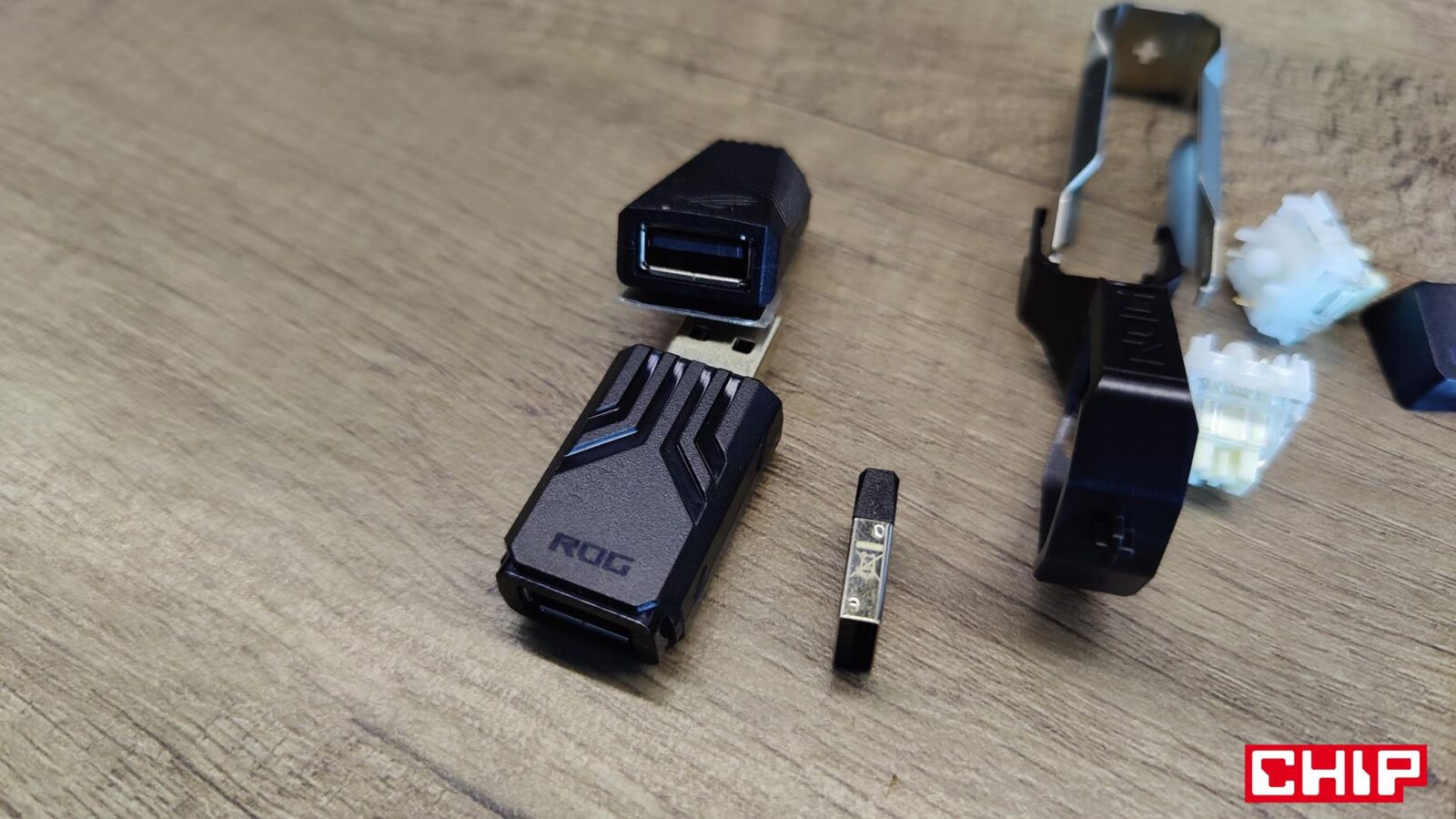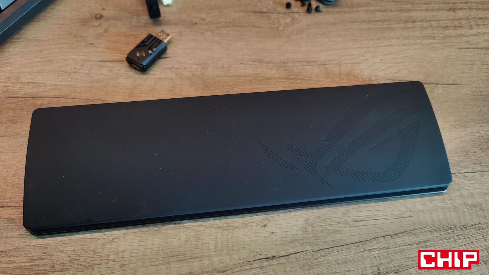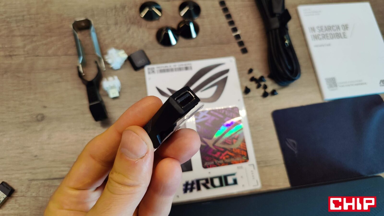 W praktyce jedyne, co musicie wyjąć z pudełka razem z klawiaturą, to wypolerowaną odznakę, która ląduje od razu na spodnią część klawiatury, najlepiej spisujące się nóżki magnetyczne, przewód, odbiornik radiowy i podkładkę, a w razie chęci uzyskania wyższego odświeżania, wpiąć również ROG Pooling Rate Booster do laptopa lub komputera. Wtedy musicie pamiętać, żeby wpinać przewód lub odbiornik USB właśnie do tego gadżetu, aby podbić odświeżanie z 1000 do 8000 Hz. Czy warto? Za coś przecież zapłaciliście, ale nie liczcie na to, że nagle będziecie pisać szybciej. O ile w przypadku myszek ten wzrost odświeżania ma sens, tak w kwestii klawiatur mam co do tego ogromne wątpliwości.