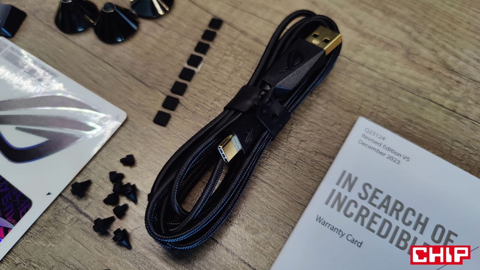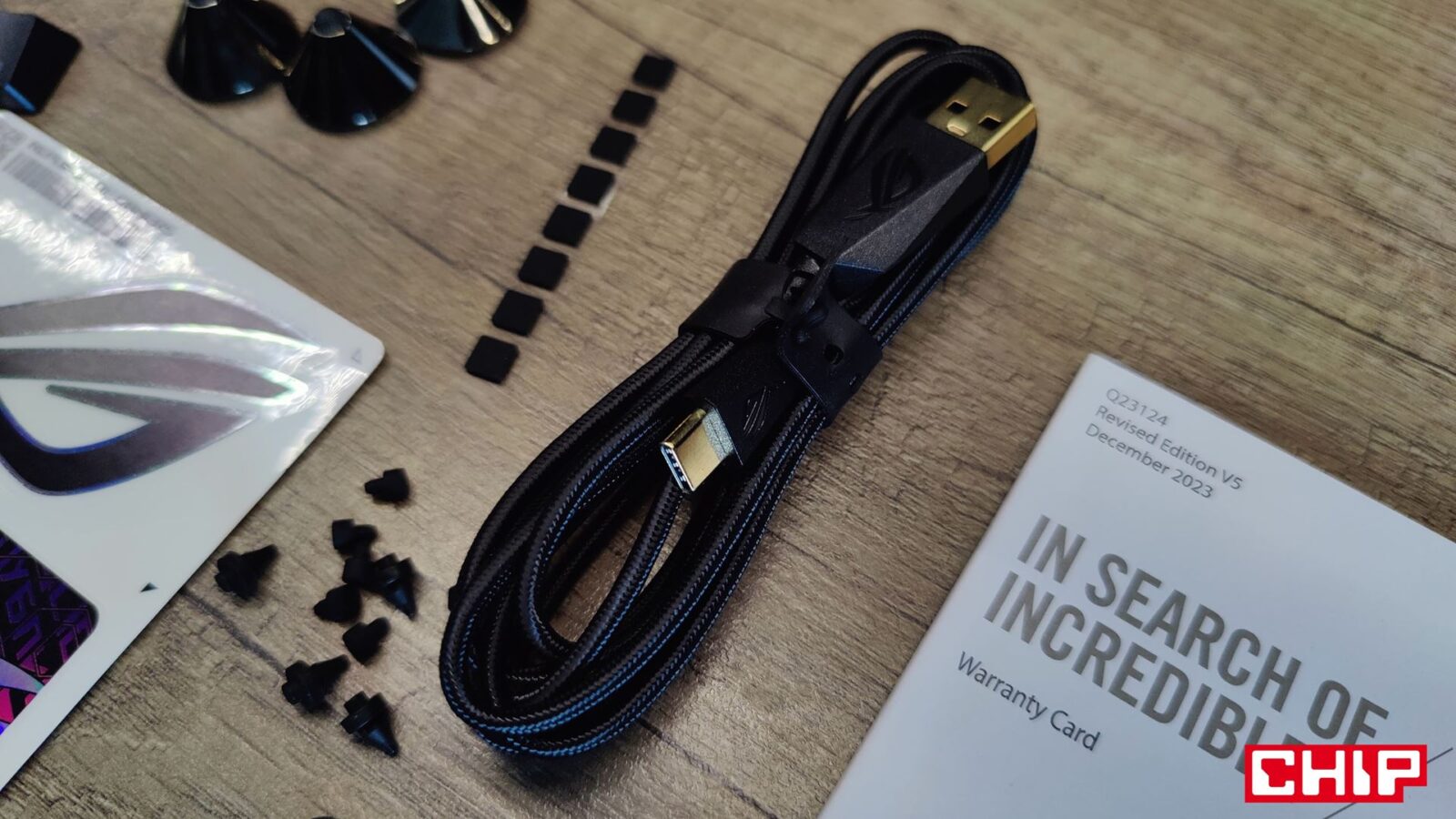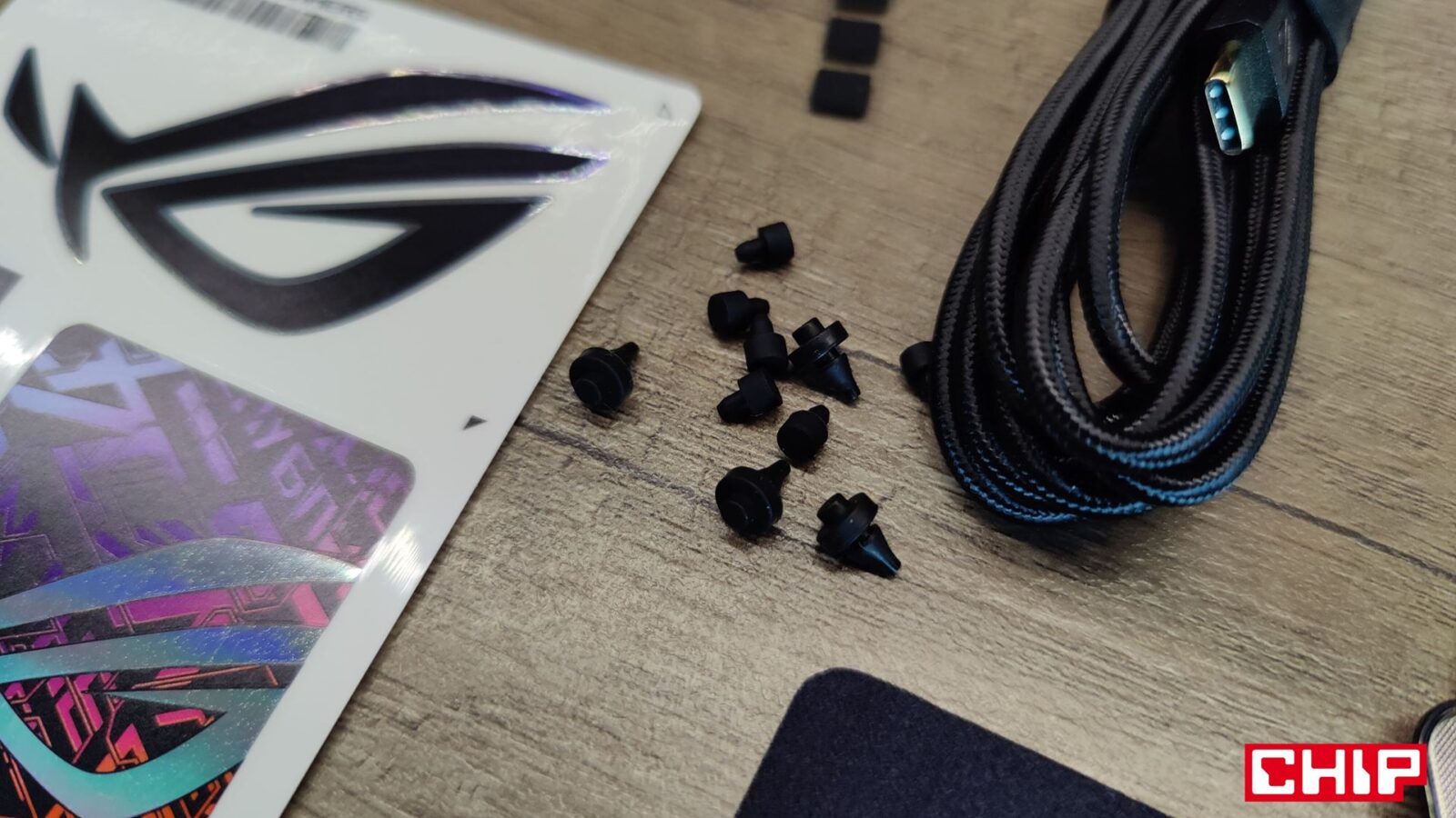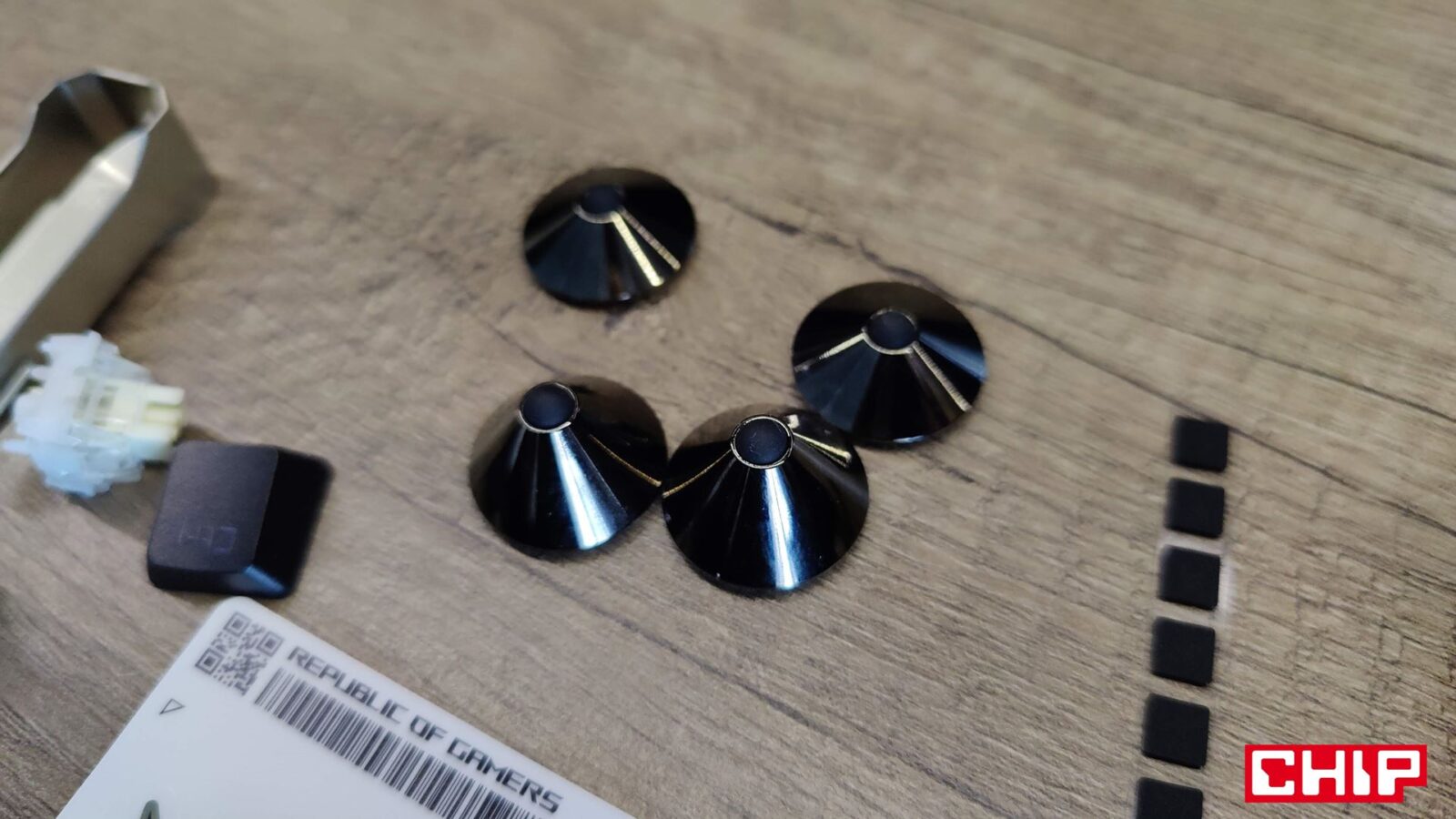 W praktyce jedyne, co musicie wyjąć z pudełka razem z klawiaturą, to wypolerowaną odznakę, która ląduje od razu na spodnią część klawiatury, najlepiej spisujące się nóżki magnetyczne, przewód, odbiornik radiowy i podkładkę, a w razie chęci uzyskania wyższego odświeżania, wpiąć również ROG Pooling Rate Booster do laptopa lub komputera. Wtedy musicie pamiętać, żeby wpinać przewód lub odbiornik USB właśnie do tego gadżetu, aby podbić odświeżanie z 1000 do 8000 Hz. Czy warto? Za coś przecież zapłaciliście, ale nie liczcie na to, że nagle będziecie pisać szybciej. O ile w przypadku myszek ten wzrost odświeżania ma sens, tak w kwestii klawiatur mam co do tego ogromne wątpliwości.