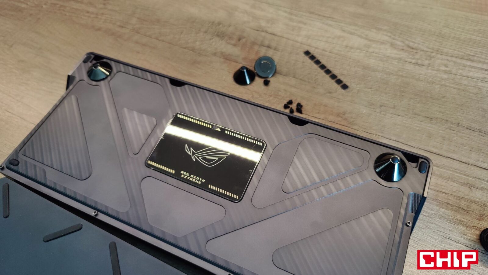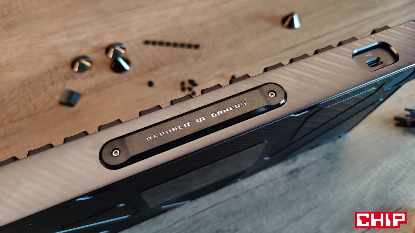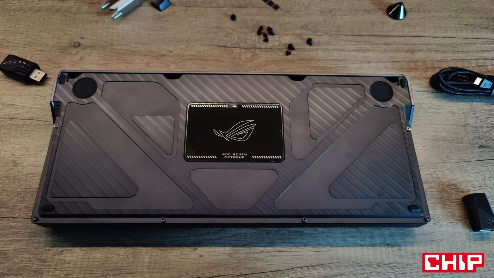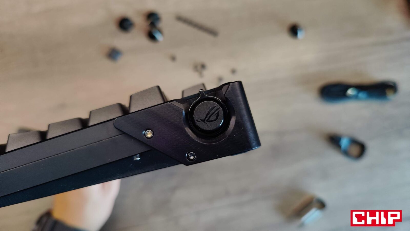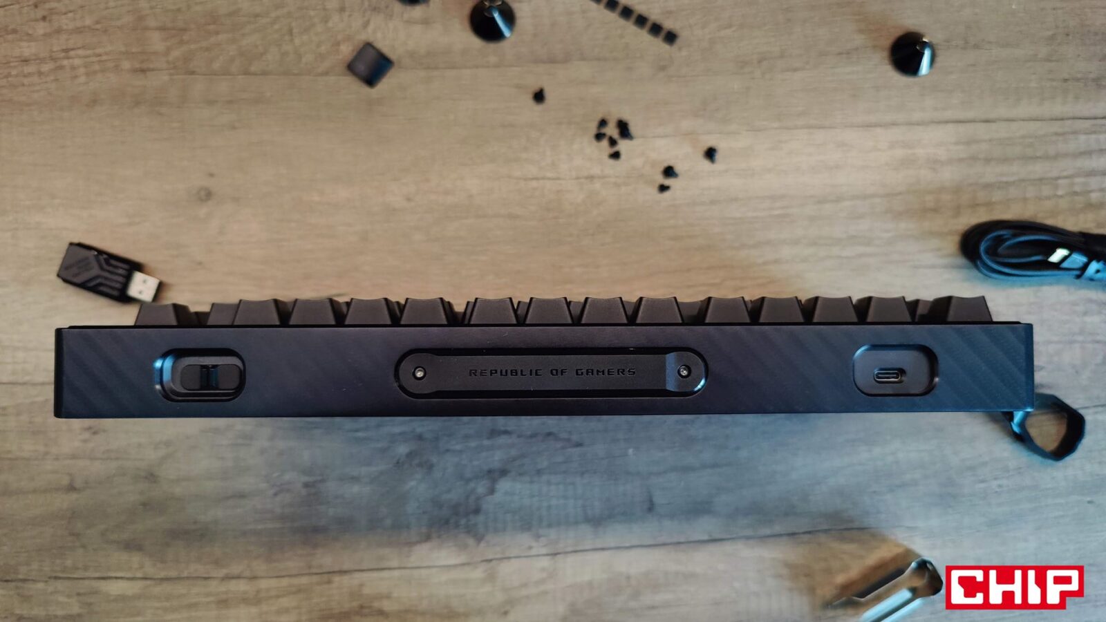 Na tylnej krawędzi tej klawiatury oprócz plastikowej nakładki z grawerem “Republic of Gamers” znajdziecie też trójstopniowy przełącznik (Bluetooth, tryb przewodowy, tryb radiowy) oraz port USB-C, a na spodzie zarówno dwa dedykowane miejsca na dołączone metalowe nóżki w formie stożków, które podbijają kąt z podstawowych 5 stopni do 9 lub 11 stopni, jak i namagnesowaną lukę na wypolerowany emblemat z laserowym grawerem.