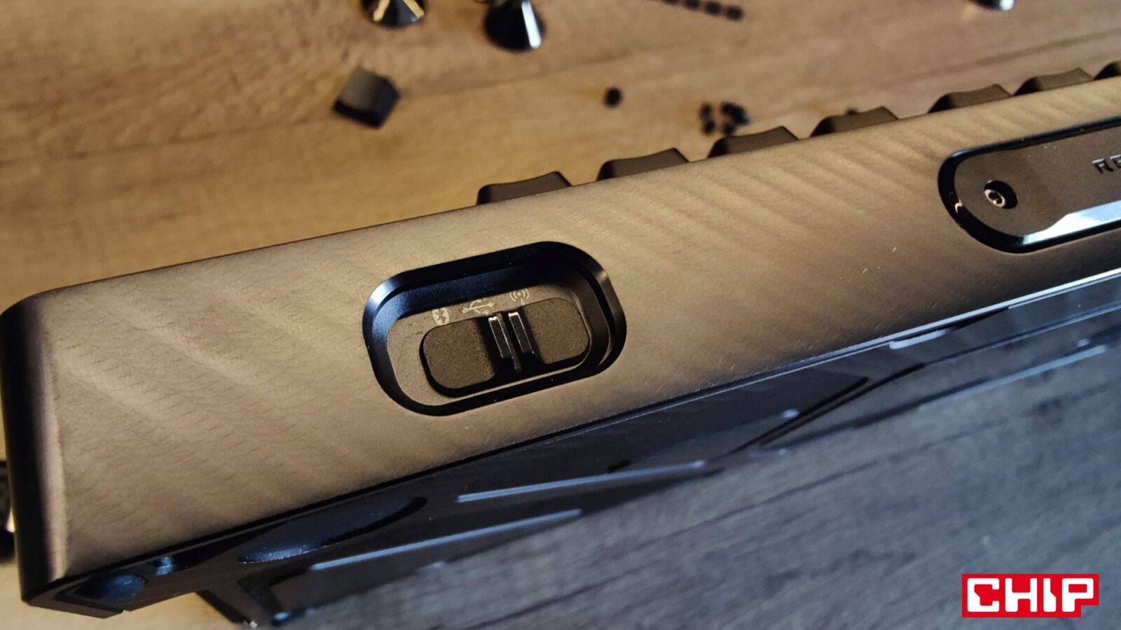 Pod nim znajdziecie zarówno miejsce na radiowy odbiornik USB-A, jak i przełącznik kliku miękkiego i twardego dla “uszczelek”, które znacie najpewniej lepiej pod nazwą “gasket”. Te dodają kolejnych trzech groszy do i tak złożonej konstrukcji wewnętrznej klawiatury, która w swojej obudowie oprócz laminatu ma również płytę dla montażu przełączników z włókna węglowego i trójelementowy zestaw dodatków wygłuszających, które obejmują podkładkę piankową PORON, podkładkę na przełączniki PORON oraz silikonową warstwę, dodatkowo wygłuszającą wstrząsy i pochłaniającą wibracje.