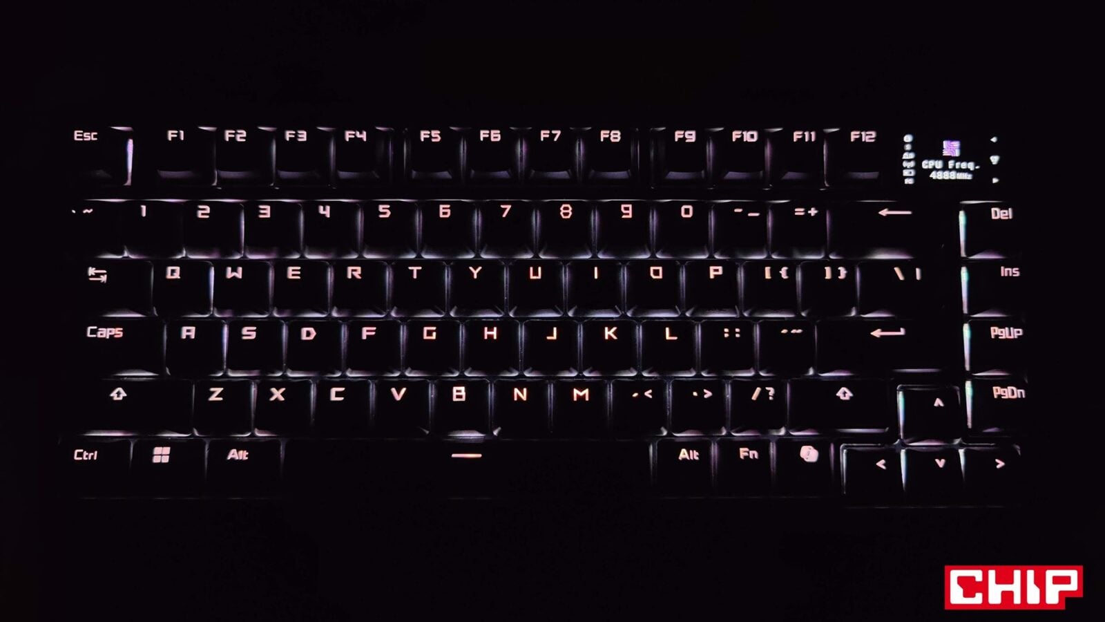 Kilka słów warto też poświęcić całkowicie czarnym keycapom z mleczną czcionką. Daleko im do tradycyjnych rozwiązań, bo oprócz wykonania ich w technologii Doubleshoot, czyli podzielenia klawisza na dwa elementy (czarną obudowę i wewnętrzne mleczne wypełnienie), co gwarantuje przejrzystą i dobrze podświetlaną czcionkę, Asus pokrył je również warstwą twardej powłoki UV, która gwarantuje ochronę przed ścieraniem się i świeceniem klawiszy. To ostatnie ma przede wszystkim zagwarantować kilka lat spokoju, jeśli idzie o wycieranie się klawiszy. Możecie też liczyć na specjalne stabilizatory z zaaplikowanym smarem pod większymi przyciskami oraz jeszcze lepiej potraktowaną spacją, która to opiera się na trzech punktach i nawet zyskała specjalną piankę dla poprawy akustyki. Efekt? Jedna z najbardziej przyjemnych do klikania spacji, w jakie kiedykolwiek klikałem.