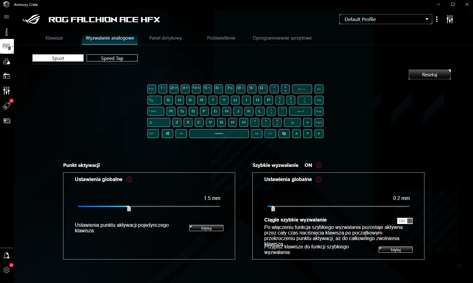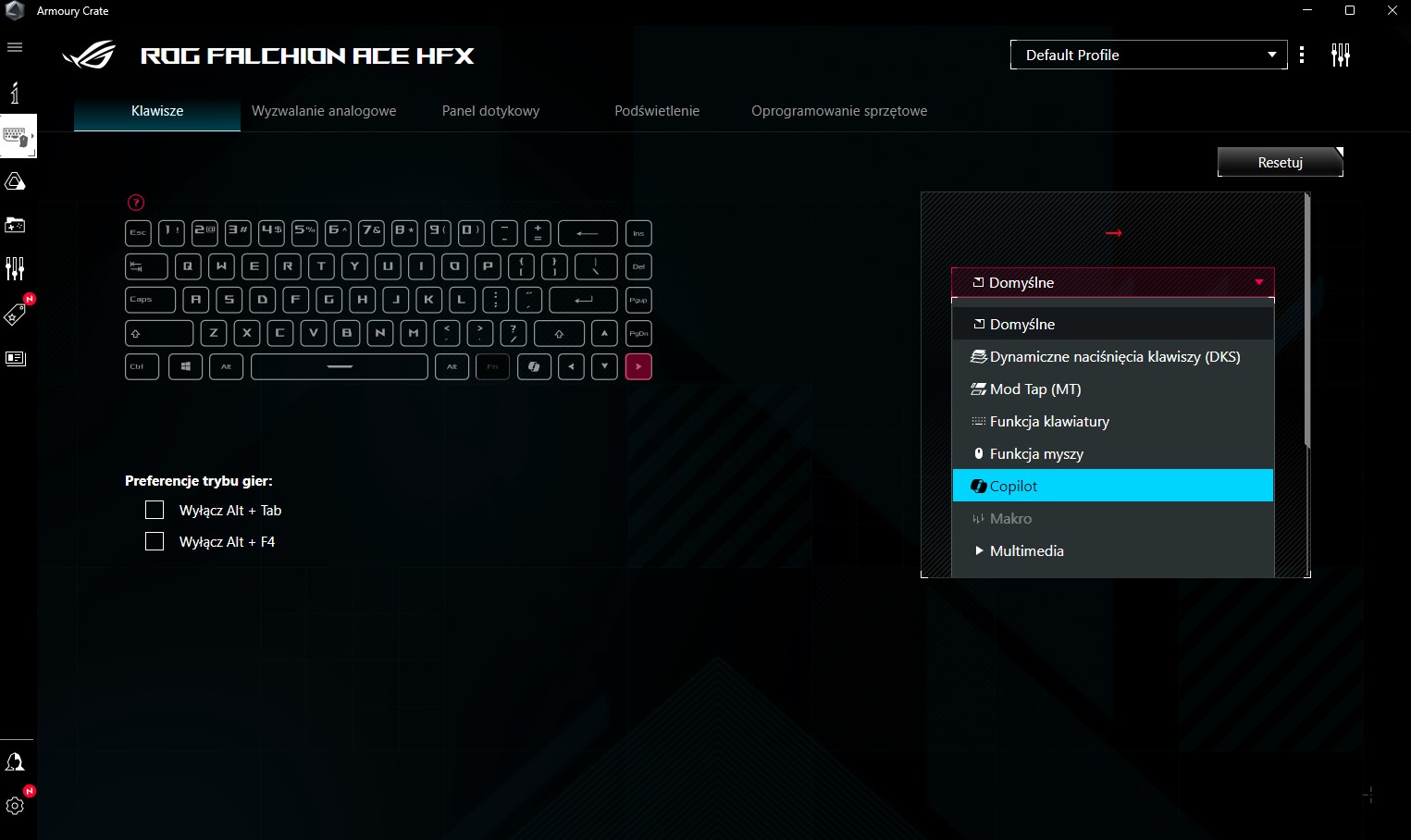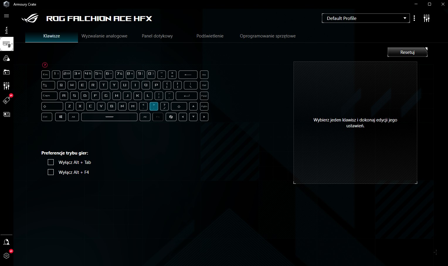 To, na co można z kolei narzekać, to oprogramowanie, które podczas testów ASUS ROG Falchion Ace HFX wygląda w języku polskim tak, jakby ktoś przekopiował tłumaczenie z angielskiego bez większego namysłu i nawet nie sprawdził, czy wygląda to dobrze na interfejsie. Poza tym problemem oprogramowanie zapewnia dostęp do najważniejszych funkcji podstawowych każdej klawiatury oraz ustawień związanych ze wspomnianymi funkcjami, z czego Speed Tab niestety kompletnie nie działa w aktualnej wersji firmware.