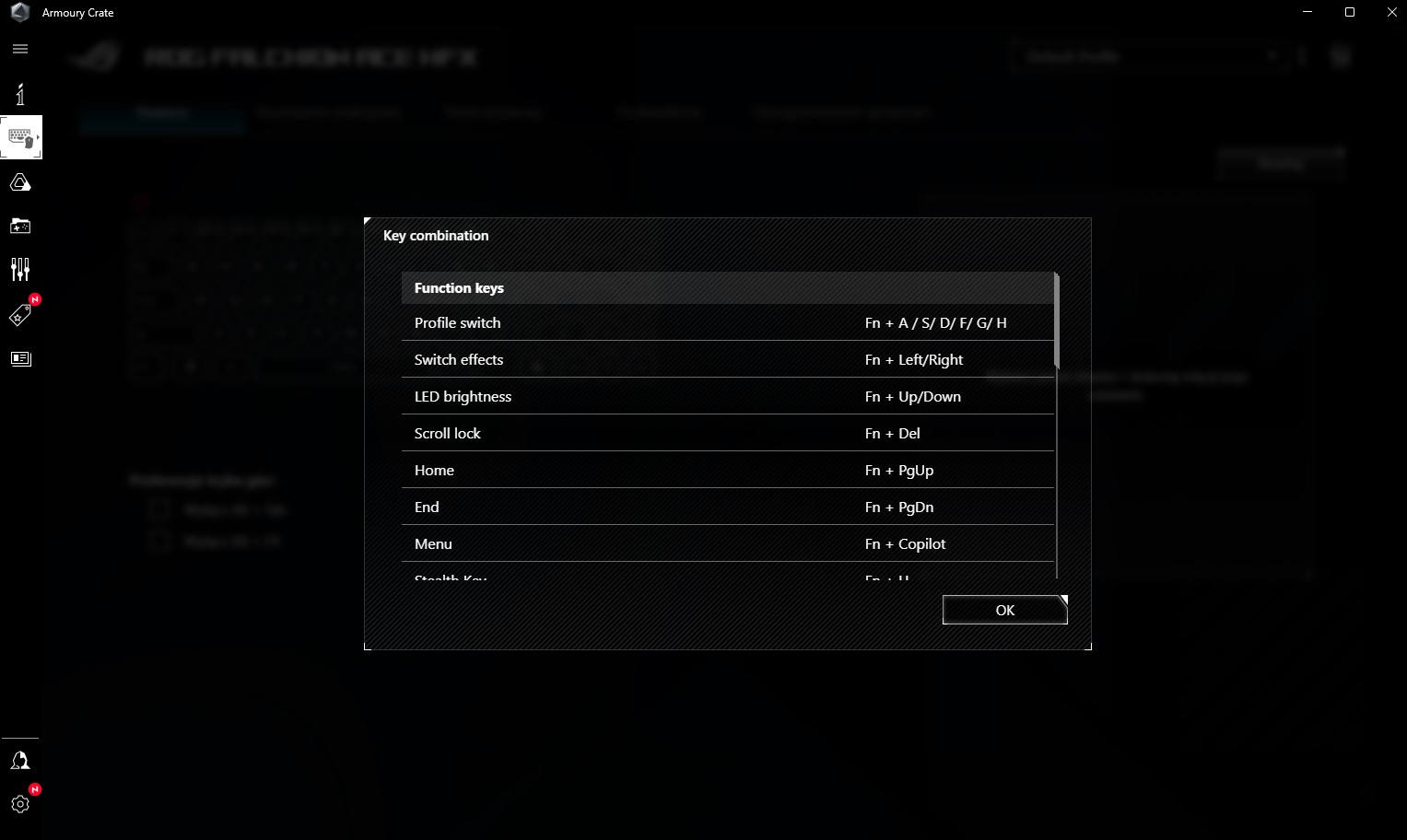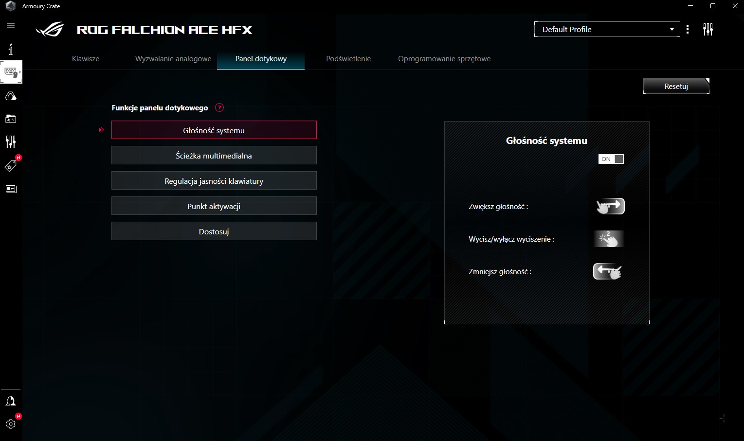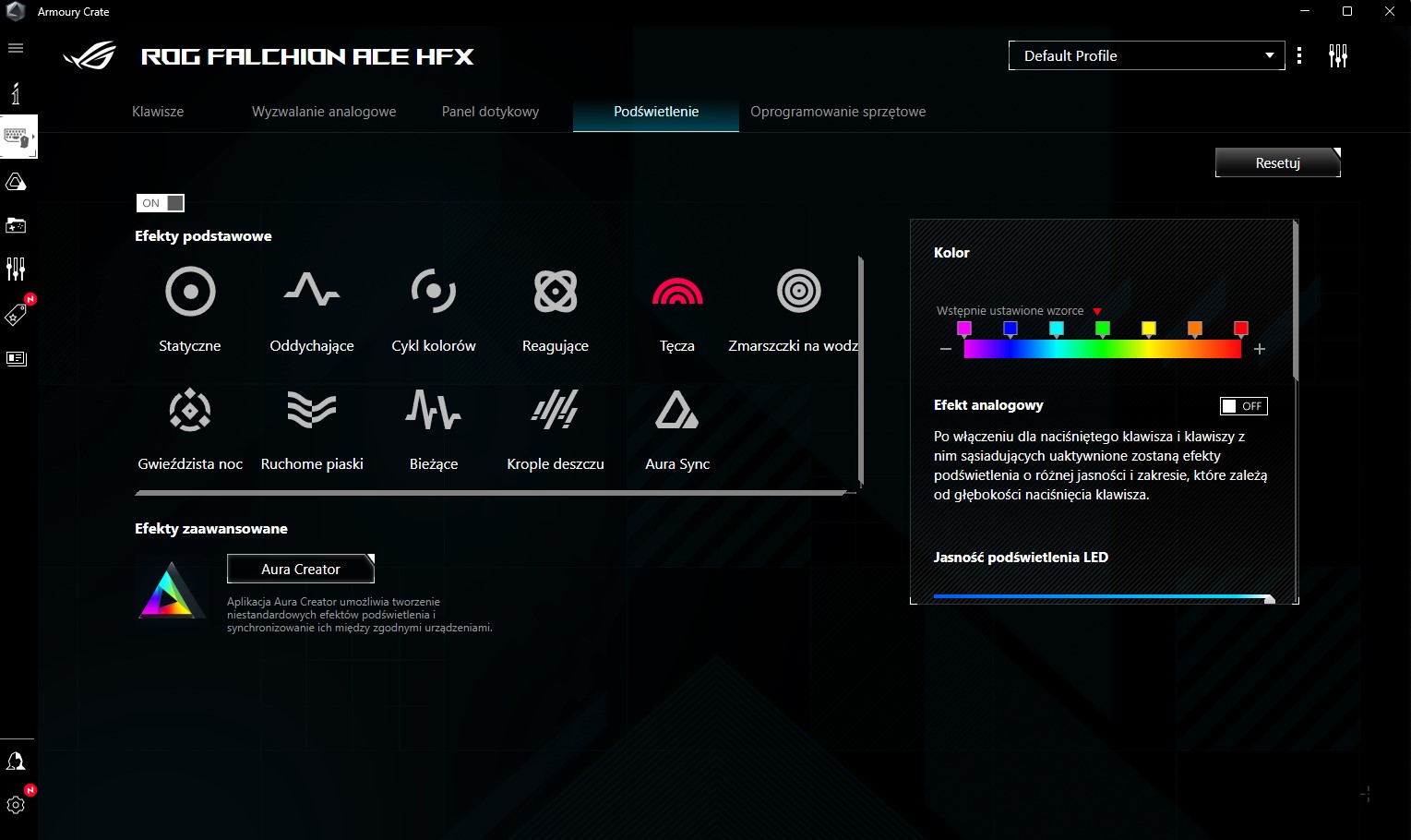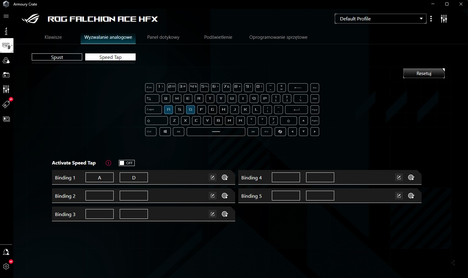 To, na co można z kolei narzekać, to oprogramowanie, które podczas testów ASUS ROG Falchion Ace HFX wygląda w języku polskim tak, jakby ktoś przekopiował tłumaczenie z angielskiego bez większego namysłu i nawet nie sprawdził, czy wygląda to dobrze na interfejsie. Poza tym problemem oprogramowanie zapewnia dostęp do najważniejszych funkcji podstawowych każdej klawiatury oraz ustawień związanych ze wspomnianymi funkcjami, z czego Speed Tab niestety kompletnie nie działa w aktualnej wersji firmware.