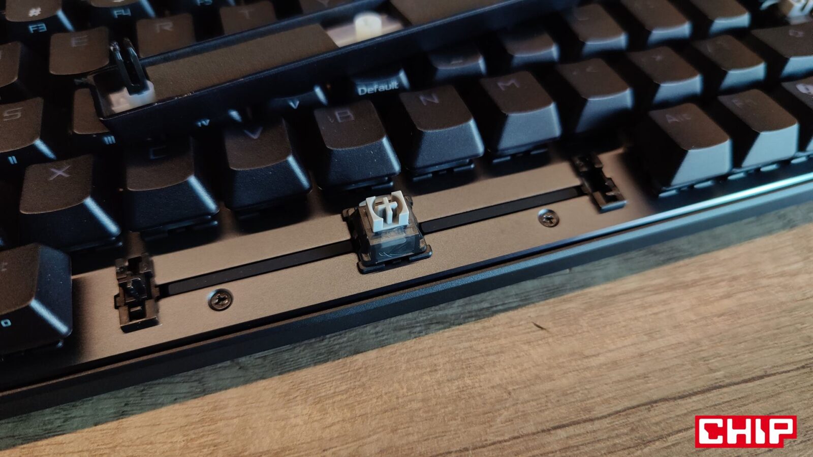 ASUS w ROG Falchion Ace HFX zastosował swoje autorskie przełączniki magnetyczne ROG HFX (konkurencja również je ma, czego przykładem są SteelSeries OmniPoint), które to wymagają 40 gf siły początkowej oraz 55 gf siły całkowitej do pełnego wciśnięcia. Ich wytrzymałość wynosi fenomenalne 100 mln aktywacji, a dzięki bazowaniu nie na metalowych stykach, a magnesie i efekcie Halla, możecie dostosowywać wysokość aktywacji każdego przycisku między 0,1 a 4 mm. Ich charakter pracy jest całkowicie liniowy i bardzo, ale to bardzo responsywny, jako że pomimo magnesu, w środku każdego przełącznika znajduje się tradycyjnie stosowna sprężynka. ASUS w swoim projekcie postawił też nie na tradycyjne “stemki” krzyżakowe, a połączenie krzyżyku z kwadratowym obudowaniem dookoła, co nie jest żadną sztuczką na ograniczenie kompatybilności, a po prostu dążeniem do ustabilizowania keycapa na przełączniku.