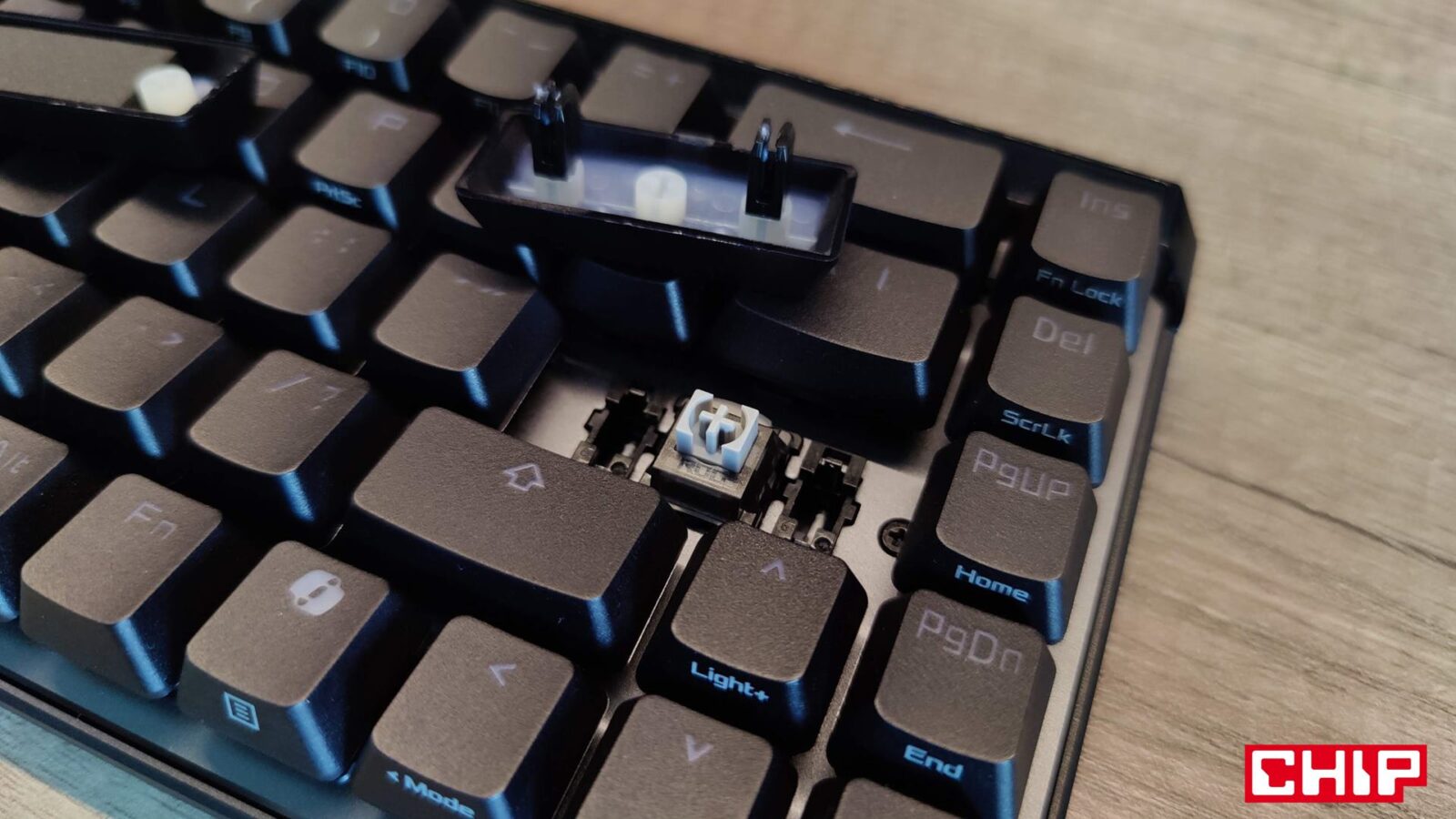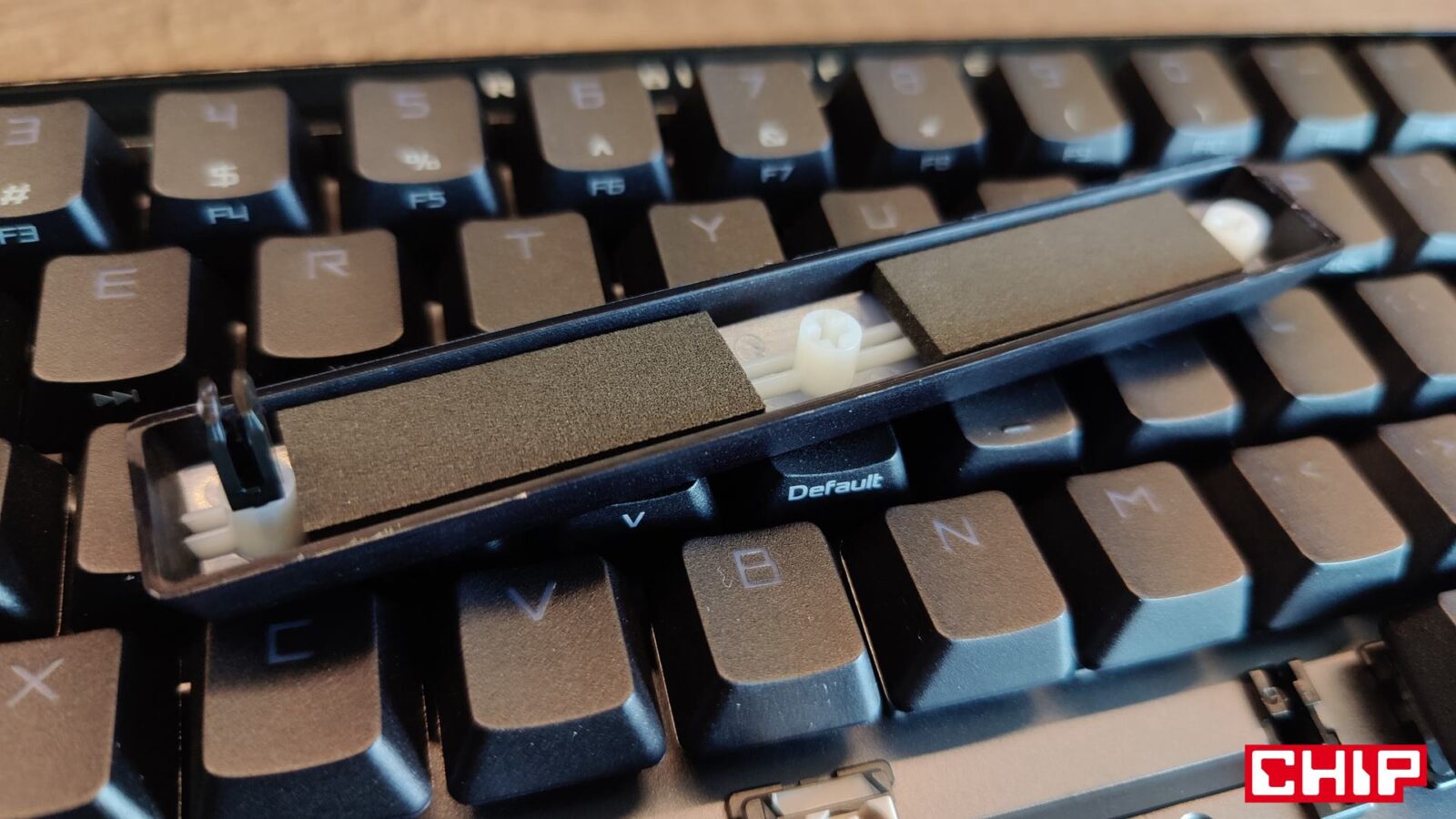 Wyjątkowo działające przełączniki, w których liniowym charakterze można się zakochać, to jednak nie ta jedyna część sukcesu, stojącego za świetną jakością kliku, który jest na tyle przyjemny, że nad specjalnie wzmocnioną i dodatkowo ustabilizowaną spacją można się wręcz rozpływać. W ROG Falchion Ace HFX odpowiada za to również zestaw pięciu dodatkowych warstw – dwóch nad laminatem (to silikonowa pianka i warstwa materiału PORON) i trzech pod nim (pianka, silikonowa podkładka z uszczelkami, silikonowy pasek). Tak zaawansowane przełączniki umożliwiły również stworzenie czegoś specjalnego, za co ASUSowi naprawdę należy się uznanie.