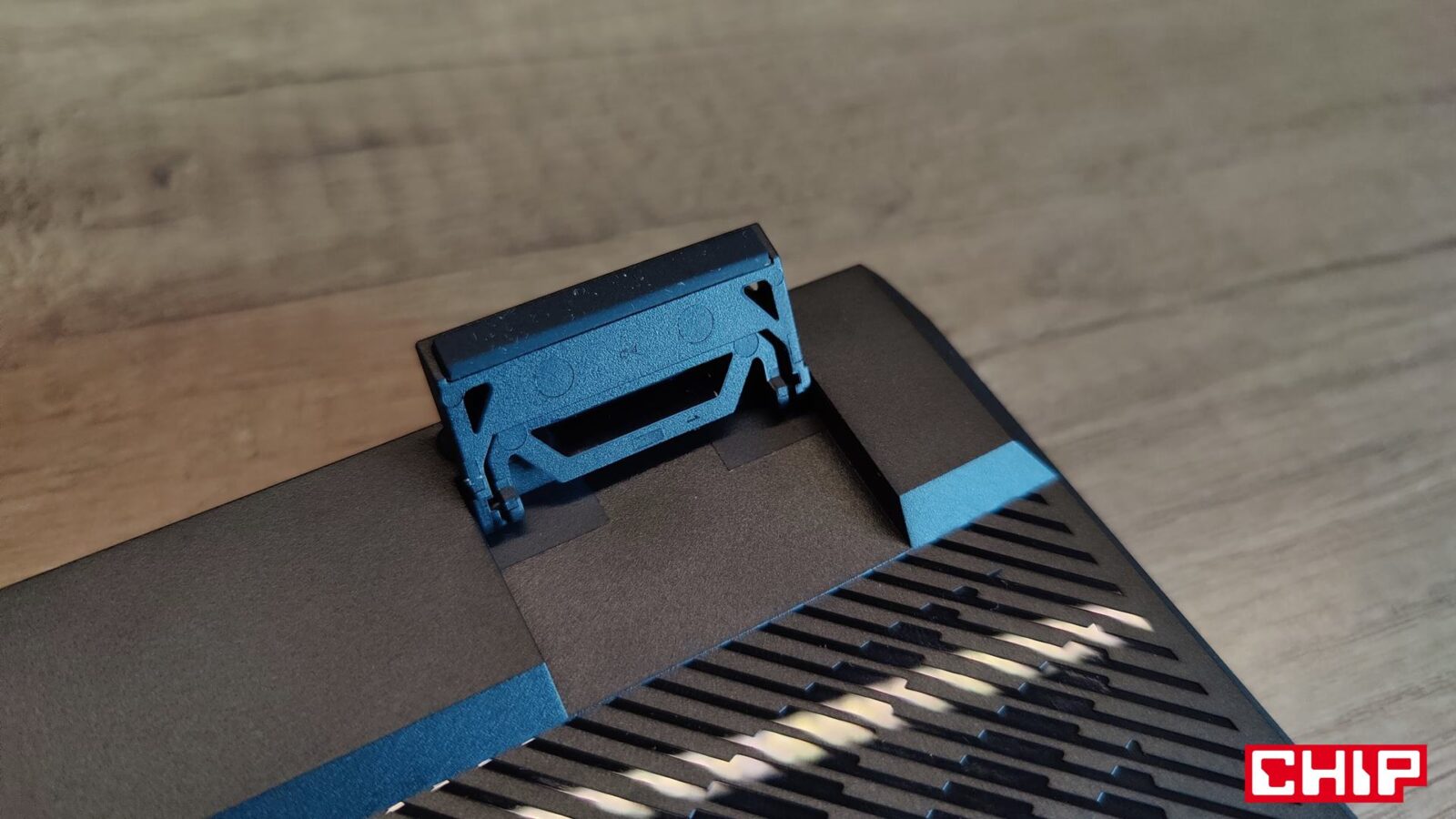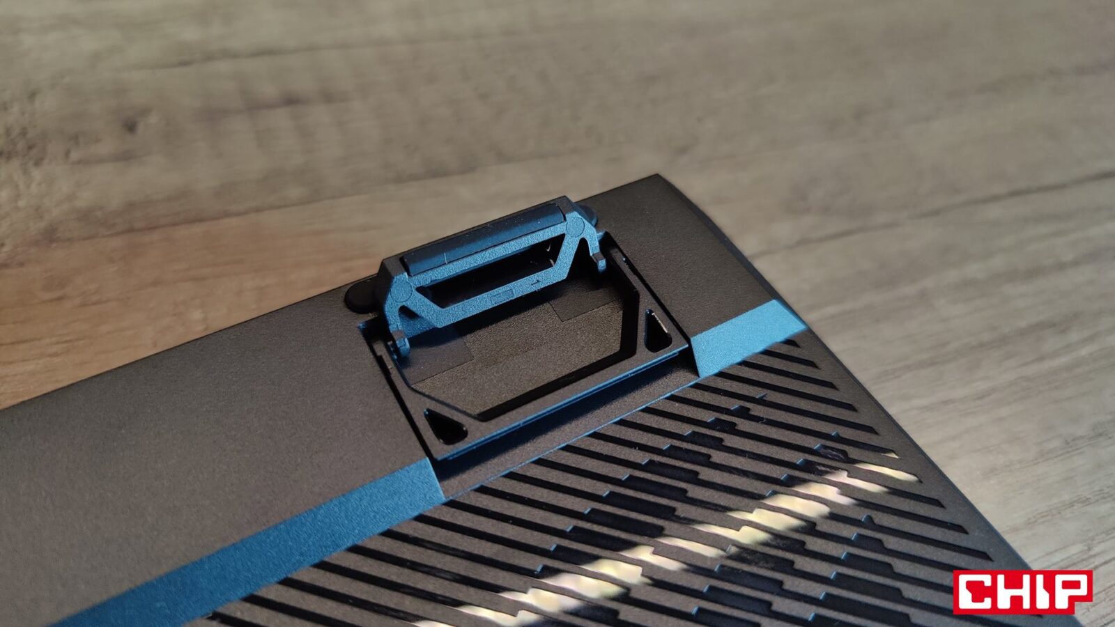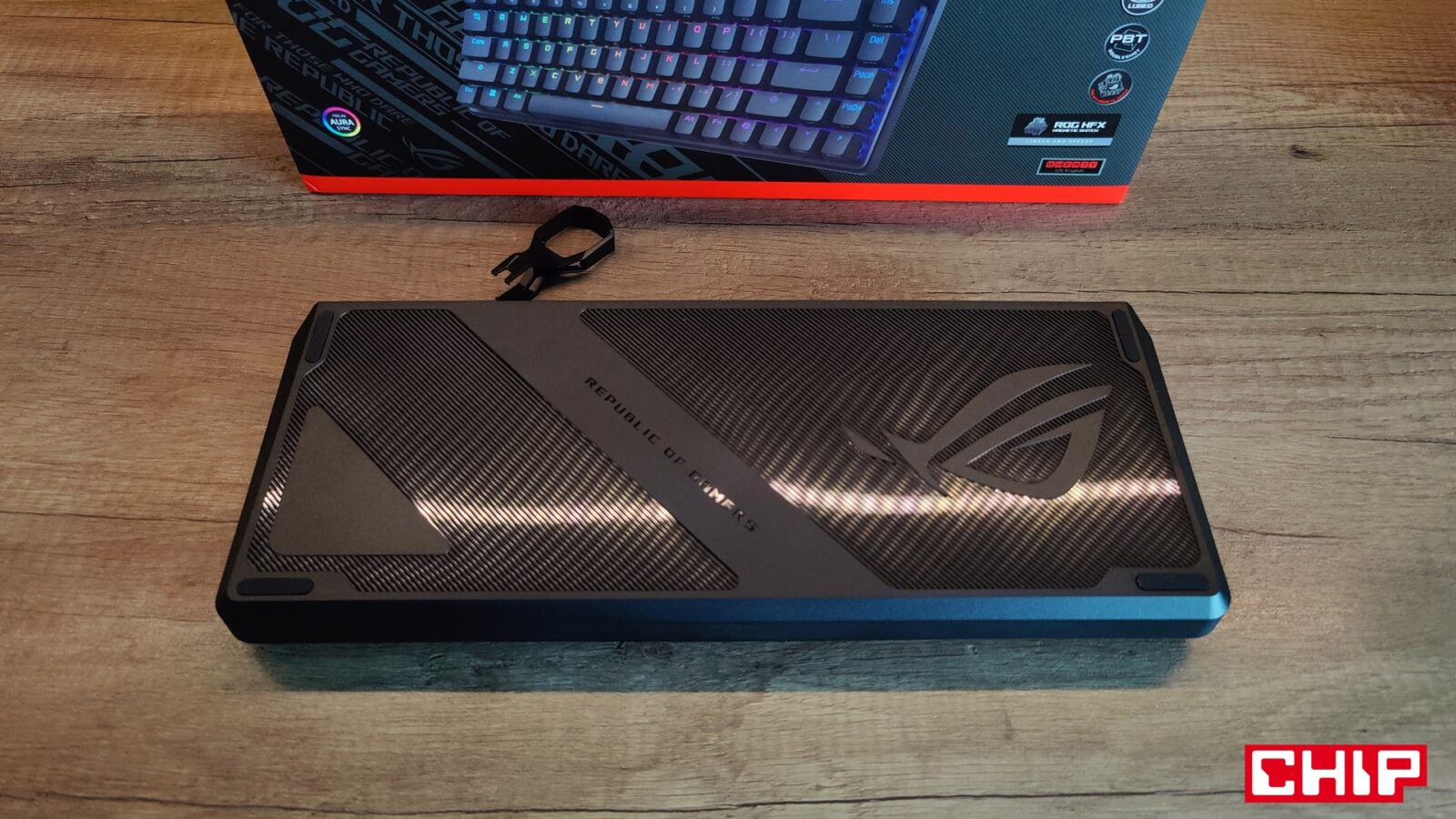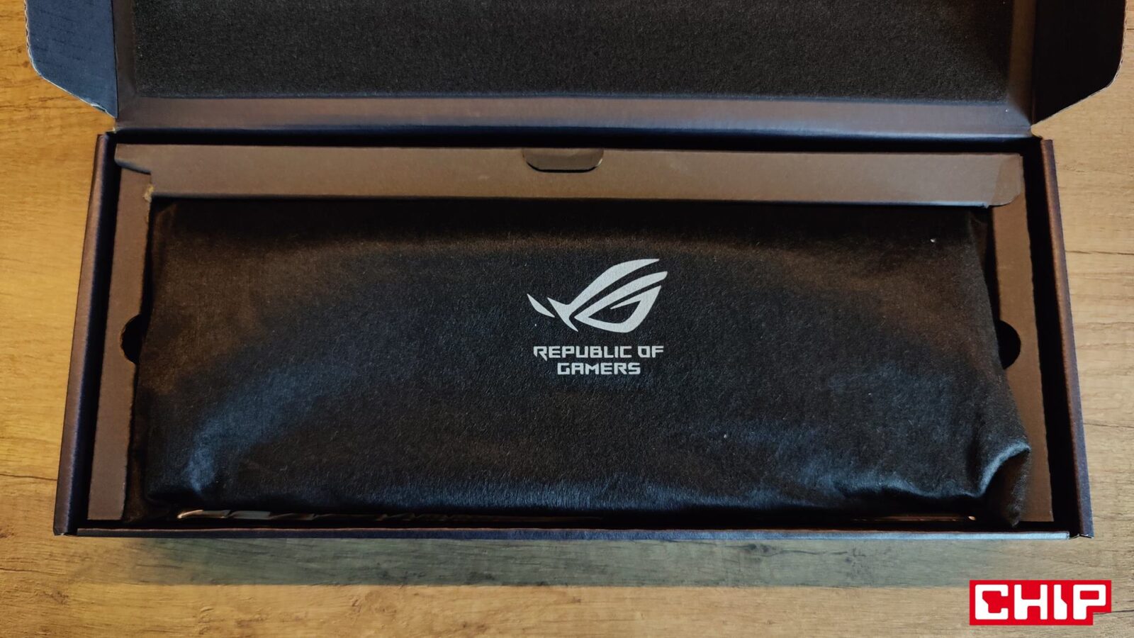Zacznijmy od samego początku, a więc tego, co znajdziemy w pudełku oprócz samej klawiatury. Naklejki, przewód, papierologia, ściągacz klawiszy – to tak naprawdę standard, ale osłona na klawiaturę jest już czymś wręcz rewolucyjnym. Ba, sam nawet nie wiedziałem na samym początku, jakie dokładnie jest jej przeznaczenie, jako że wygląda ona jak dolna część obudowy innej klawiatury, zważywszy na cztery gumowe podkładki i skomplikowany, ale przyjemny dla oka wzór oraz gumową powierzchnię wewnętrzną, która składa wręcz hołd marce ROG. W praktyce wykorzystuje się nią jako nakładkę (zaczepów czy magnesów niestety w niej brakuje), aby chronić klawiaturę w transporcie czy po prostu na biurku, aby między przyciskami nie zbierał się niechciany kurz. Opcjonalnie można też potraktować ją w roli podstawki dla klawiatury, żeby utrzymać większy porządek na blacie, ale wtedy blokujemy sobie dostęp do podwójnych nóżek i na dodatek pogarszamy lichą z racji niskiej wagi przyczepność do blatu, za którą odpowiada główny gumowy pasek na dolnej części obudowy oraz dwa dodatkowe gumowe wstawki w górnych rogach lub na samych nóżkach.