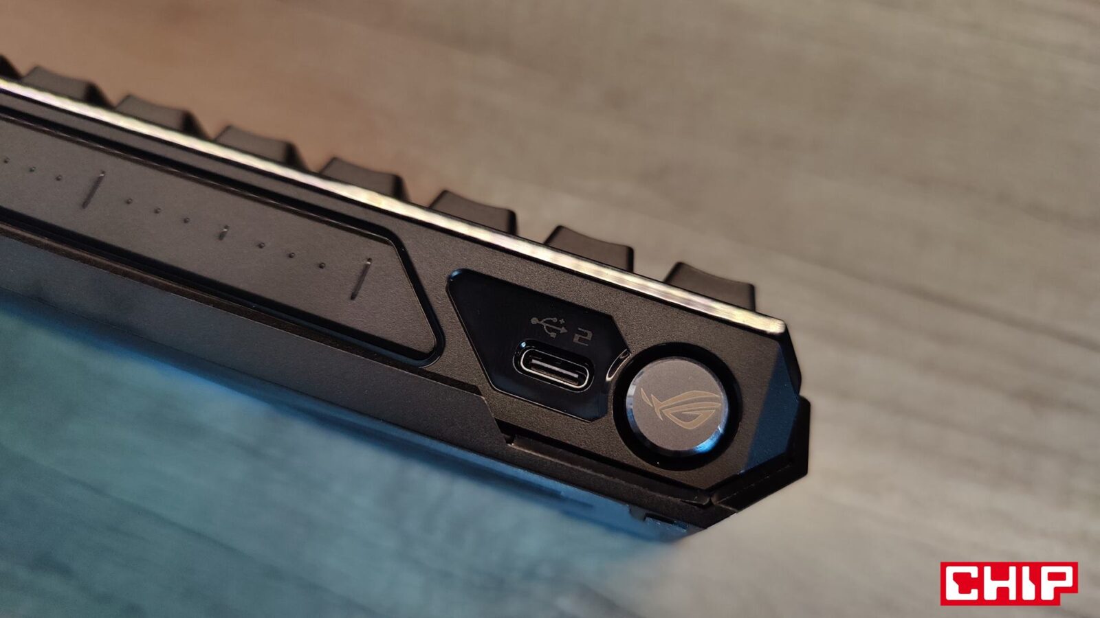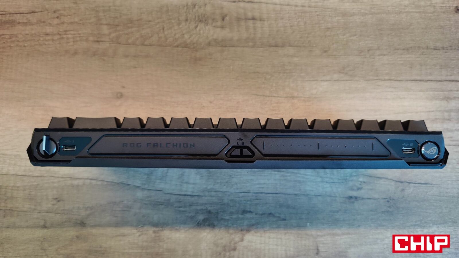 Ma swój charakter i to jest najważniejsze. Mimo niewielkich rozmiarów ROG Falchion Ace HFX po prostu może się podobać, a to dzięki nie tylko świetnie prezentującym się keycapom (wykonane techniką Doubleshot i pokryte powłoką UV) o świetnej czcionce, ale też górnej lustrzanej sekcji. Ta skrywa pod sobą zajmujący większość paska zestaw pochylonych kresek oraz hasło Republic of Gamers w centrum, które to są podkreślone potęgą RGB oraz reagują na nasze interakcje z dotykową sekcją na tylnej krawędzi klawiatury. Na tyle zresztą ROG Falchion Ace HFX zyskał wiele ciekawych elementów i nie mowa tutaj wyłącznie o dwóch portach USB-C z lewej i prawej strony, które aktywuje zero-jedynkowy przełącznik w centrum. Co ciekawe, oba porty działają z odświeżaniem aż 8000 Hz, czyli osiem razy okazalszym względem standardowych 1000 Hz, co z kolei zmniejsza opóźnienie sygnału z 1 milisekundy do ledwie 0,125 ms, ale producent podkreśla, że opóźnienie samego kliku wynosi więcej, bo średnio 1,1 ms, a więc o 1-8 ms mniej od “konkurencyjnych klawiatur z odświeżaniem 8000 Hz”. Uprzedzę was jednak, bo choć różnicę widać w przypadku myszek w połączeniu z monitorami o wysokim odświeżeniu, to zwiększenia reakcji klawiatury prawie na pewno nie odczujecie. Poczujecie z kolei wyjątkowe przełączniki.