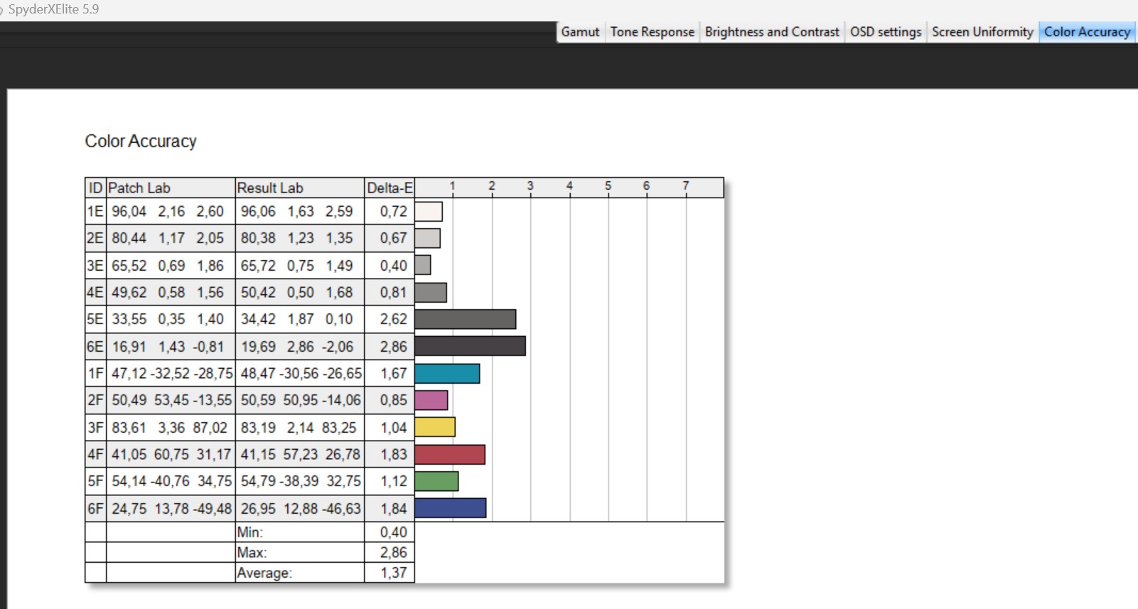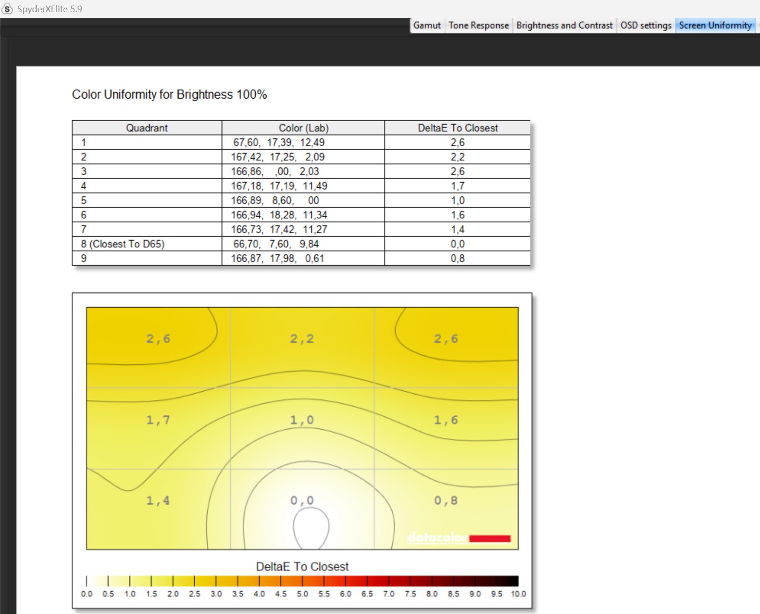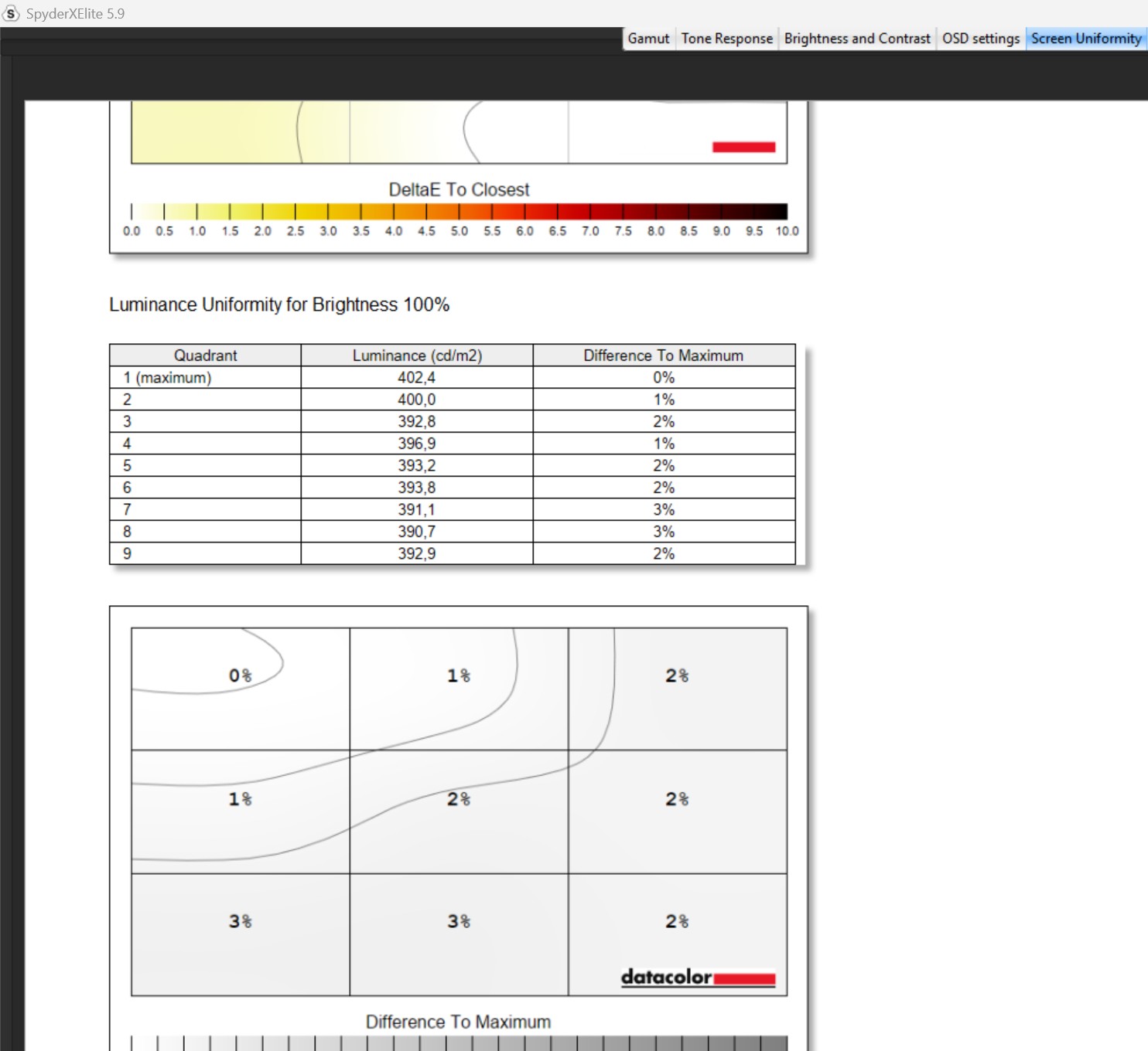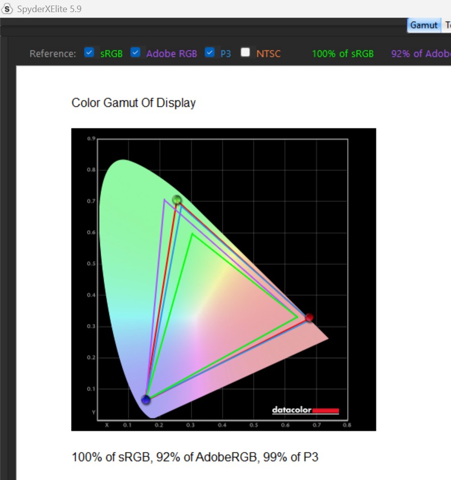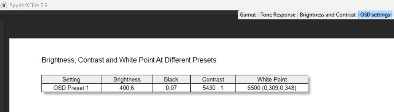 Powyżej możecie rzucić okiem na test opisanej matrycy w ustawieniu domyślnym z wykorzystaniem kalibratora Spyder Elite. Z tych danych wynika, że wyświetlacz Nebula pokrywa 100% gamy sRGB, 99% gamy DCI-P3 oraz 92% AdobeRGB, a choć ocena odpowiedzi tonalnej wypada katastrofalnie, to zmiana trybu na inny (poza domyślnym), winduje ten pomiar do wzorowej “piątki”. Odnotowana maksymalna jasność wynosiła z kolei 400 nitów z niewielkimi różnicami między sekcjami panelu, co w przypadku jednolitości kolorów również wypadło fenomenalnie, zamykając się w 1-3% różnicy. Precyzja odwzorowania kolorów waha się z kolei od 0,4 do 2,86 Delta-E, a średnia rzędu 1,37 oznacza, że różnica między realnym kolorem, a tym odczytanym, jest prawie niemożliwa do zauważenia.