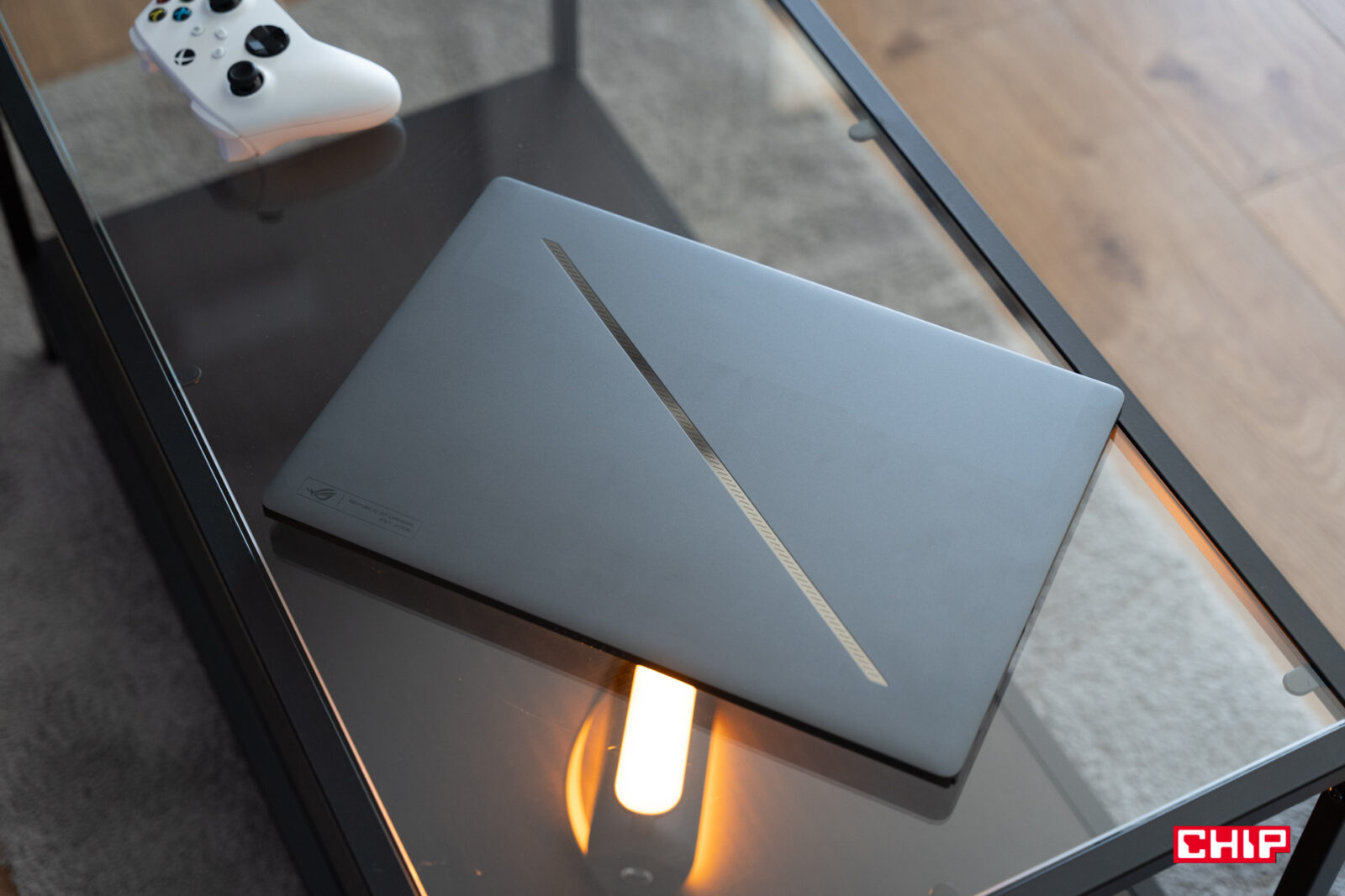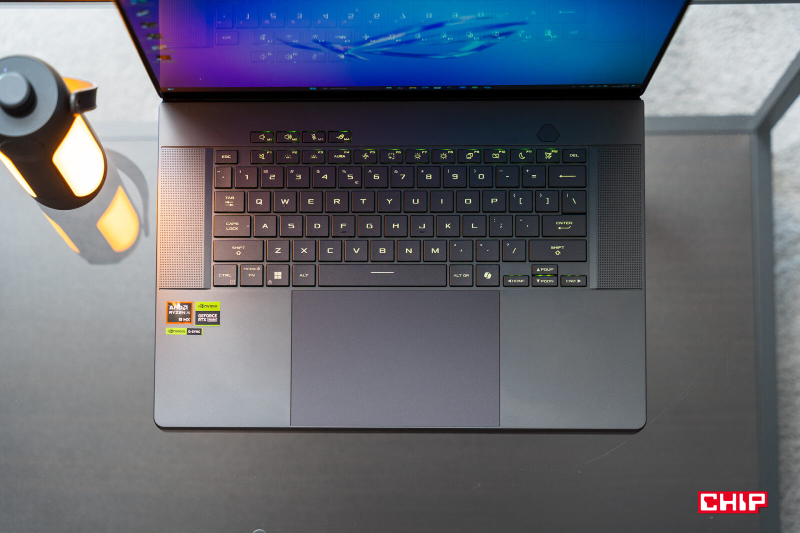 Na całe szczęście dążenie do osiągnięcia wysokiej wytrzymałości nie sprawiło, że ASUS został zmuszony do pominięcia granic dobrego smaku. Wręcz przeciwnie, czego efektem jest bardzo dobrze przemyślana konstrukcja ROG Zephyrus G16. Widać to po otworach wentylacyjnych, ukrytych zawiasach, nazwie modelu na krawędzi ekranu, wielkich gumowych podkładkach antypoślizgowych, formie niskoprofilowej klawiatury z klawiszami o wytrzymałości 20 mln aktywacji czy wielkim, świetnie zintegrowanym z obudową gładziku i wreszcie systemie podświetlenia. Obok podświetlanych klawiszy ASUS postanowił też zintegrować w pokrywie laptopa podświetlaną część przekątnej o nazwie Slash Lighting, która nie tylko wyróżnia wizualnie laptopa i po prostu wygląda ładnie, ale też może pełnić funkcję informowania o nowych powiadomieniach. Nie jest to na szczęście byle pasek LEDów, a futurystycznie prezentujący się zestaw kilkudziesięciu poziomych linii, pod którymi znajdują się diody, mogący działać w ramach aż 15 różnych animacji. Czego z kolei nie rozumiem? Umiejscowienia diod informujących o zasilaniu i pracy dysku, które są widoczne tylko po zamknięciu laptopa i… to z tyłu, więc tak naprawdę nigdy ich nie zobaczycie, co może być zresztą umyślnym działaniem ASUSa, aby poprawić czystość projektu nowego ROG Zephyrus G16.