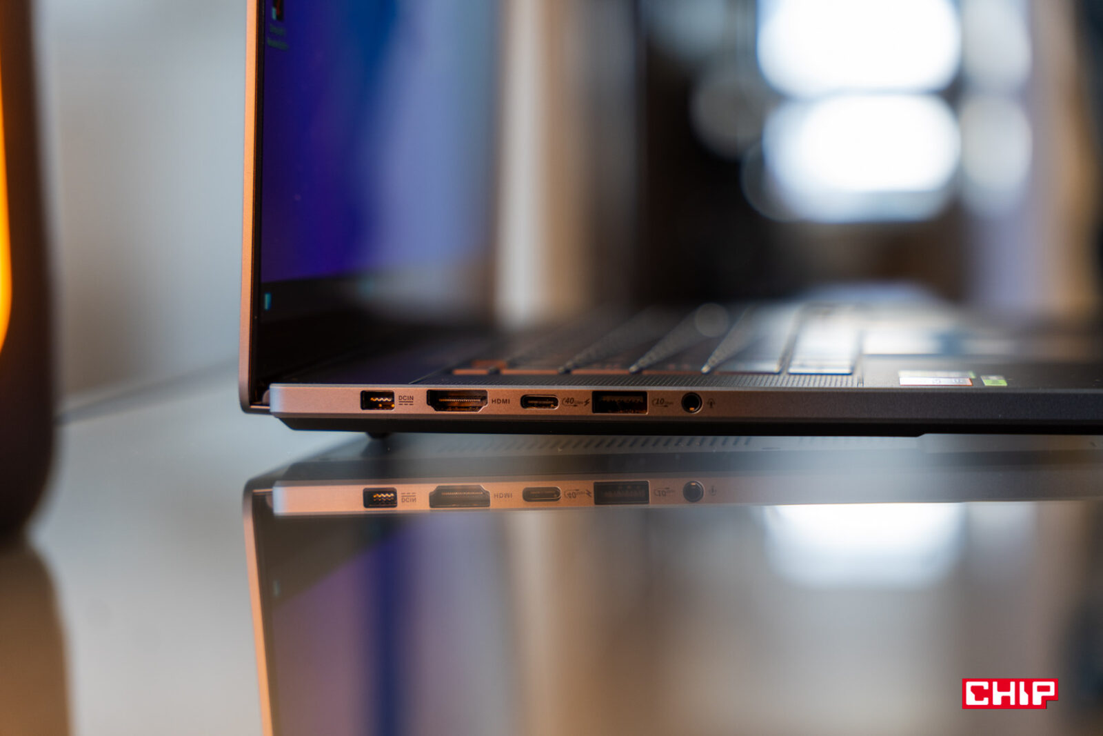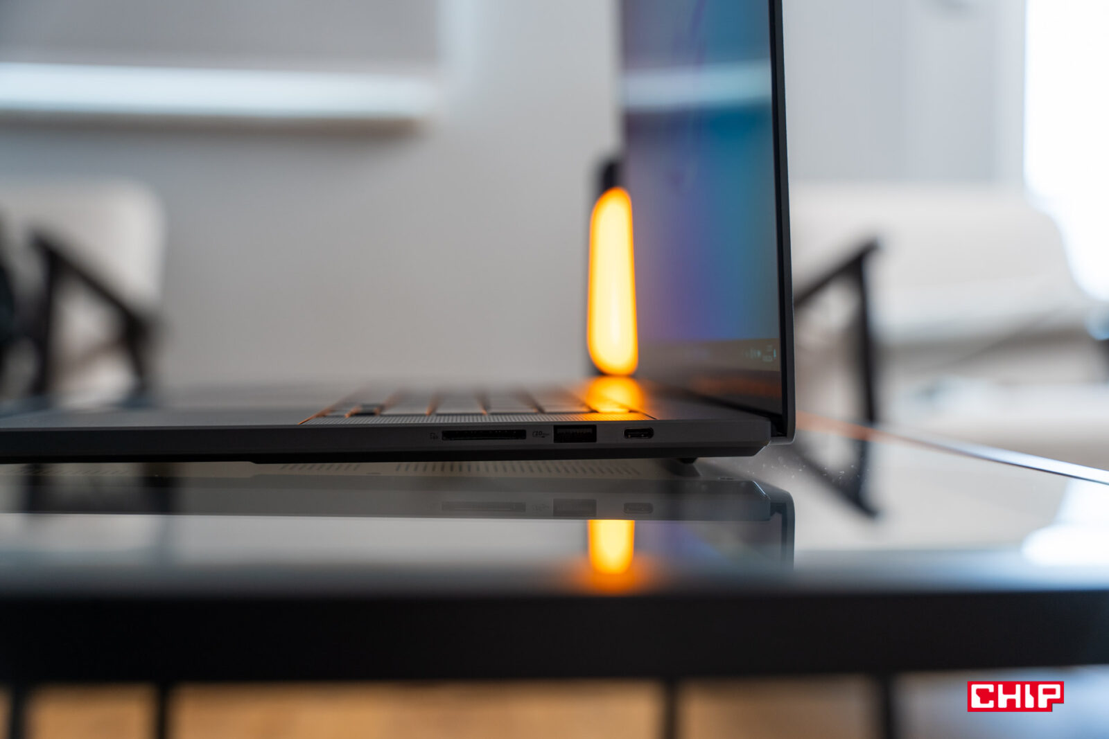 Co więc jeszcze możemy zauważyć “z zewnątrz”? Oczywiście porty, które znalazły się wyłącznie na lewej i prawej krawędzi. Na tej pierwszej znalazło się wejście na mikrofon i słuchawki, USB-A 3.2 Gen 2, USB-C 4.0 z obsługą Power Delivery 3.0 (20V/5A) i DisplayPort 2.1, HDMI 2.1 oraz gniazdo zasilania ASUSa typu Slim, a na drugiej czytnik kart SD 7.0, USB-A 3.2 Gen 2 i USB-C 3.2 Gen 2 z obsługą DisplayPort 1.4 i Power Delivery 3.0 (20V/5A). Innymi słowy, podepniecie do tego laptopa klawiaturę, myszkę i monitor starej daty, ale bardziej skomplikowane zestawy będą wymagać monitorów wspierających DisplayPorta oraz HUBa. Zwłaszcza jeśli koniecznie chcecie wykorzystywać łączność przewodową z racji całkowitego braku portu RJ-45, które ma nam zastąpić wsparcie Wi-Fi 7, a więc standardu, który powoli wchodzi na rynek i następuje dopiero co powszechniejący w naszych domach standard Wi-Fi 6.