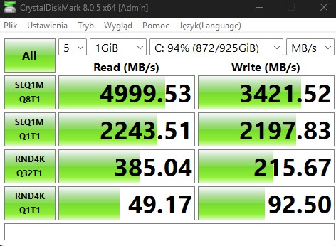 ROG Zephyrus G16 (2024) GA605 w testowanym przeze mnie wariancie łączy procesor Ryzen AI 9 HX 370, dedykowaną kartę graficzną GeForce RTX 4070, dwa 16-GB moduły pamięci LPDDR5X-7500 z kośćmi Samsunga i 1-TB dysk SSD (w praktyce zapewnia 924 GB dostępnej przestrzeni dyskowej) na PCIe 4.0. Na sam początek rozwiążmy kwestię samego SSD-ka, który po zapełnieniu do ponad 90% pojemności gwarantuje bardzo dobre, ale ewidentnie nie topowe poziomy transferów. Co to oznacza? Ano to, że Asus nie przyoszczędził na dysku, więc szybkie kopiowanie plików i ładowanie się gier, macie pewne. Sprawa ma się podobnie z pamięcią operacyjną, bo zamiast tradycyjnych 16 GB, ROG Zephyrus G16 (2024) GA605 oferuje aż 32 GB, które umożliwiają zarówno dużą wielozadaniowość, jak i możliwość pracy w najbardziej wymagających aplikacjach pokroju Unity, Unreal Engine (na małych/średnich projektach) czy DaVinci Resolve. Testy tego połączenia rozpocznijmy od tradycyjnych benchmarków: