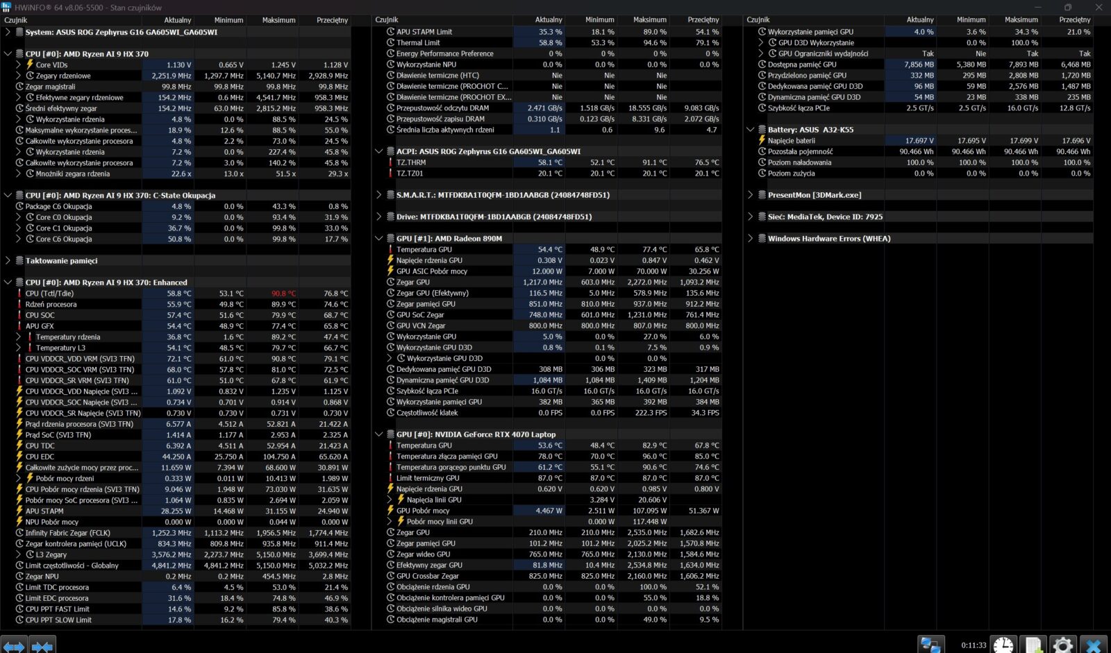 W najwyższym trybie wydajności i przy połączeniu potęgi dGPU i CPU, ROG Zephyrus G16 (2024) GA605 wypada w bardzo oczekiwany sposób. Zależnie od gry, możecie liczyć na przynajmniej stabilne 50-60 klatek na sekundę przy najwyższych ustawieniach graficznych, ale wystarczy zwykle obniżyć je lub wyłączyć ray-tracing, aby nawet 1% najgorszych FPS nie spadał poniżej tych magicznych 60 klatek na sekundę. Pamiętajmy, że RTX 4070 w mobilnej wersji nie jest aż tak potężną kartą graficzną, żeby umożliwiać granie w 2K przy wysokich ustawieniach i płynności, ale w tym laptopie i tak wypada świetnie, bo zarówno trzyma dobre temperatury, jak i ochoczo sięga po wyżyny swoich możliwości, co widać po pobieranej mocy i osiąganych zegarach.