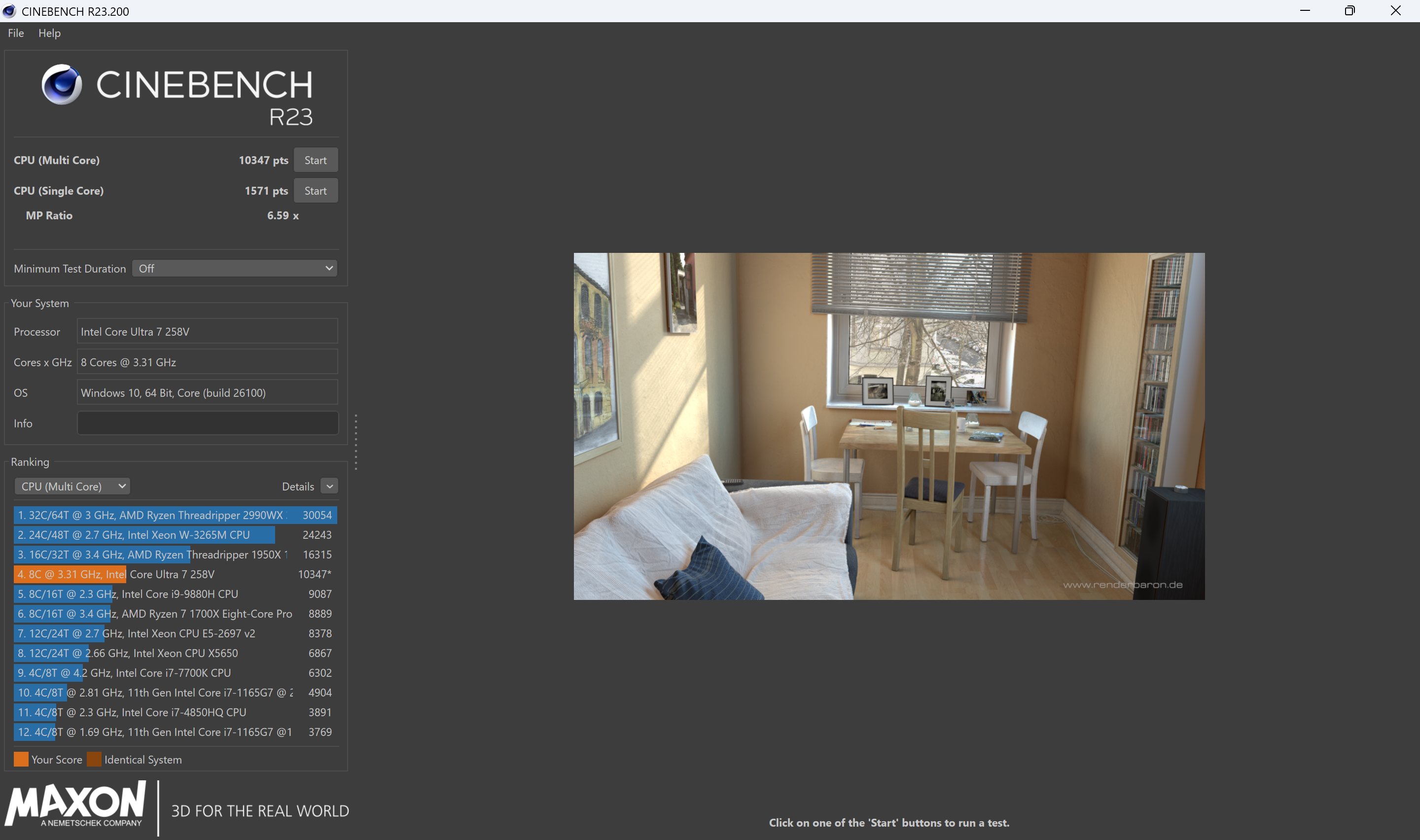 - Cinebench R23: 10347 pkt CPU Multi Core / 1571 CPU Single Core / MP Ratio 7,28x