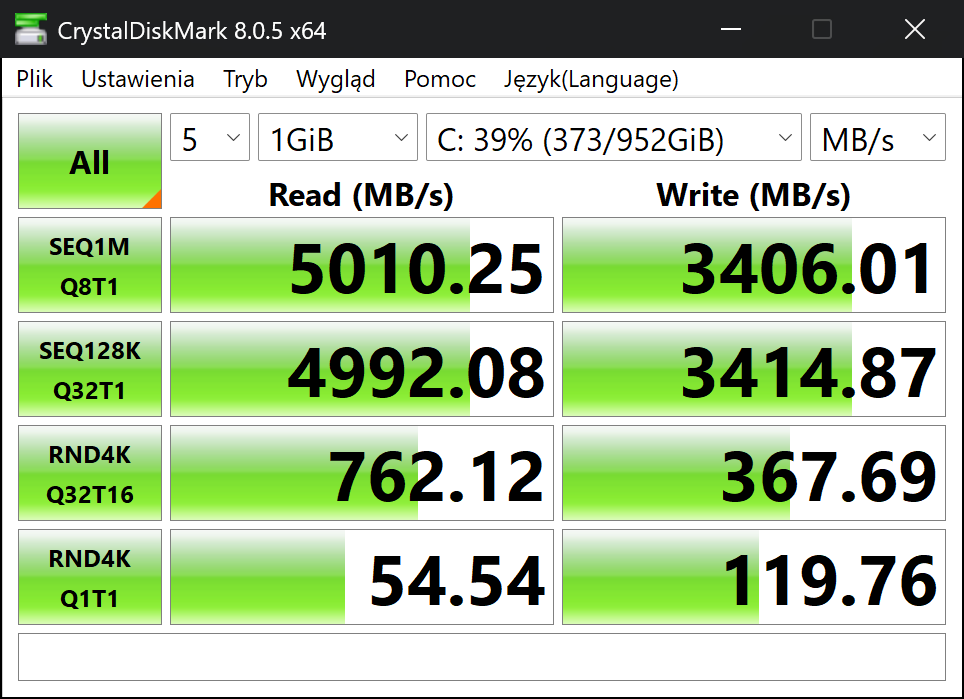- CrystalDiskMark: 5010 MB/s odczyt sekwencyjny / 3406 MB/s zapis sekwencyjny