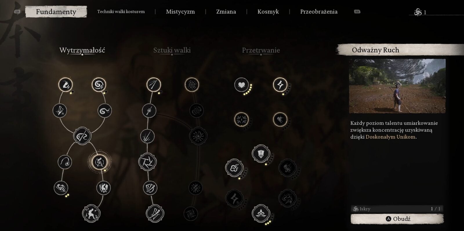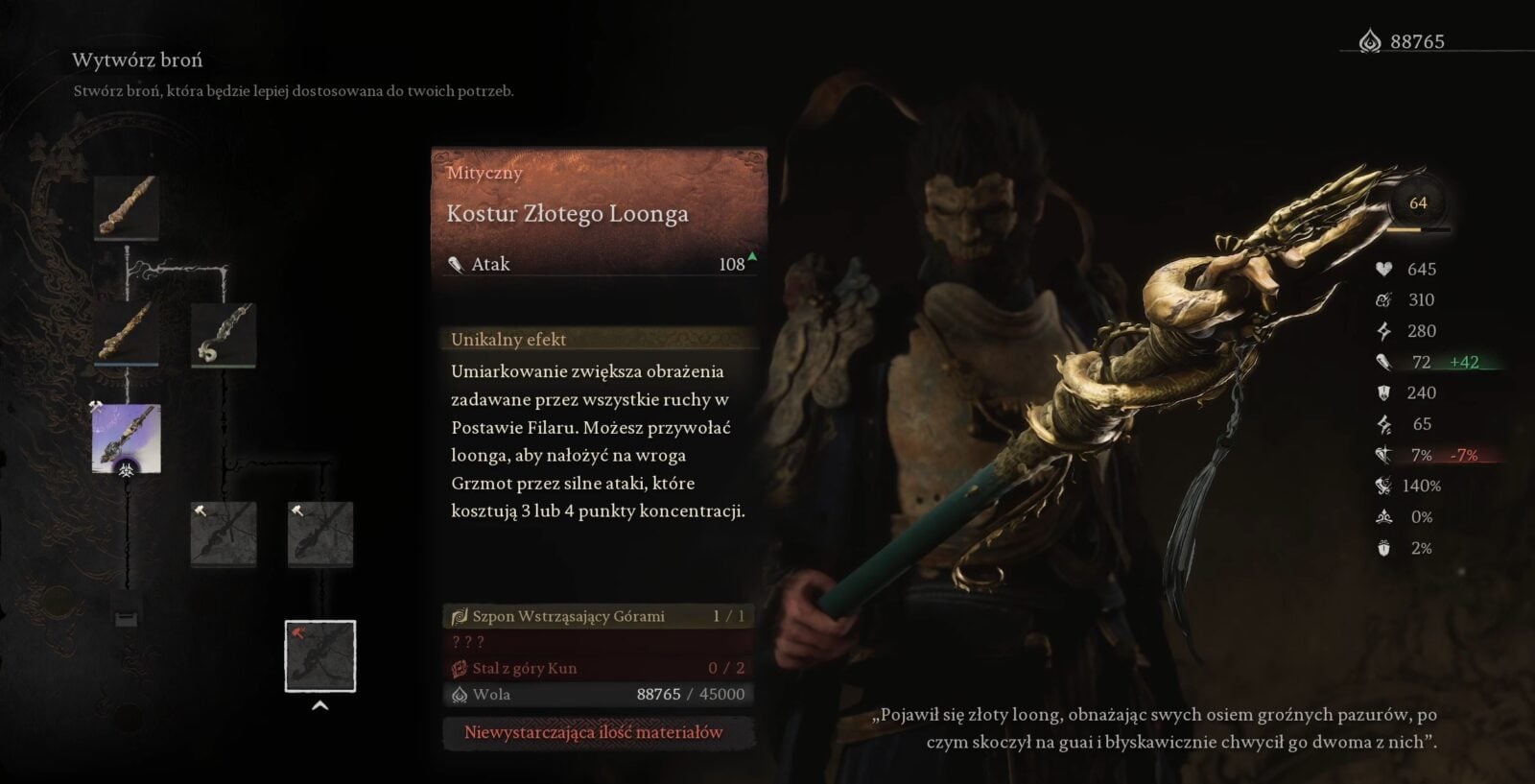 Tak naprawdę bardzo prosty schemat tworzenia nowych broni i zbroi, ale wcale nie oznacza to, że małpa z początku gry, dorównuje swoją złożonością małpie z końca. Zadbał o to system rozwoju z opcją resetowania wszystkich rozdanych punktów w dowolnym momencie, dzięki czemu możemy w prosty sposób testować inne sposoby walki, a nie musieć udawać się do pani Rennali, aby zresetować postać zużywalnym przedmiotem i następnie ulepszać nową broń cennymi surowcami. Innymi słowy, to kolejny hołd dla niedzielnego gracza i tak naprawdę poszanowanie naszego czasu, co ma też uzasadnienie w znacznie bardziej plastycznym systemie walki w Black Myth: Wukong. Tyczy się to nie tylko różnych postaw i tym samym ciosów, ale też zaklęć, a nawet przemiany w inne postaci z własnym poziomem życia w toku walki. Właśnie tak – gra w małpę może i nie ma dziesiątek broni, ale uważam, że zapewnia znacznie lepszą piaskownicę do zabawy samym tylko sposobem prowadzenia walki z wrogami.
