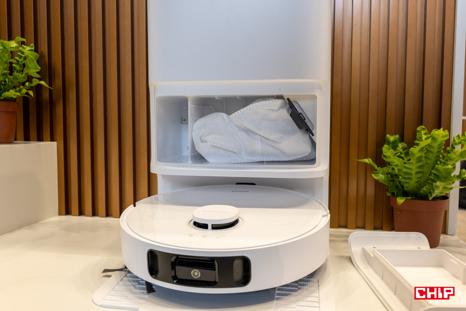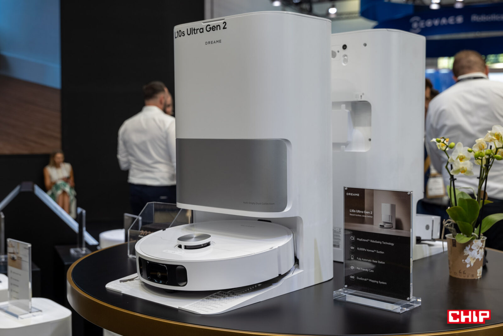 Nie samym sprzętem człowiek żyje, więc może co nieco o samych innowacjach, które Dreame sukcesywnie wprowadza do swoich produktów. Z myślą o robotach sprzątających powstało rozwiązanie o nazwie System ProLeap, które pozwala tym maszynom pokonywać progi na podłogach i niewielkie schody. Na stoisku w Berlinie wyglądało to bardzo sprawnie, a robot nie miał wielkiego trudu ze wspinaniem się na przeszkody i schodzeniem z nich na niższy poziom. Kolejny przełom stanowi nawigacja VersaLift. Funkcja sprawdza się w trudno dostępnych miejscach, np. pod meblami. Moduł skanujący może się schować w obudowie robota, dzięki czemu może on wjechać pod spód. Mało?