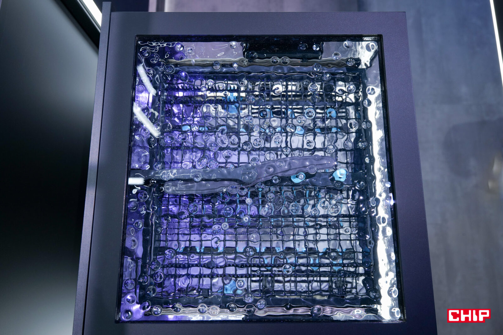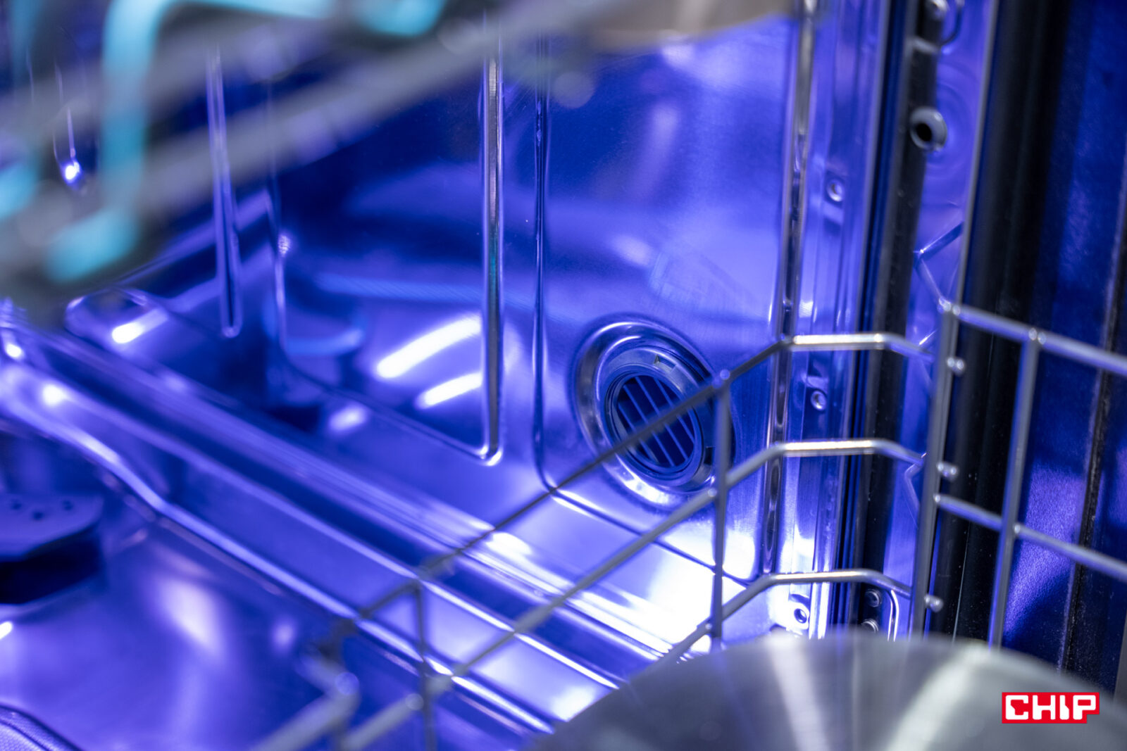 Zacznijmy od tego, że prezentowana w strefie zmywarka z przezroczystymi ścianami była trudna do uchwycenia przez aparat. To ze względu na jasność świateł, jakie znajdziemy w instalacji promującej zmywarki Haier I-Pro Shine. Badania wykonane przez firmę Eurofin pokazują, że udało się w ten sposób usunąć do 99,99% bakterii. Jednocześnie nie mamy tu do czynienia z promieniowaniem UV, choć kolor mógłby to sugerować. To jednak efekt odbijania się świateł od ścian zmywarki i postawienia na takie pasmo światła widzialnego, które przy okazji wygląda efektownie.