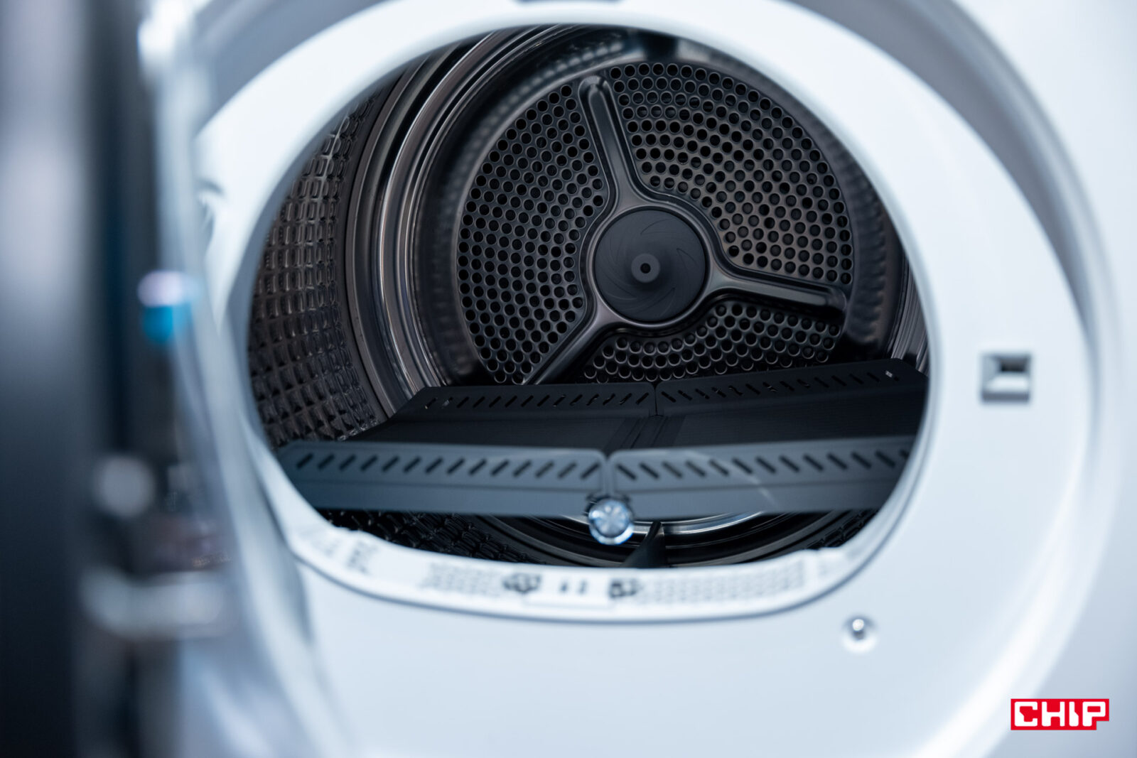 Oczywiście seria X11 to nie tylko pralka, ale i suszarka. Suszarka Haier X11 także osiąga najwyższy standard energooszczędności, czyli A+++, a do tego obniża średnie zużycie o 15% względem tej podstawy. Taki rezultat to kwestia nie tylko krótszych programów, ale i konstrukcji. Na miejscu zobaczyłem transparentną obudowę uwypuklającą projekt bębna Ultra Reverse Drum. Jego zmienny i obrotowy ruch nie pozwala ubraniom zatrzymać się w jednej pozycji, a powietrze odsuwa fragmenty ubrania od bębna. Oczywiście możemy też skorzystać z półki do suszenia dla butów bądź delikatnych ubrań. W nowej odsłonie ta półka jest składana, co ułatwia proces przechowywania.