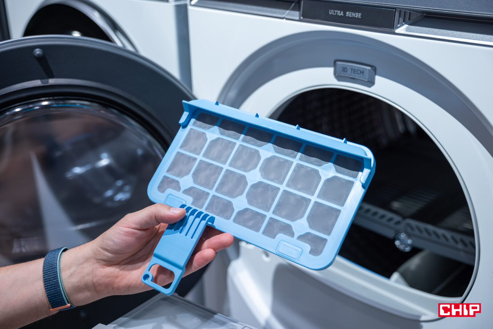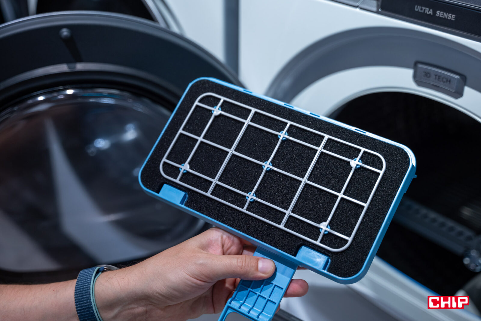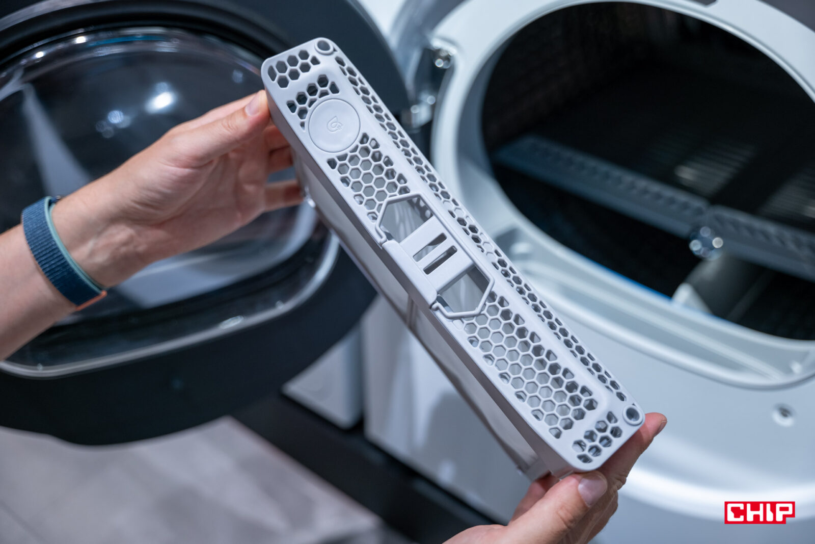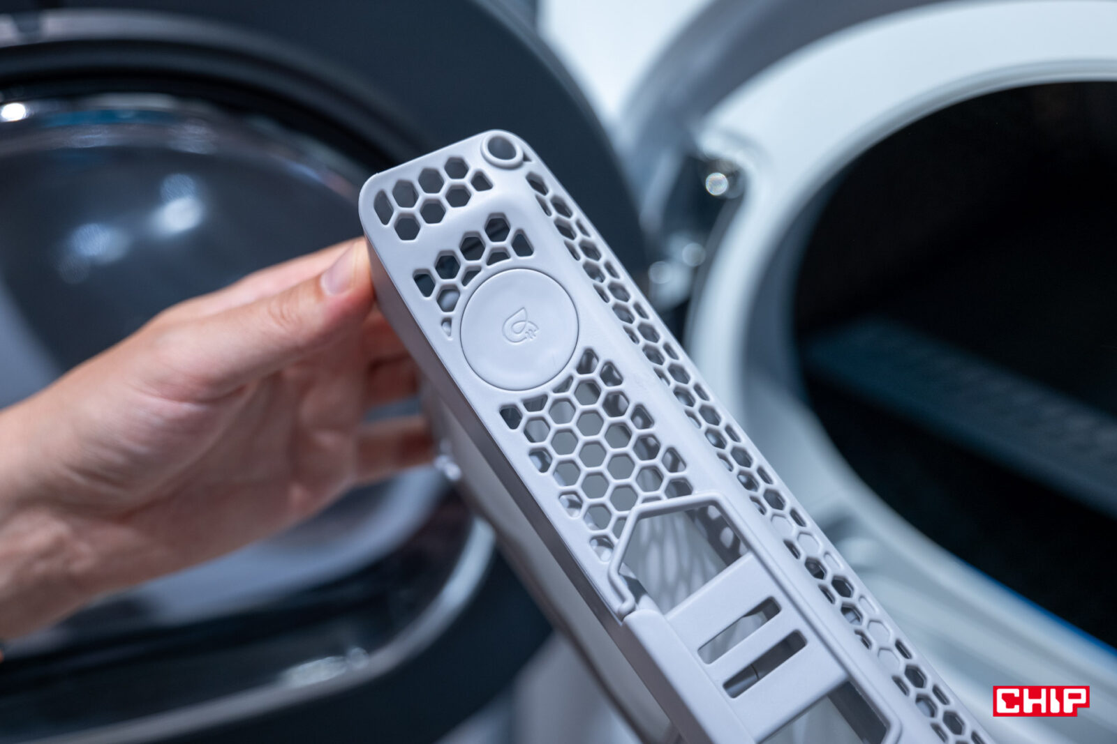 Z perspektywy eksploatacji cieszy mnie wielostopniowy system filtrów, który jest łatwy do wyczyszczenia. W przedniej części suszarki zastosowano system wielofiltrowy. Kratkę z bardzo drobną siatką umieszczamy bezpośrednio przy wlocie powietrza. Jednak by do niej sięgnąć, najpierw chwytamy za filtr gromadzący większe części materiału. Tam też znajduje się pojemnik na perfumy. Filtry oceniam, na pierwszy rzut oka, pozytywnie – wyglądają, jakby ich eksploatacja i czyszczenie były proste.