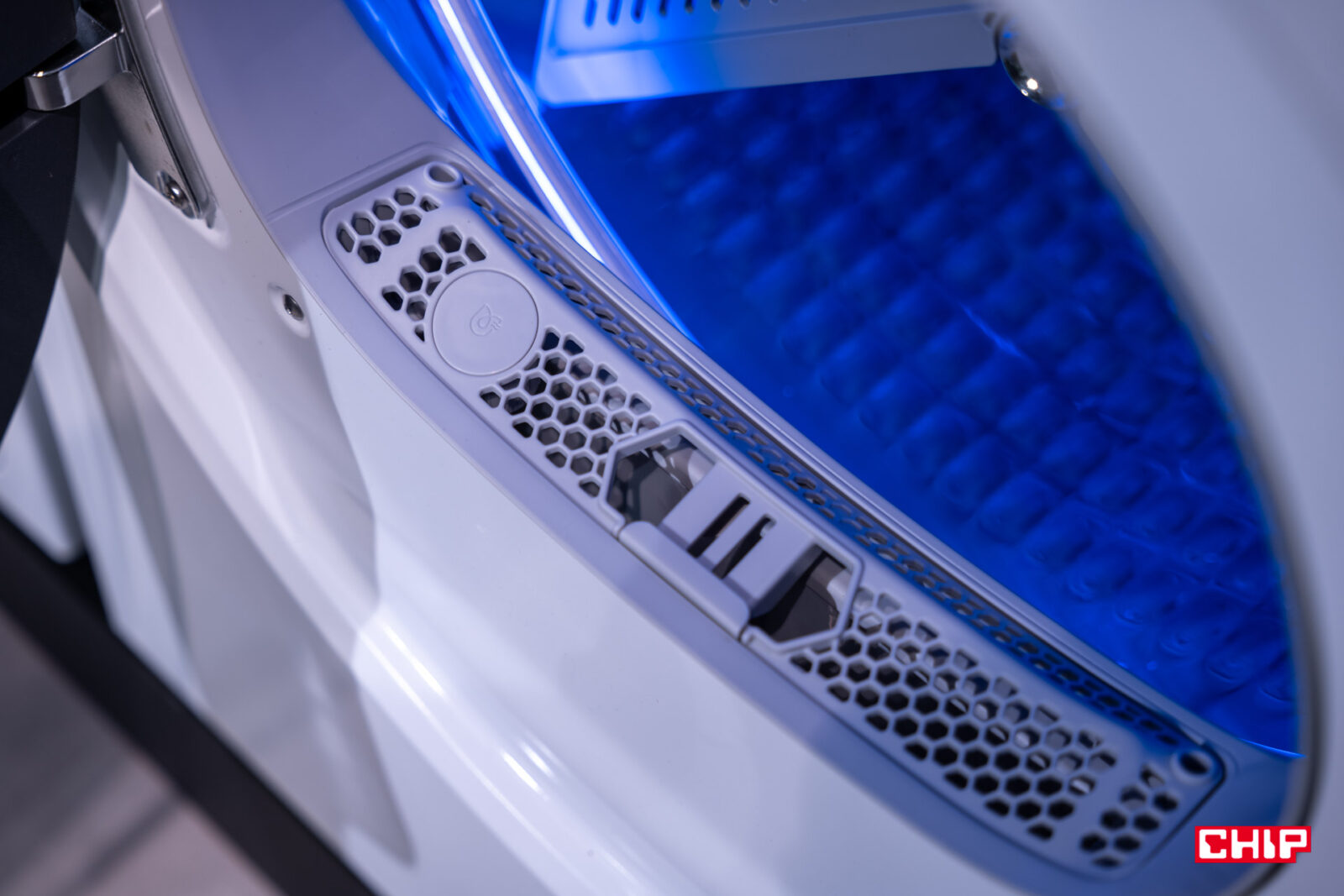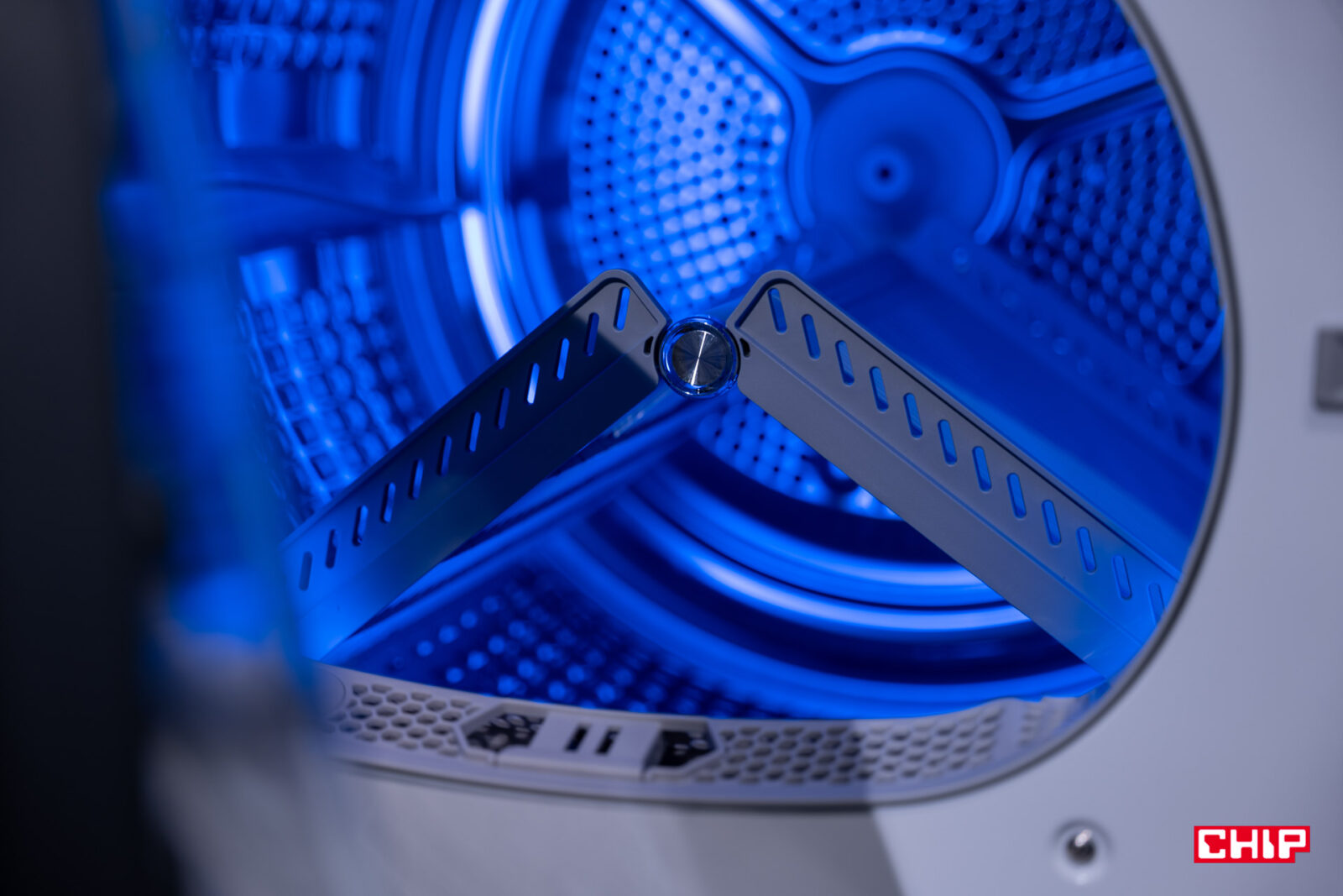 Dla suszarki z serii X7 przygotowano jeszcze inne rozwiązanie. Początkowo myślałem, że niebieskie światło służy przede wszystkim przyciągnięciu uwagi. O ile po części jest to prawdą, tak samo światło to tak naprawdę część modułu plazmowego I-Refresh Active. Powietrze wewnątrz bębna zostaje najonizowane – z atomami zderzają się protony i wybijają w ten sposób kationy, które są w stanie pochłaniać nieprzyjemne zapachy. Rozwiązanie znane z oczyszczaczy powietrza jak najbardziej może sprawdzić się w suszarce. Dzięki rozwiązaniu I-Time dopasujemy też czas trwania poszczególnych programów, tak by zdążyć na czas ze wszystkim.