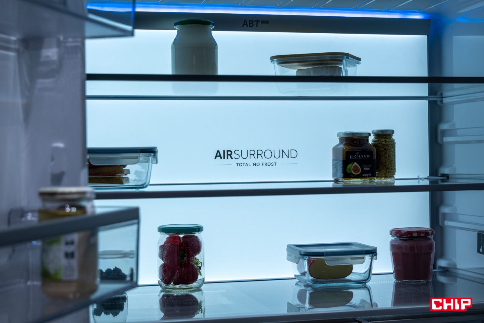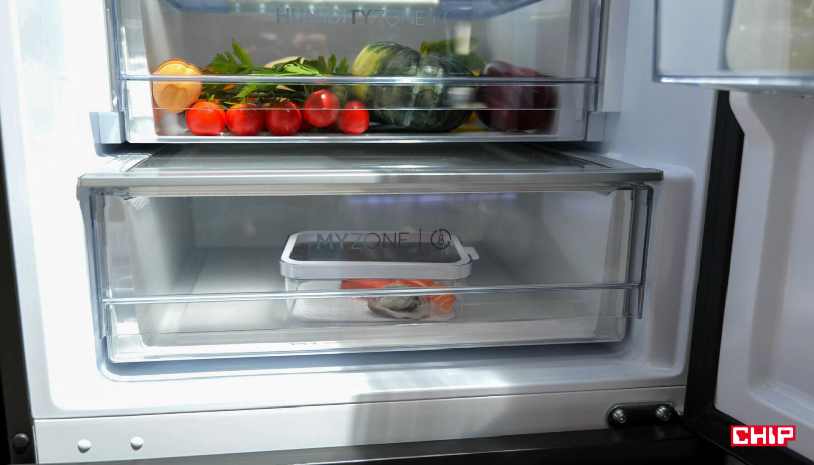 Pod szufladą Humidity Zone mieści się druga szuflada My Zone. Jej zadaniem jest Jej zadaniem jest stworzyć idealne warunki dla bardziej delikatnych produktów, jak mięsa czy ryby. Co ciekawe, z pomocą aplikacji, jak i panelu na lodówce zmienimy możemy zmienić temperaturę w zakresie od 0 do 5 stopni. Do tego w całej lodówce pracuje przepływ powietrza Air Surround. Dzięki czystszemu powietrzu dłużej zachowujemy świeżość jedzenia.