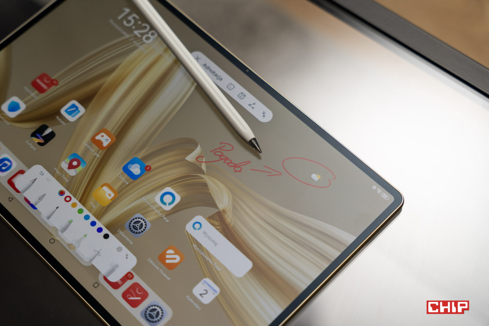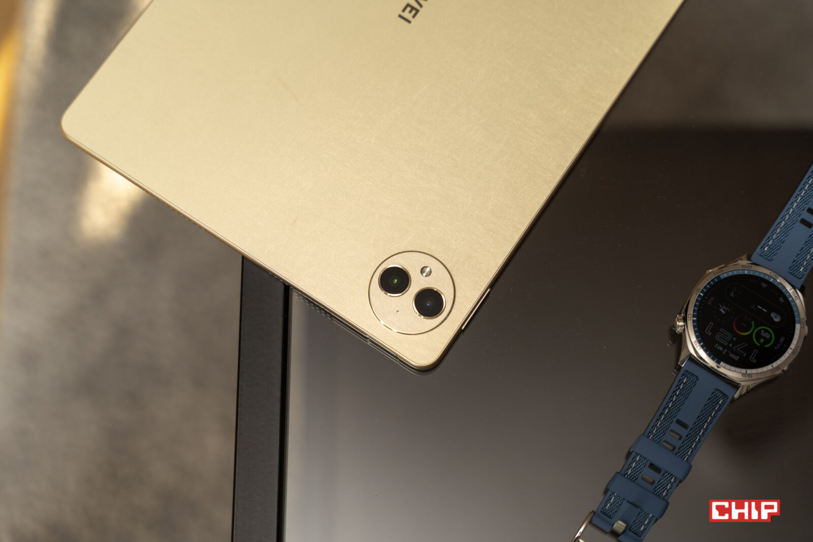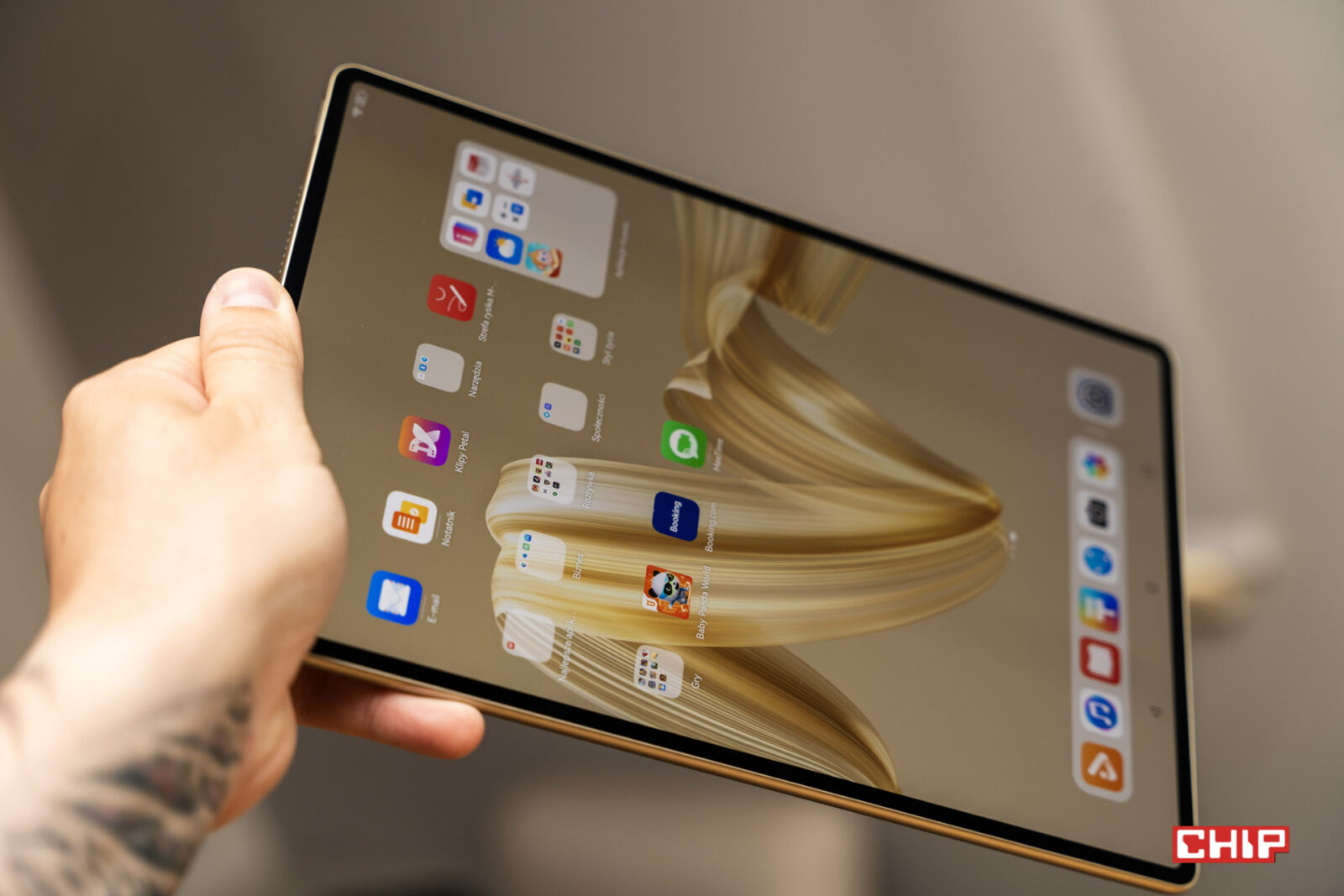 No a co w środku? Tablet jest zasilany przez baterię o pojemności 10 100 mAh, co pozwala na nawet 13 godzin odtwarzania wideo, oraz szybkie ładowanie dzięki technologii 100W SuperCharge, która pozwala naładować urządzenie w pełni w mniej niż godzinę, dokładnie w 55 minut. Do tego mamy tutaj 12 GB pamięci RAM i 512 GB miejsca na dane. Jeśli chodzi o audio, to Huawei zadbał o customowe głośniki z 8 przetwornikami i mikserem audio wspieranym przez AI. W kwestii aparatów, znajdziemy tutaj Smart Sensing Camera z przodu i 13 MP + 8 MP na pleckach.