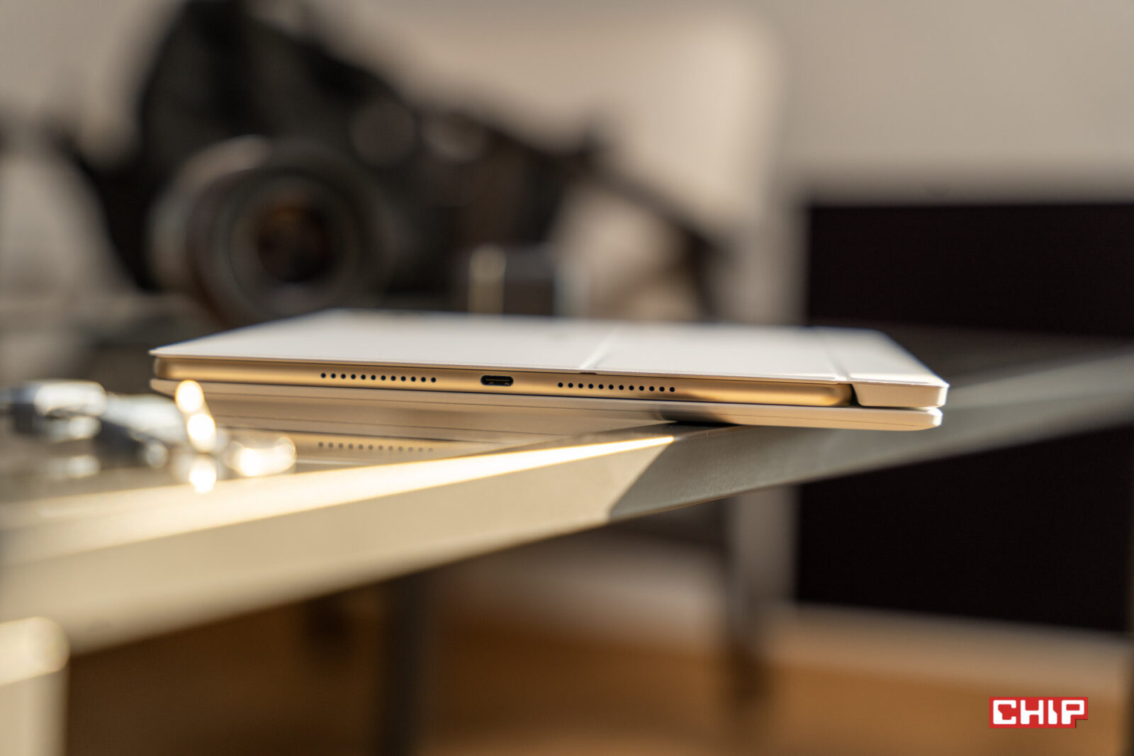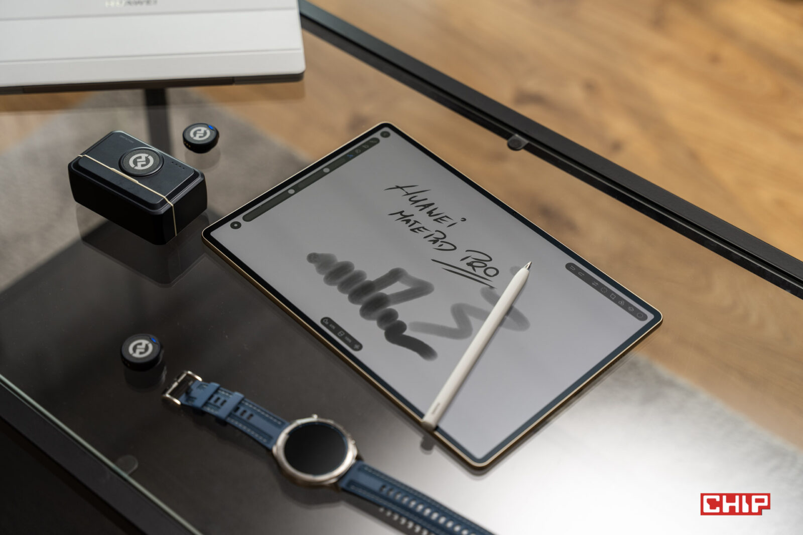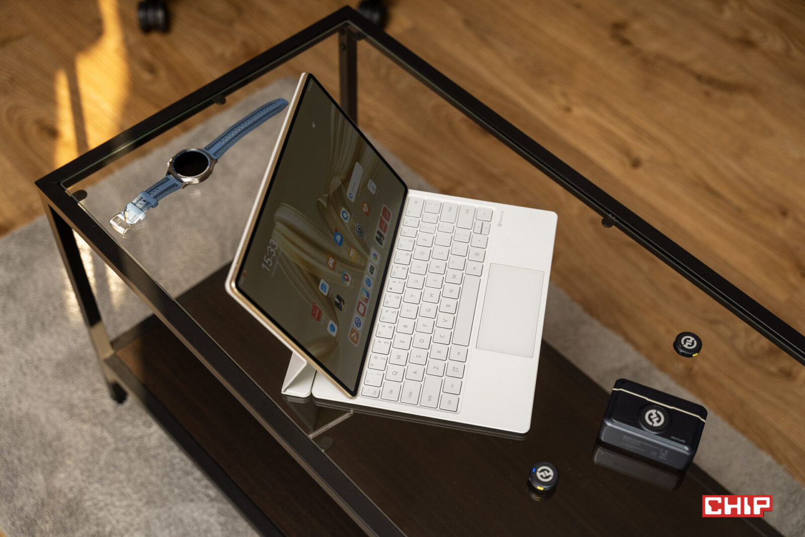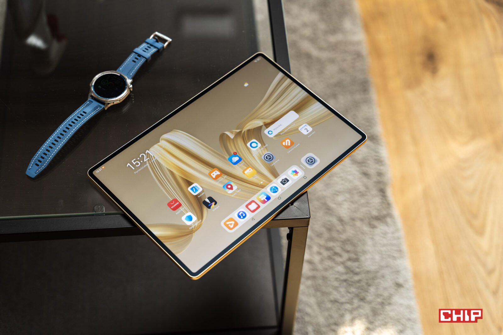 No a co w środku? Tablet jest zasilany przez baterię o pojemności 10 100 mAh, co pozwala na nawet 13 godzin odtwarzania wideo, oraz szybkie ładowanie dzięki technologii 100W SuperCharge, która pozwala naładować urządzenie w pełni w mniej niż godzinę, dokładnie w 55 minut. Do tego mamy tutaj 12 GB pamięci RAM i 512 GB miejsca na dane. Jeśli chodzi o audio, to Huawei zadbał o customowe głośniki z 8 przetwornikami i mikserem audio wspieranym przez AI. W kwestii aparatów, znajdziemy tutaj Smart Sensing Camera z przodu i 13 MP + 8 MP na pleckach.