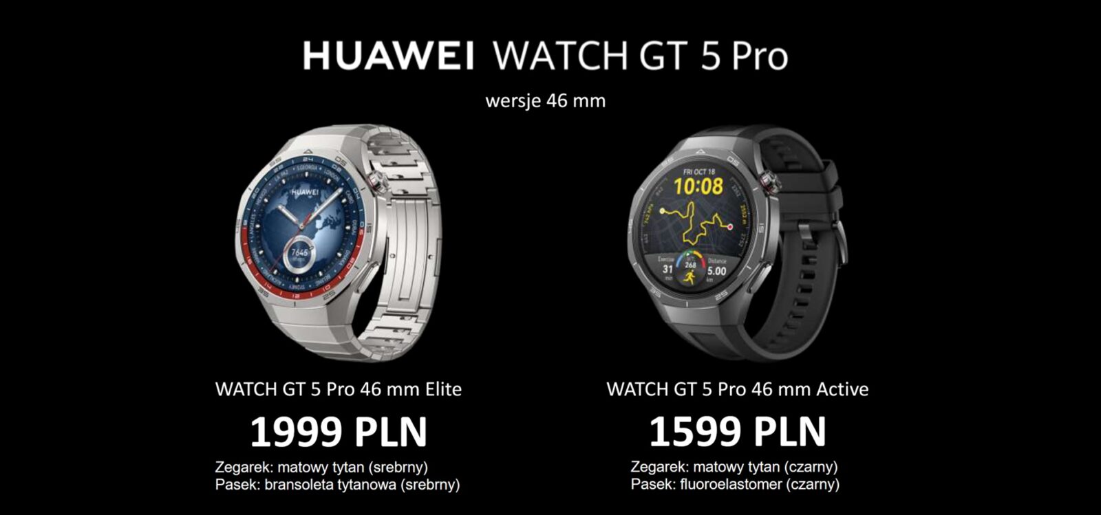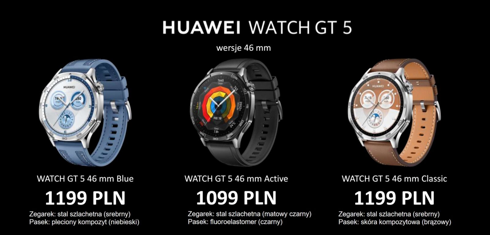 Stawkę zamykają dwa modele Watch GT 5 Pro z kopertą o średnicy 46 mm w cenie 1 599 zł i 1 999 zł: