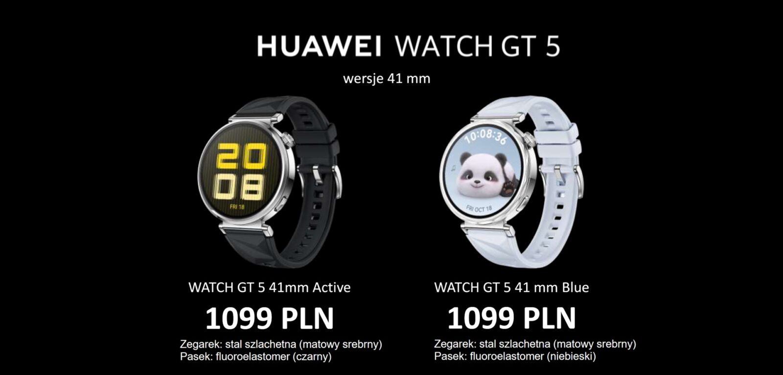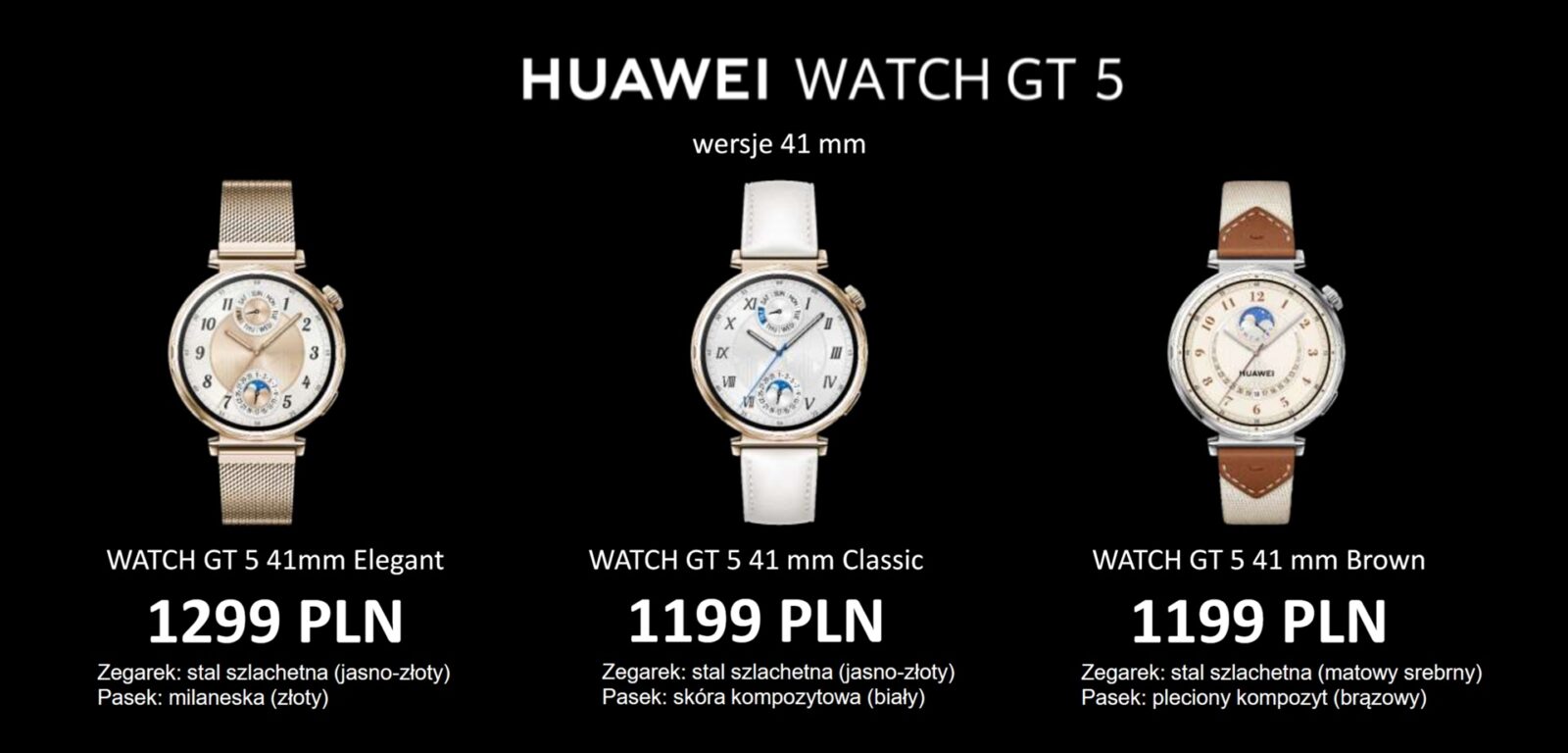 Różne materiały wykonania, kolory, rozmiary, ceny… Spróbujmy to sobie uporządkować. Seria Huawei Watch GT 5 rozpoczynają dwa modele uniwersalne z kopertą o średnicy 41 mm w cenie 1 099 zł: