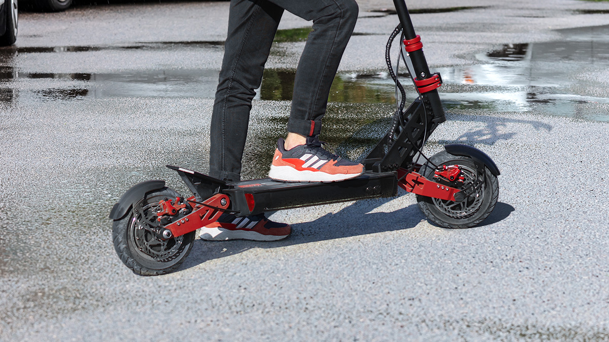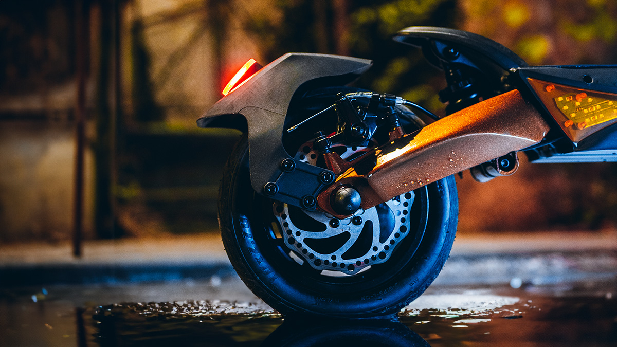 Ten sportowy model robi użytek z dwóch silników o łącznej mocy nominalnej na poziomie 2000 watów i szczytowej rzędu 2,6 kW. Zasila je 950-Wh akumulator, gwarantujący zasięg do 65 km na jednym ładowaniu, więc wydajności tej hulajnodze ewidentnie nie brakuje, co potwierdza maksymalna prędkość na poziomie 66 km/h i możliwość rozpędzenia się do 24 km/h w ledwie 3 sekundy.