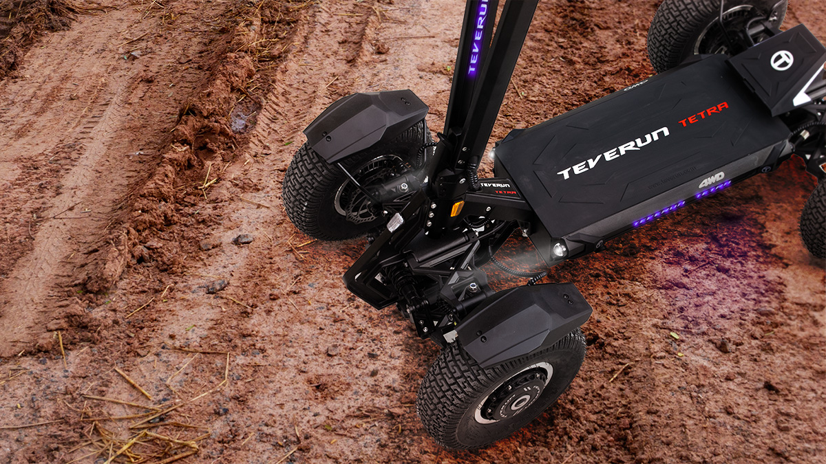Użytkownicy poszukujący szczególnych wrażeń i bezproblemowej jazdy w szczególnie wymagających środowiskach, powinni zainteresować się Teverun Tetra, czyli hulajnogą terenową, która po rozłożeniu zajmuje przestrzeń aż 118 × 126 × 65 cm. Cechuje się odpornością IPX6 i wygląda tak, jak dwie połączone ze sobą tradycyjne hulajnogi terenowe, ale jej możliwości są znacznie większe. Wprawieniem w ruch tej bestii zajmuje się zestaw czterech silników o nominalnej łącznej mocy rzędu 6000 watów i maksymalnej na poziomie 9900 watów.