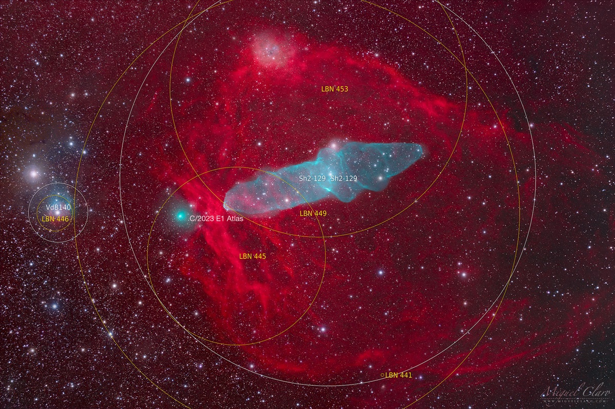 Przytoczone zależności już na tym etapie mogą wydać się skomplikowane, a żeby nie było zbyt łatwo do tej układanki trzeba dodać jeszcze jeden element. Jest nim kometa C/2023 E1 (ATLAS). Widzimy więc Nietoperza o średnicy wynoszącej około 270 lat świetlnych oraz zlokalizowaną w pobliżu Kałamarnicę, której średnica to około 50 lat świetlnych. Na tle tego niecodziennego, ale z pewnością efektownego duetu znajduje się wspomniana kometa.