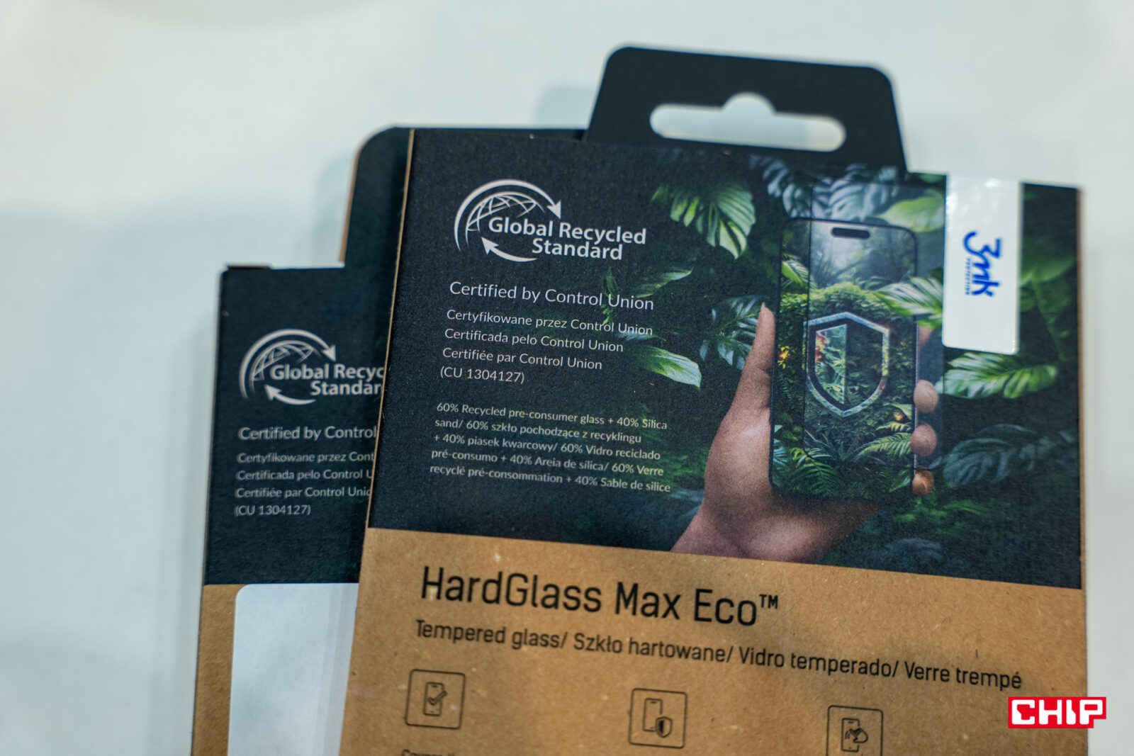 Propozycją dla bardziej wymagających i aktywnych będzie z kolei 3mk HardGlass Max Eco™, czyli hartowane szkło wykonane w 60% z materiałów pochodzących z recyklingu (tu również mamy certyfikat GRS). Produkt charakteryzuje się najwyższym poziomem twardości 9H (jego hartowanie odbywa się w temperaturze 420 stopni Celsjusza). W konstrukcji zastosowano dodatkową powłokę oleofobową, która daje lepsze właściwości dotykowe i zwiększony poślizg palca. To nie jedyne zalety tego rozwiązania, bo ze względu na swoją gładkość wspomniana powłoka ułatwia utrzymanie wyświetlacza w czystości.