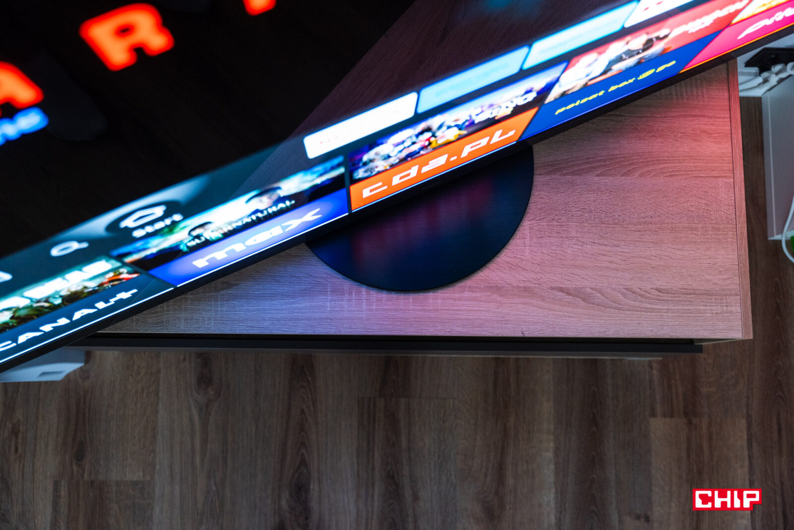 Kończąc temat konstrukcji został jeden ważny bonus i jest nim podstawa, która pozwala na obracanie ekranu. Genialna sprawa, bo jeśli dla przykładu nie mamy możliwości ustawienia telewizora centralnie przed kanapą to wystarczy go lekko obrócić i problem rozwiązany. Nie ma tu żadnego zdalnego sterowania, obracania pilotem i podobnych wymysłów – zwyczajnie ręką przekręcamy obudowę.