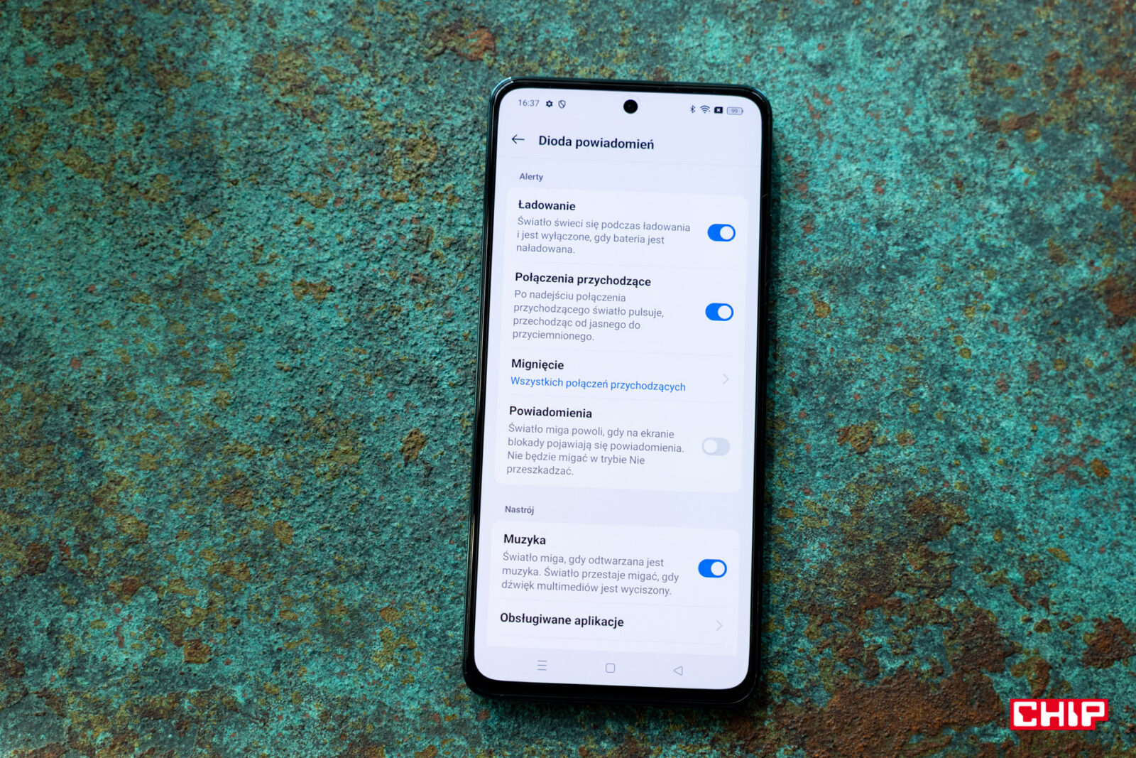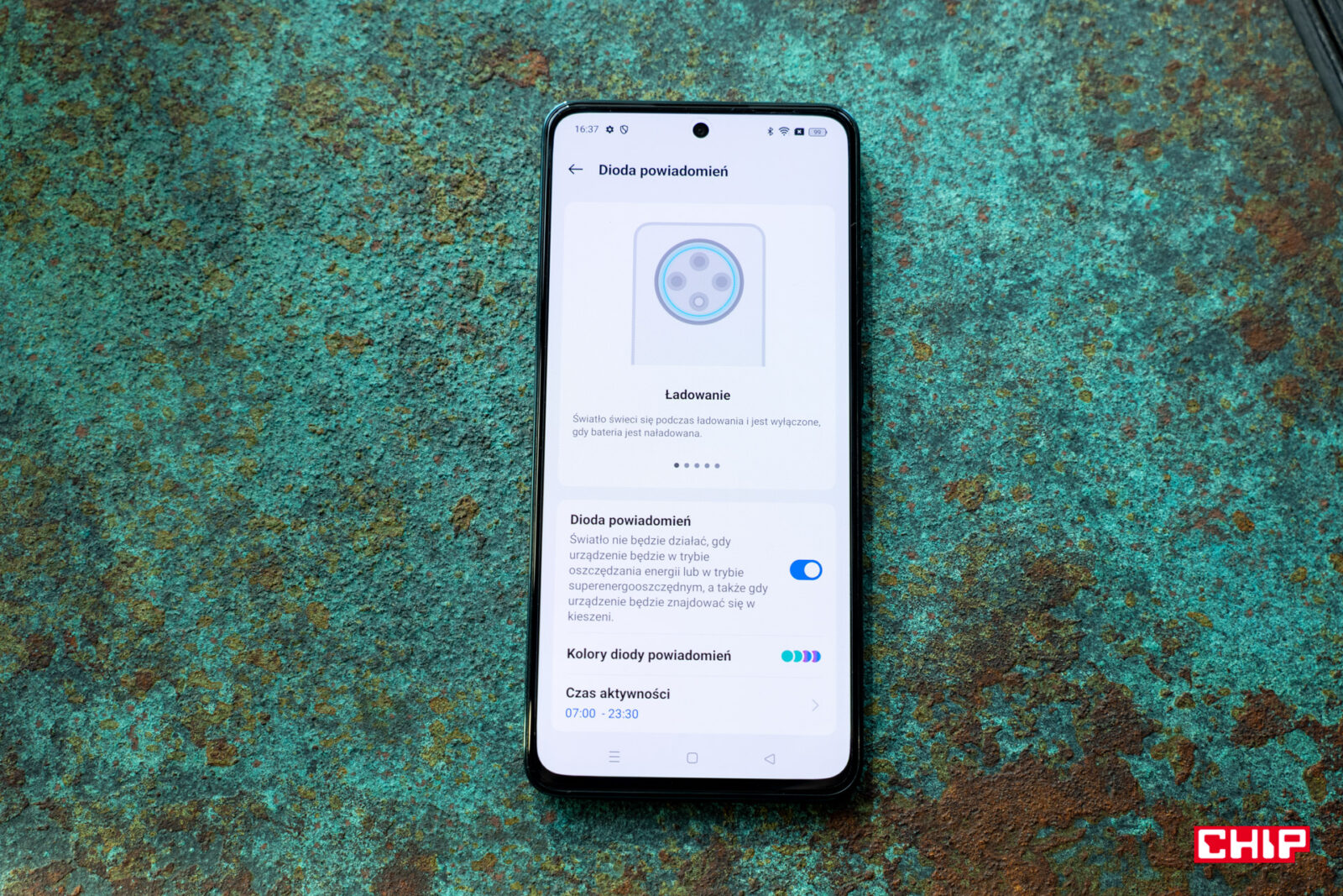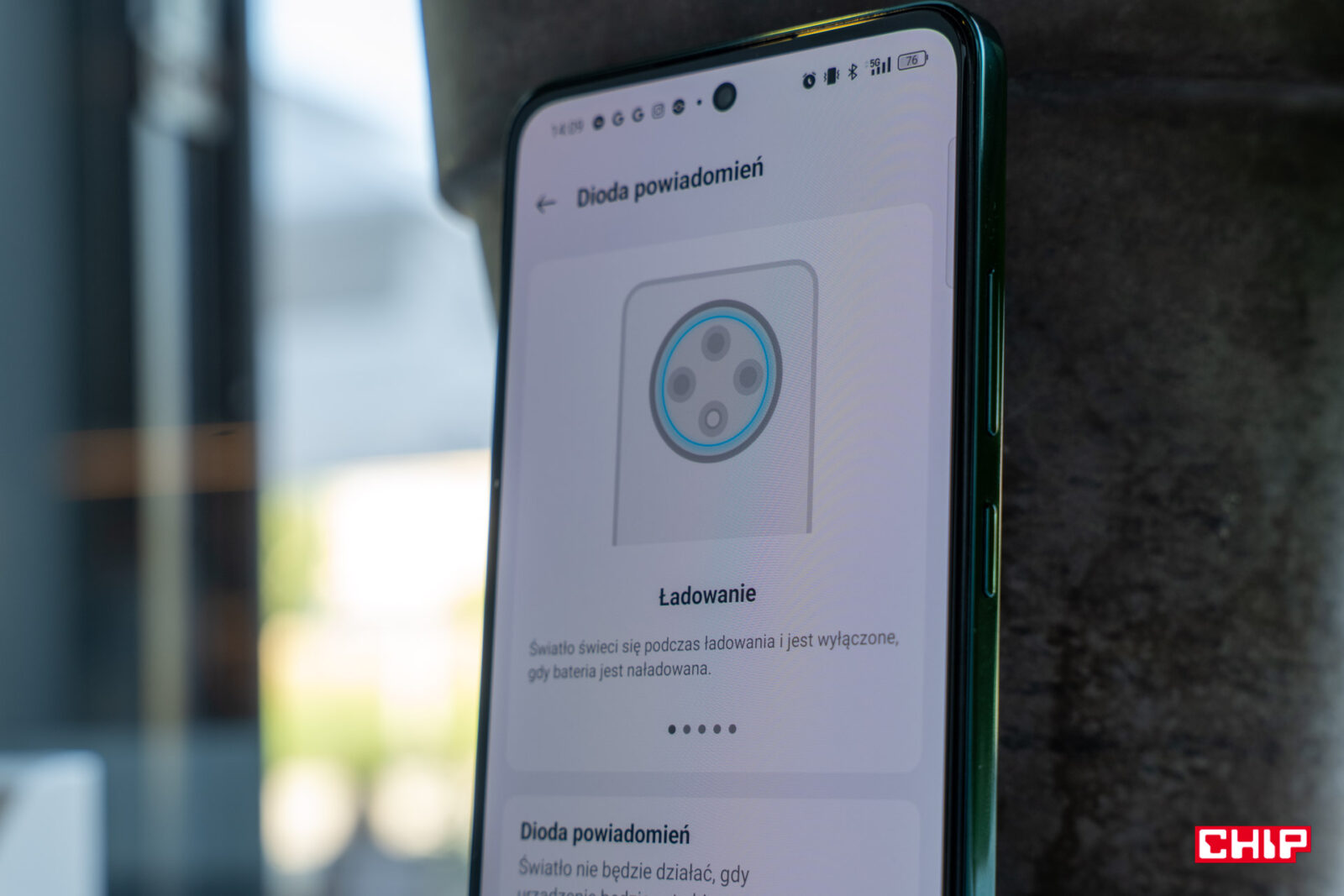 Wyróżnikiem Oppo Reno 12 FS 5G jest okręg diod okalających aparat. Może się podświetlać zarówno przy ładowaniu, słuchaniu muzyki czy graniu, ale przede wszystkim pozwala na sygnalizowanie powiadomień. Nie możemy mu przypisać konkretnego oświetlenia dla konkretnej aplikacji, ale możemy ustawić te aplikacje, przy których powiadomieniach całość będzie się podświetlała. Nie mamy też do wyboru pełnej palety barw, a jedynie różne zestawy kolorów czy gradientów dla konkretnych funkcji. Moim głównym problemem jest jednak zbyt niska jasność. Rozumiem, że zapewne miało to być subtelne rozwiązanie, ale przy tak wąskim pierścieniu jest zdecydowanie zbyt subtelnie, by poza ciemnymi pomieszczeniami dało to jakiś efekt.