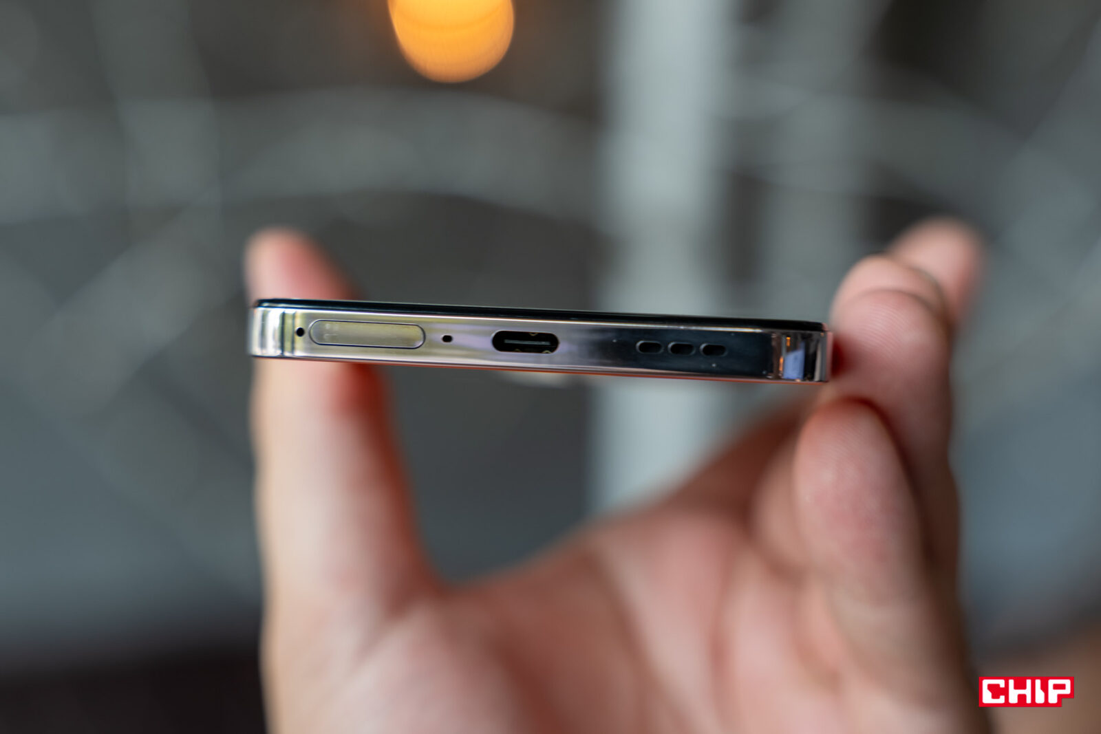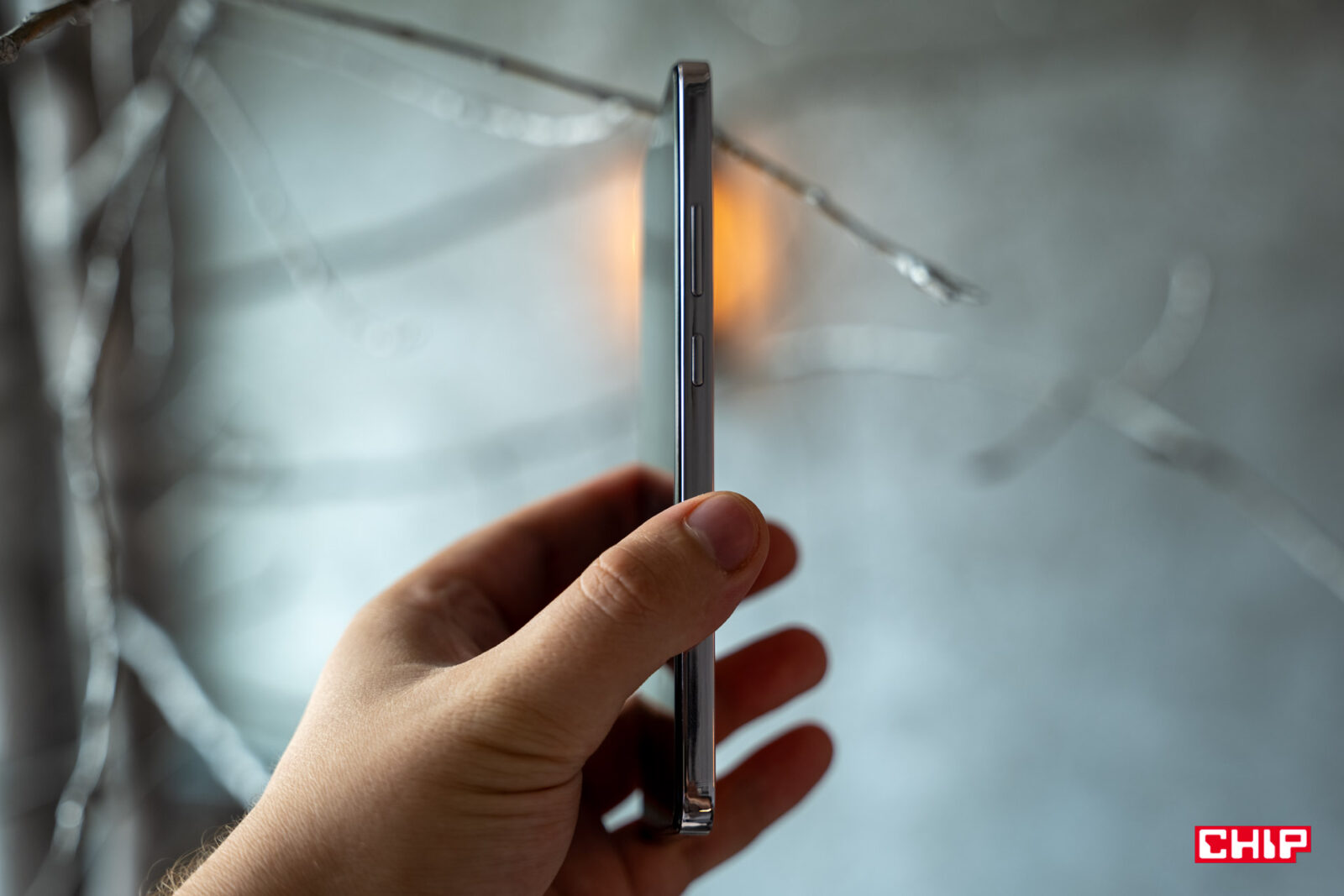 Nie rozumiem, czemu producenci tak uparcie stawiają na kanciaste boki obudowy, ale Oppo Reno 12 FS jest kolejnym z takich smartfonów. Przy tym, że jest to stosunkowo szeroki smartfon (75,8 mm szerokości), nie ułatwia to wcale pewnego chwytania. Z kolei masa na poziomie 187 gramów to przeciętny rezultat, ale smartfon nie wydaje się za ciężki i przede wszystkim – jest dobrze wyważony. Przyciski znajdują się wyłącznie po prawej stronie i umieszczono je na typowej wysokości, więc raczej nikt nie powinien mieć problemów z ich dosięgnięciem. Do skorzystania z nich potrzeba nieco większego nacisku niż średnia, ale za to niemal nie przemieszczają się na boki. U dołu zmieszczono port USB-C, maskownicę głośnika oraz slot hybrydowy z opcją wsadzenia karty Micro SD. W efekcie na lewej ścianie nie znajdziemy nic, ale przez to dobrze widać odciski palców i ta część telefonu wyraźnie się brudzi.