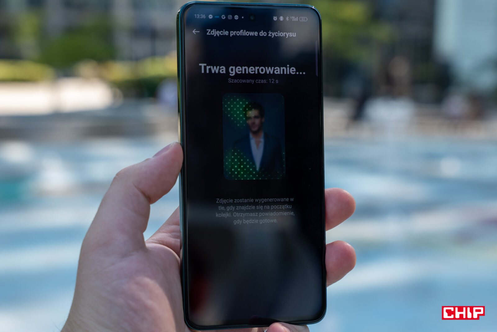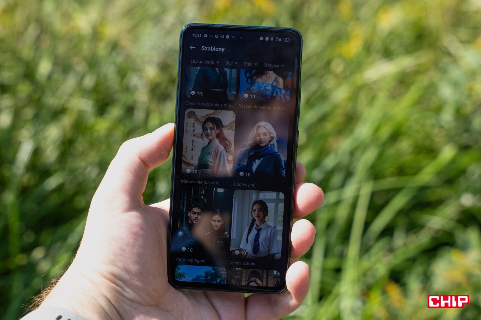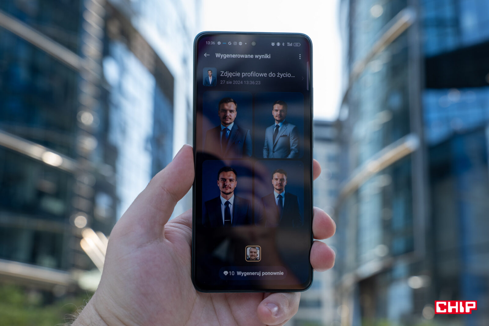 Inne rozwiązanie od Oppo to Oppo AI Studio, w którym możemy wsadzić naszą twarz w różne scenariusze. Przykładowo bez wskakiwania na garnitur przez studio fotograficzne możemy zrobić sobie coś na wzór zdjęcia w garniturze, które mogłoby posłużyć do CV lub jako profilowe na portalu biznesowym. Sęk w tym, że zarówno sama jakość efektu, jak i sceny, w jakich się umieszczamy, dają efekt raczej komiczny i bliższy obrazkowi. To nie jest narzędzie do dopasowania twarzy do rzeczywistego zdjęcia, a raczej zabawka. Za każdy przetworzony obrazek na zewnętrzne serwery) płacimy żetonami w ilości 10 lub 20 za wykorzystanie jednej lub dwóch twarzy. Na samym początku mamy aż 5000 żetonów, więc tworzeniu obrazków długo nie będzie końca. Na razie AI w Oppo to głównie zabawki.