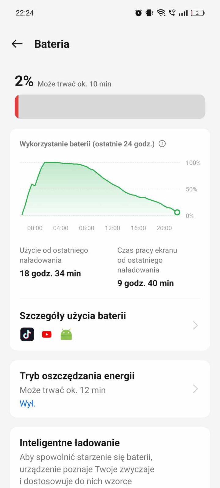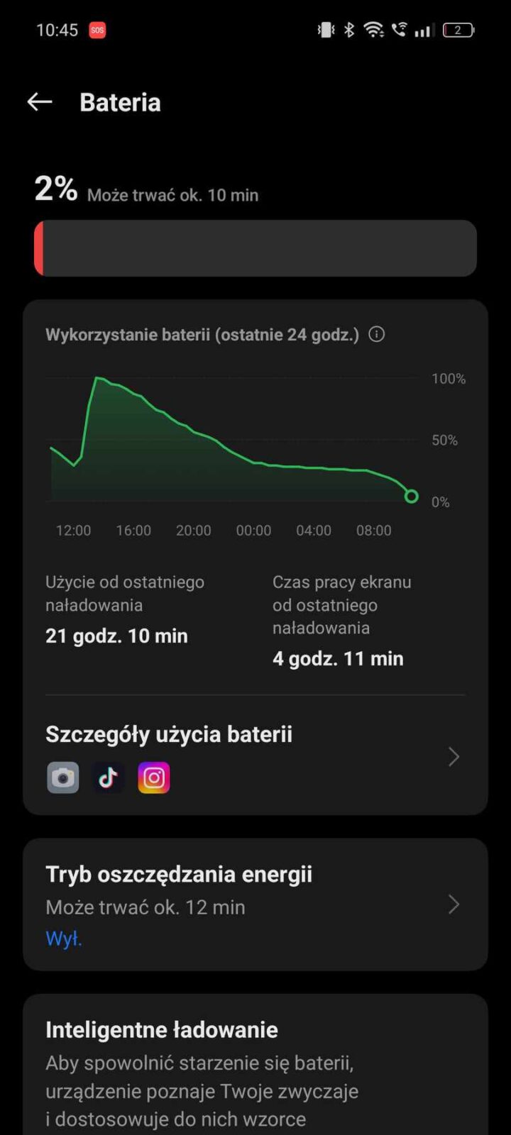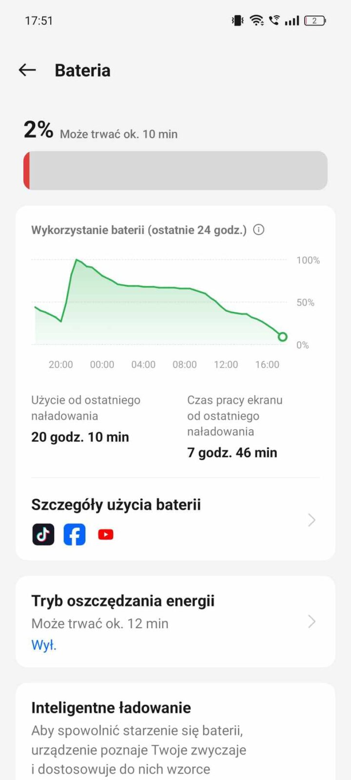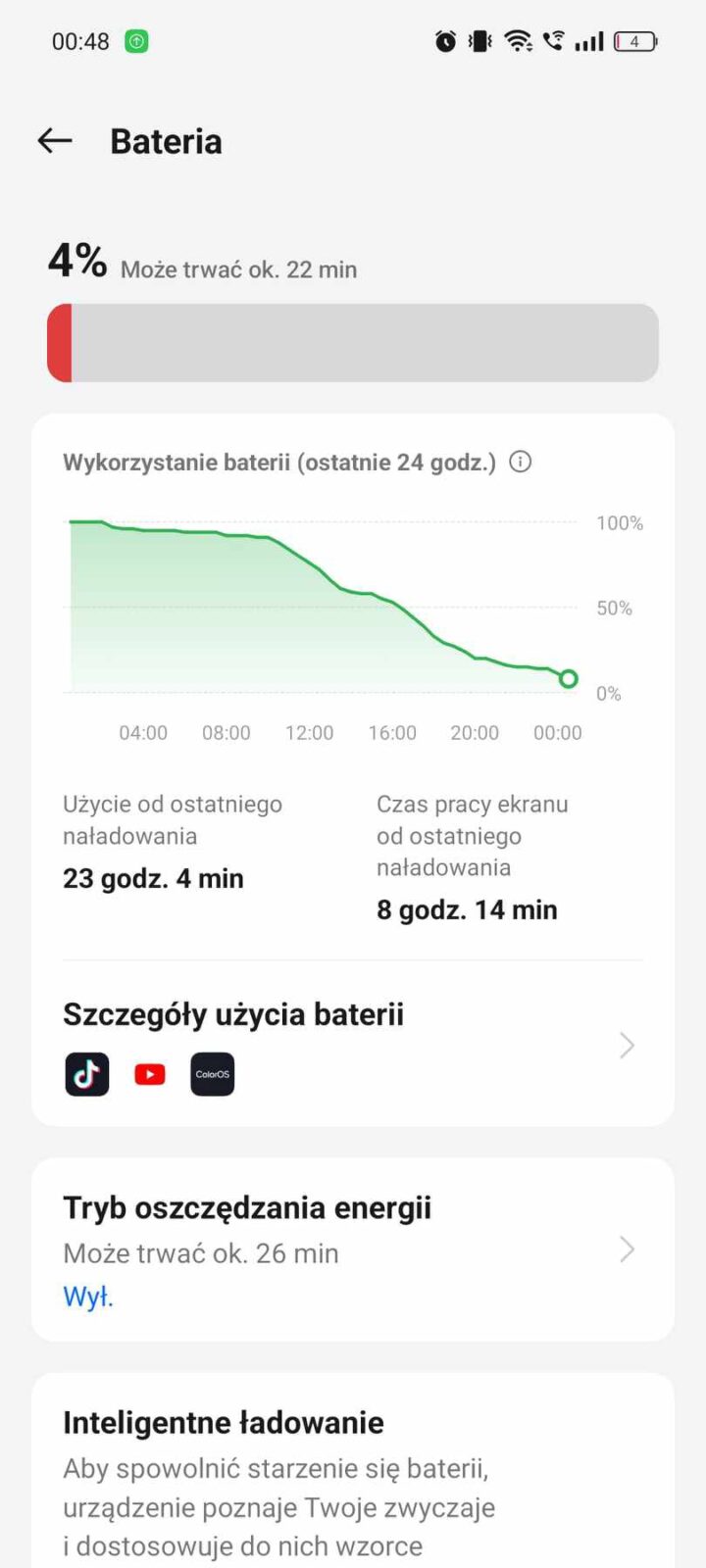 Czasy pracy na jednym ładowaniu są dość zadowalające, co nie dziwi przy braku obciążenia i sporej wydajności. Smartfon potrafi wytrzymać 1,5 a nawet 2 dni na jednym ładowaniu, jeśli nie obciążacie go mediami społecznościowymi i wyłączacie internet oraz Bluetooth. W innych przypadkach energii wystarczy wam na dzień z oglądaniem filmów, słuchaniem muzyki, odpalaniem Instagrama i TikToka oraz wykonaniem kilku połączeń i pisaniu sporej ilości wiadomości. Możecie zatem wyposażyć stereotypowego nastolatka w ten smartfon i powinien on osiągnąć 5,5 do 6 godzin z aktywnym ekranem przed kompletnym rozładowaniem. Na zrzutach ekranu widzicie dość rozbieżne czasy pracy – te najdłuższe dotyczyły okresów, gdy telefon głównie odtwarzał wideo z Youtube.