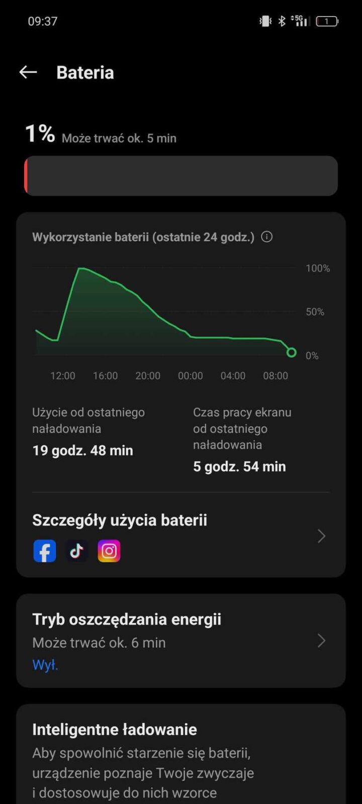 Oppo, podobnie jak niemal każdy producent taniego smartfonu, umieściło w Reno 12 FS 5G akumulator o pojemności 5000 mAh. Ten schemat znamy od lat, podobnie jak to, że producent implementuje szybkie, 67-watowe ładowanie w wielu urządzeniach… z tym że tym razem jest inaczej. Oppo Reno 12 FS 5G naładujemy z mocą 45W. W efekcie do pełnego naładowania potrzebowałem około 75 minut, a po kwadransie widziałem około 30% napełnienia akumulatora. Wszystko to ładowarką od Oppo, ale dostarczoną inną drogą – w pudełku nie znajdziemy niczego poza kablem.